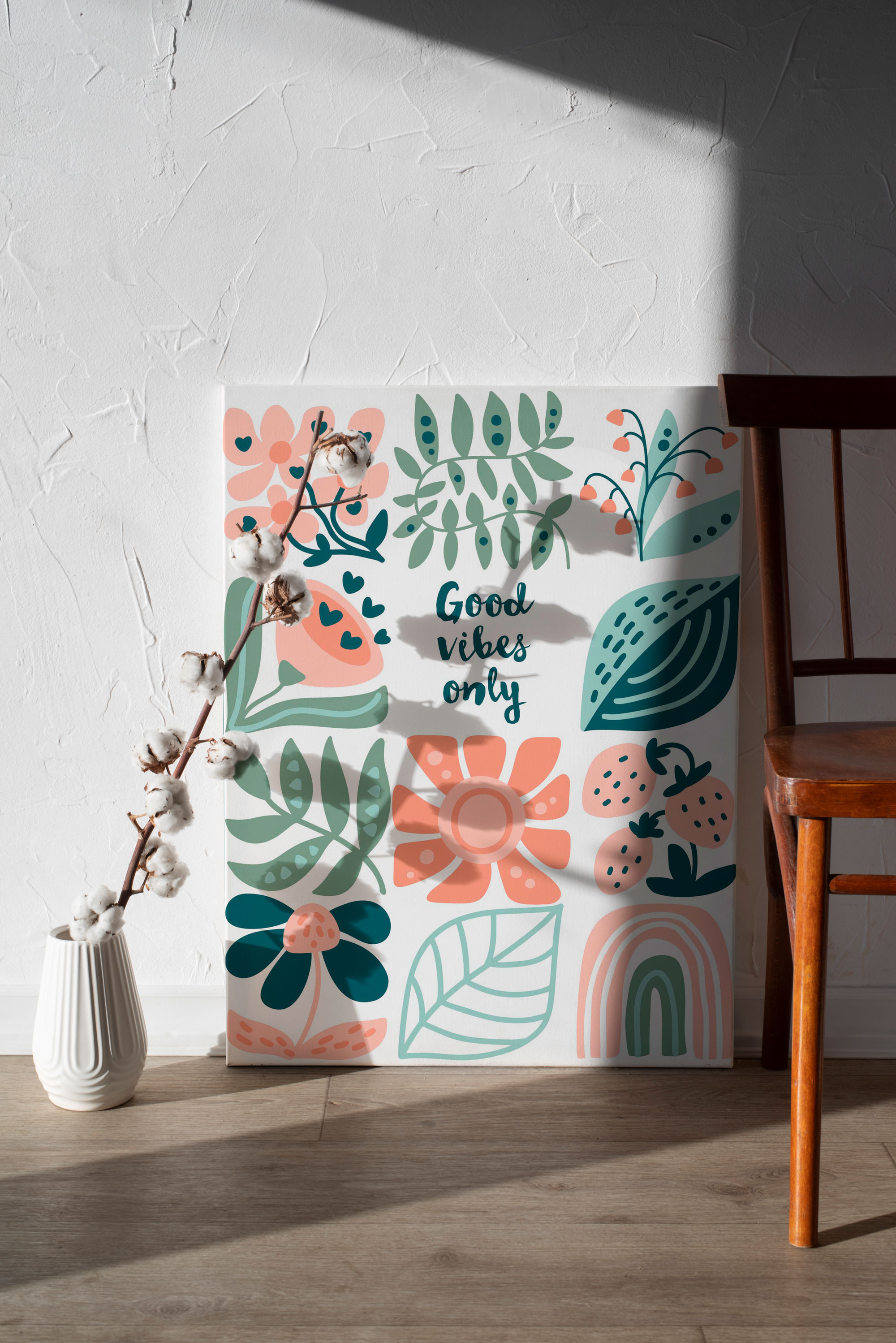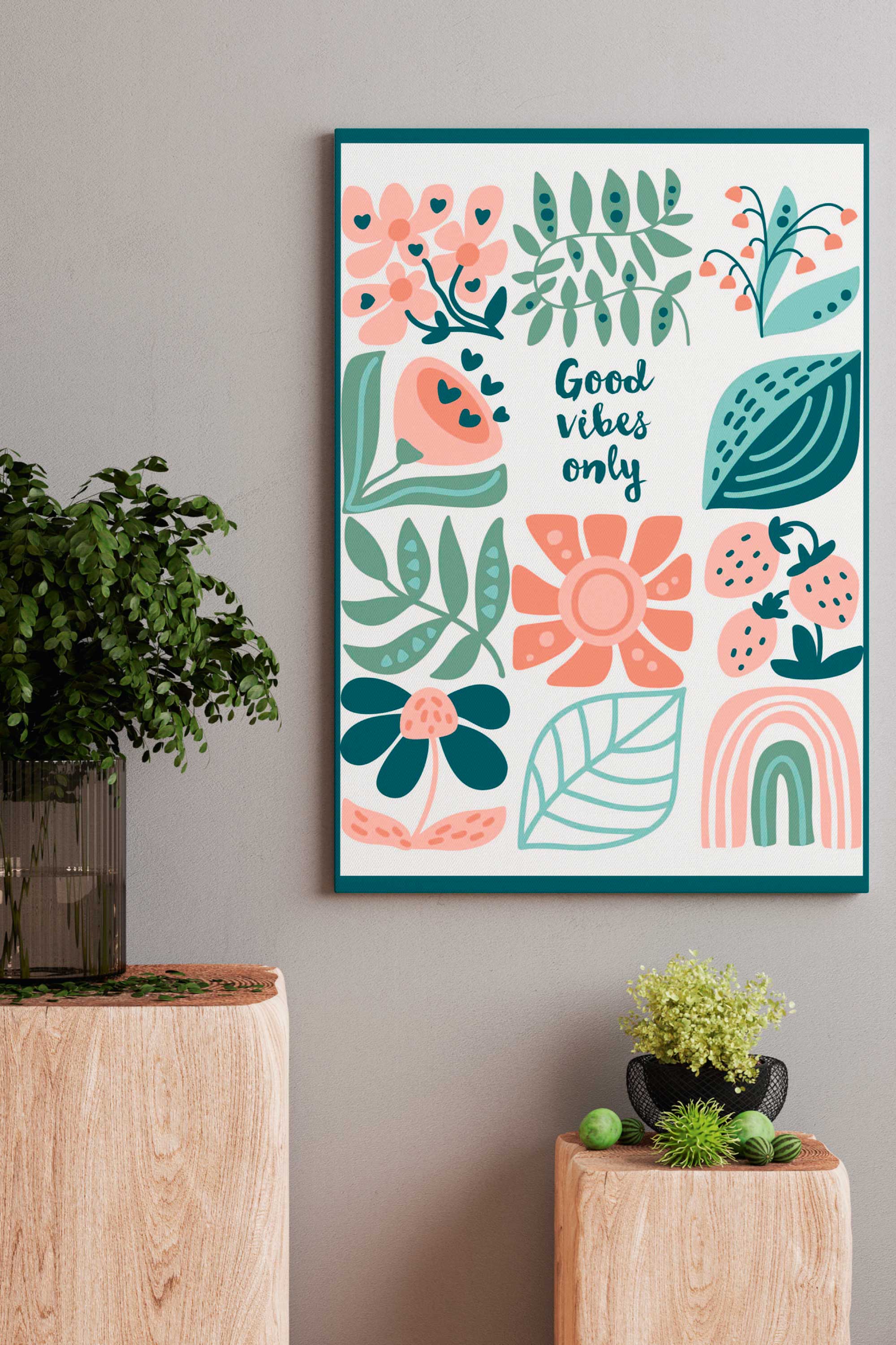 This design fits boho, modern, and Scandinavian interiors and works well in living rooms, bedrooms, nurseries, or creative spaces. Good Vibes Boho Tiles canvas print comes on high-quality canvas and sits hand-stretched over a solid pine wood frame for a clean, gallery-ready look. Inspired by nature and guided by a passion for color, Fancy Walls creates expressive wall décor for everyday living.Canvas Highlights