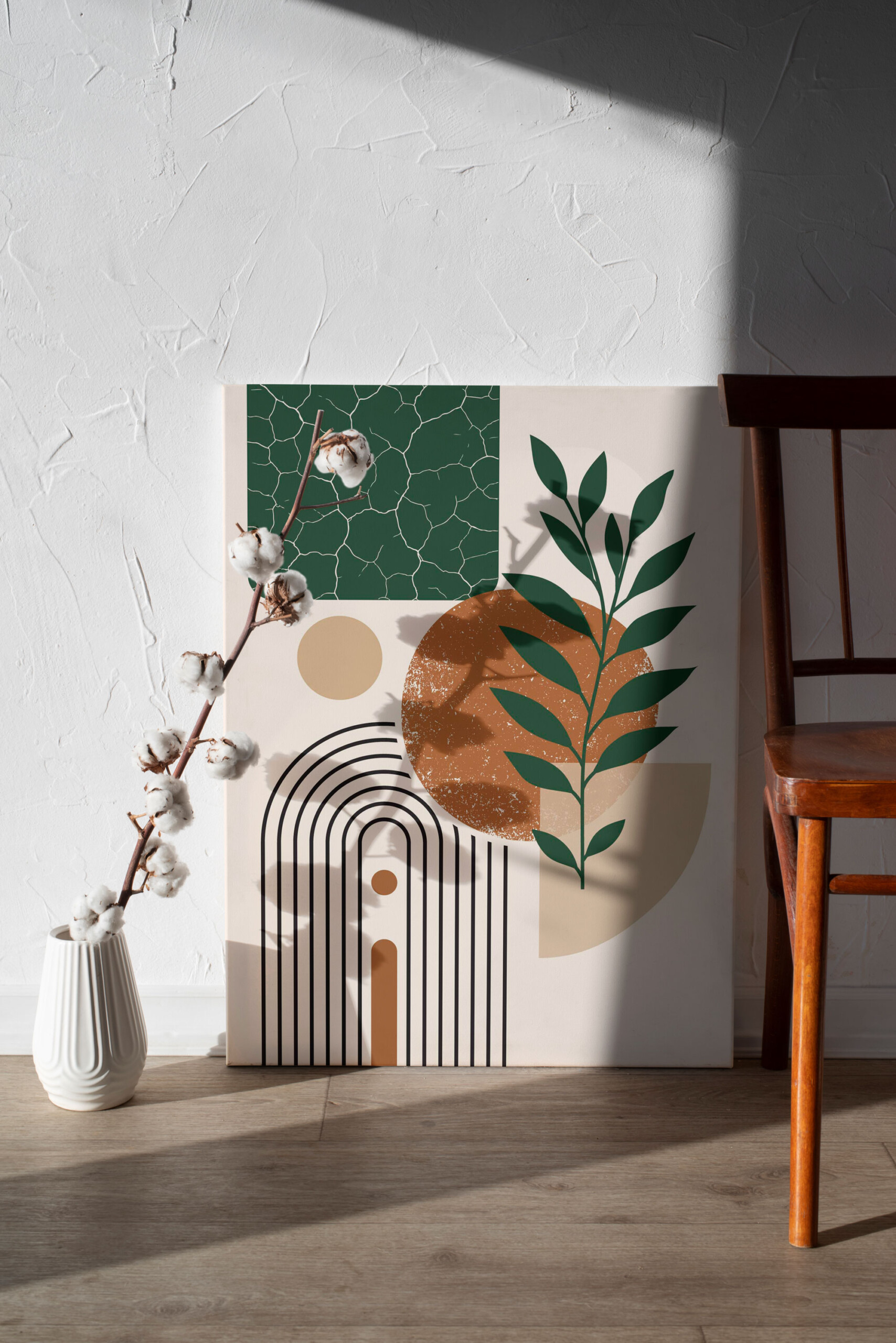 Organic Boho Geometry canvas print features abstract botanical shapes and earthy geometric forms arranged in a calm, modern layout. Rounded arches, soft lines, and leafy accents create a relaxed boho feel while keeping the composition clean. Neutral beige, clay, and deep green tones add warmth without overpowering the room. The design brings balance and visual calm, making it easy to pair with natural wood, light textiles, and minimalist décor. This artwork works well in living rooms, bedrooms, offices, or cozy reading spaces.