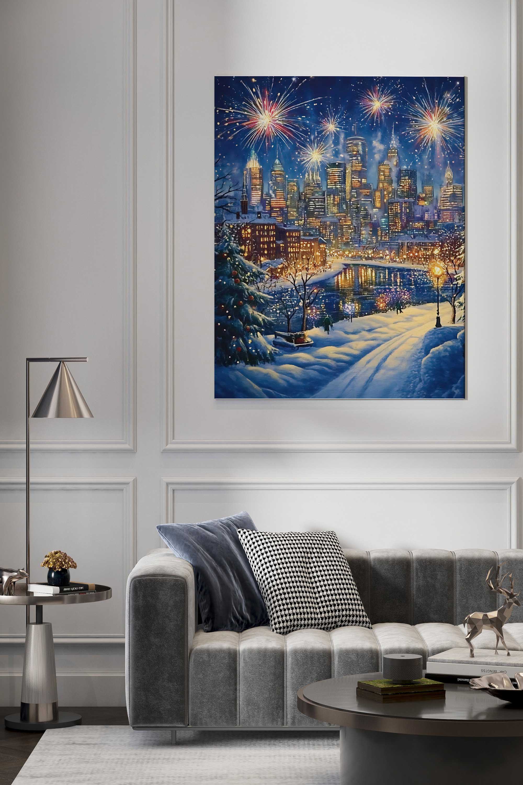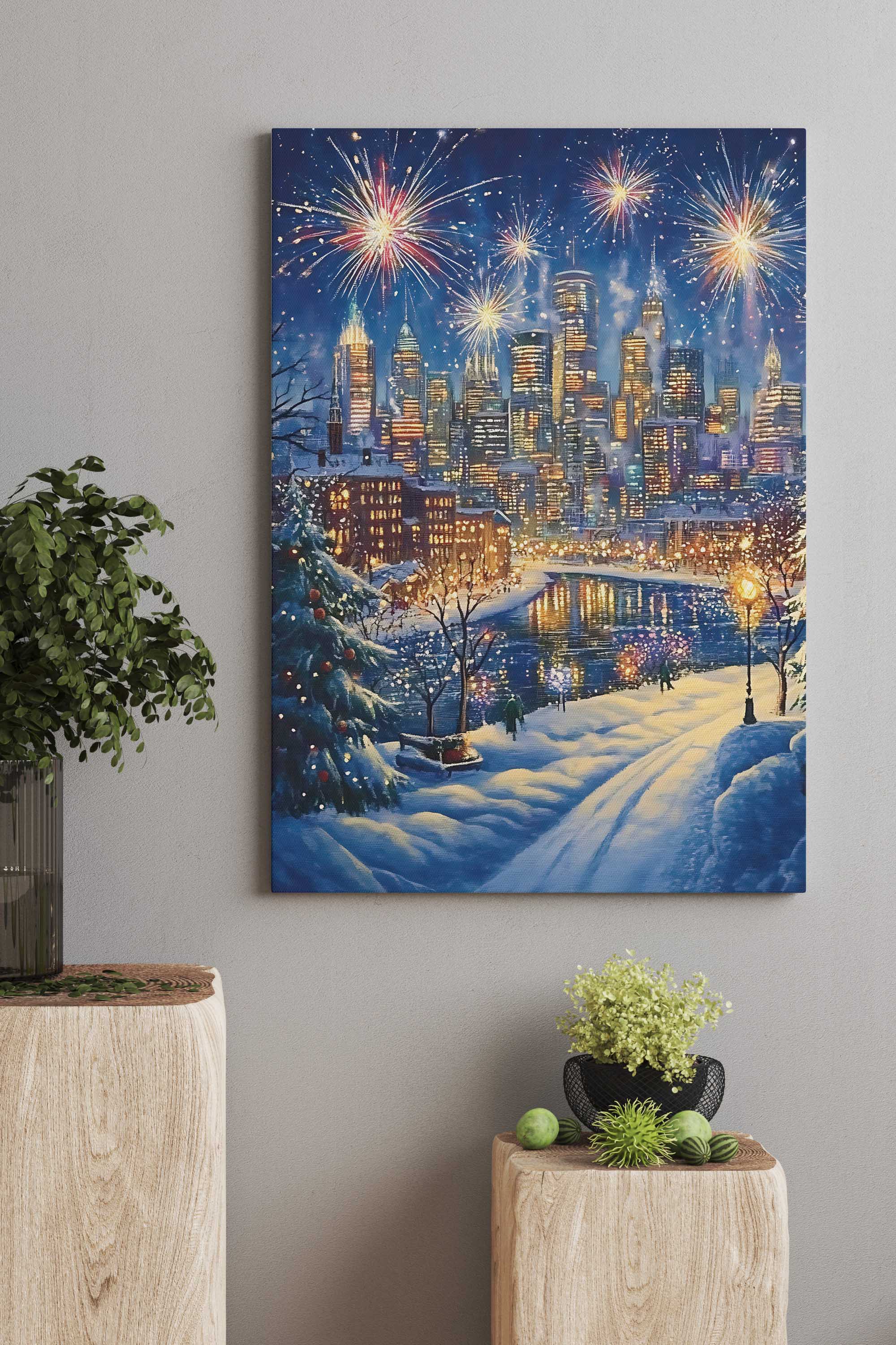 Painted Christmas City Night canvas print captures a festive winter cityscape illuminated by glowing lights and colorful fireworks. Snow-covered streets lead toward a vibrant skyline reflected in a calm river, creating depth and seasonal atmosphere. Painterly textures and rich blues, golds, and warm highlights give the artwork a hand-painted feel with holiday charm. This design brings warmth and celebration to living rooms, dining areas, or winter-inspired interiors.