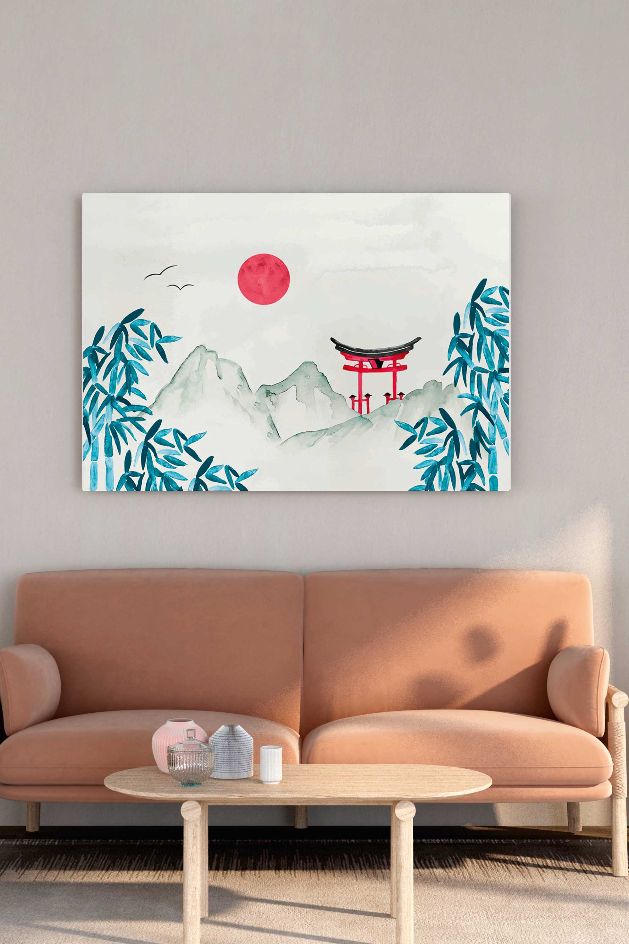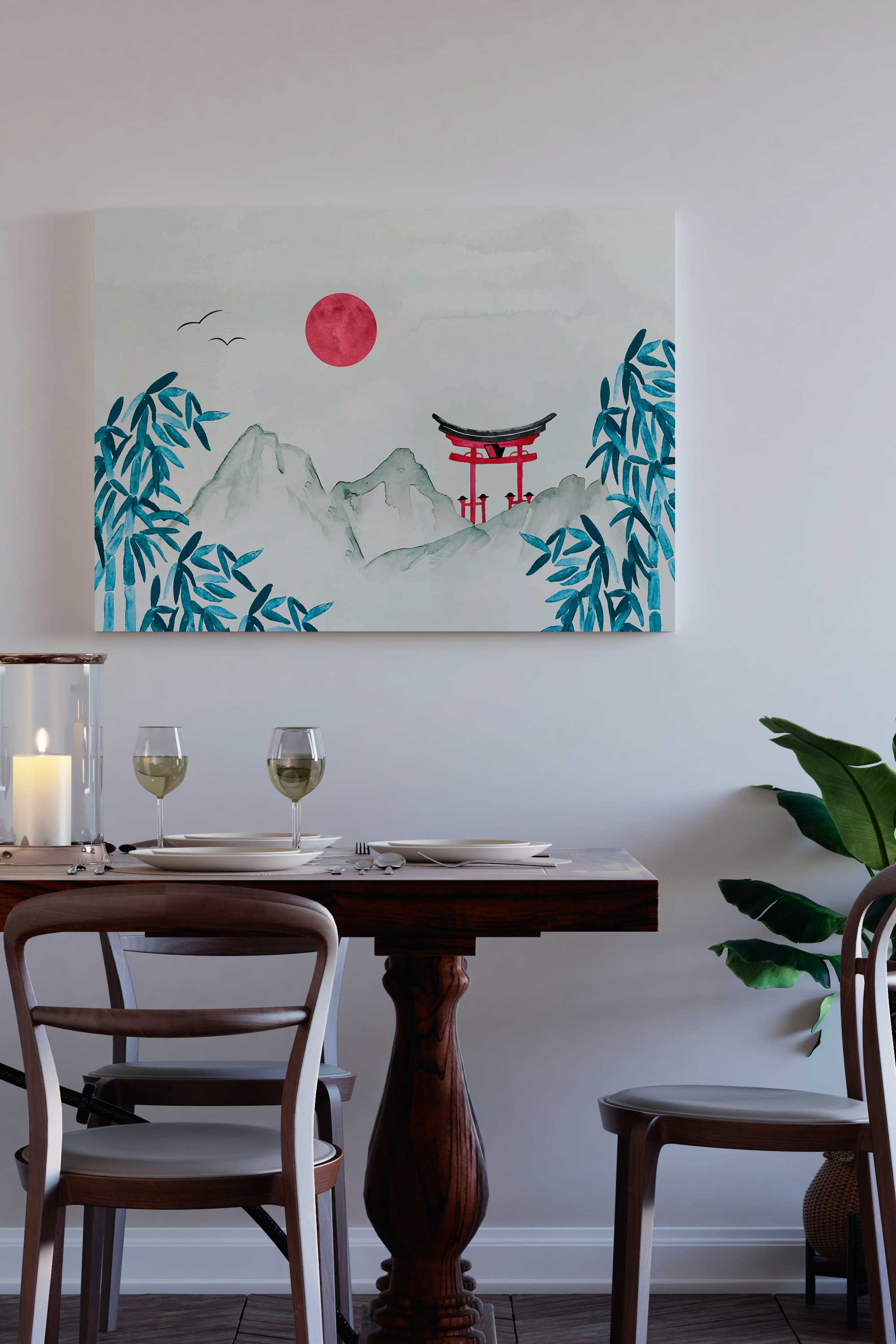 Red Sun Pagoda Canvas Print features a minimalist Asian landscape with soft watercolor mountains, drifting mist, and a striking red sun rising above a traditional pagoda. Cool blue bamboo leaves frame the composition, while gentle brush textures create depth without visual heaviness. The balanced layout and muted palette bring a sense of calm, harmony, and quiet movement to the scene.