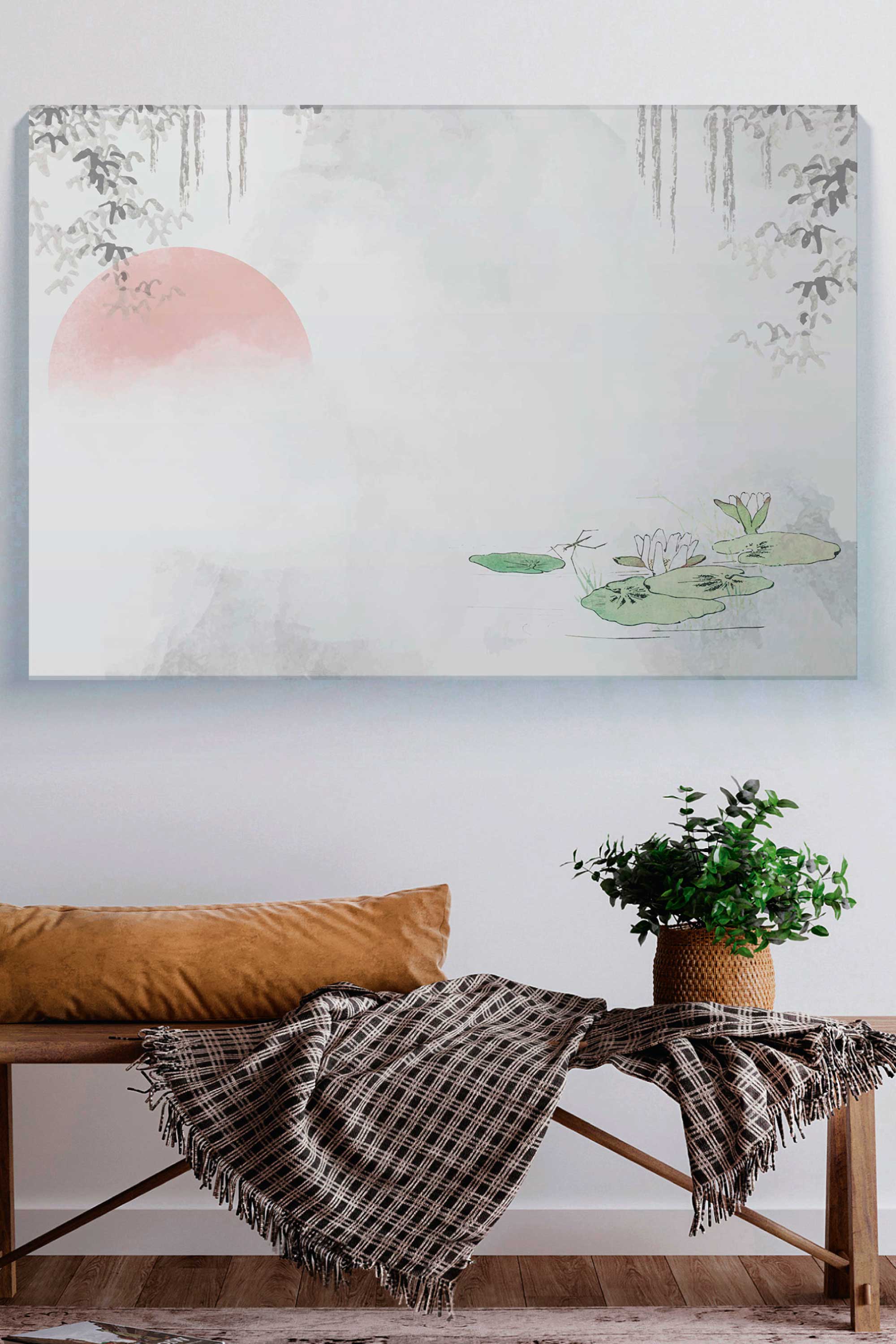 Serene Lotus Sunrise canvas print features a tranquil oriental scene with delicate lotus flowers resting on still water beneath a soft, glowing sunrise. Gentle mist, muted neutrals, and subtle watercolor-style details create a sense of calm and visual balance without overwhelming the space. Flowing lines and open composition give the artwork an airy, meditative feel rooted in nature-inspired design.