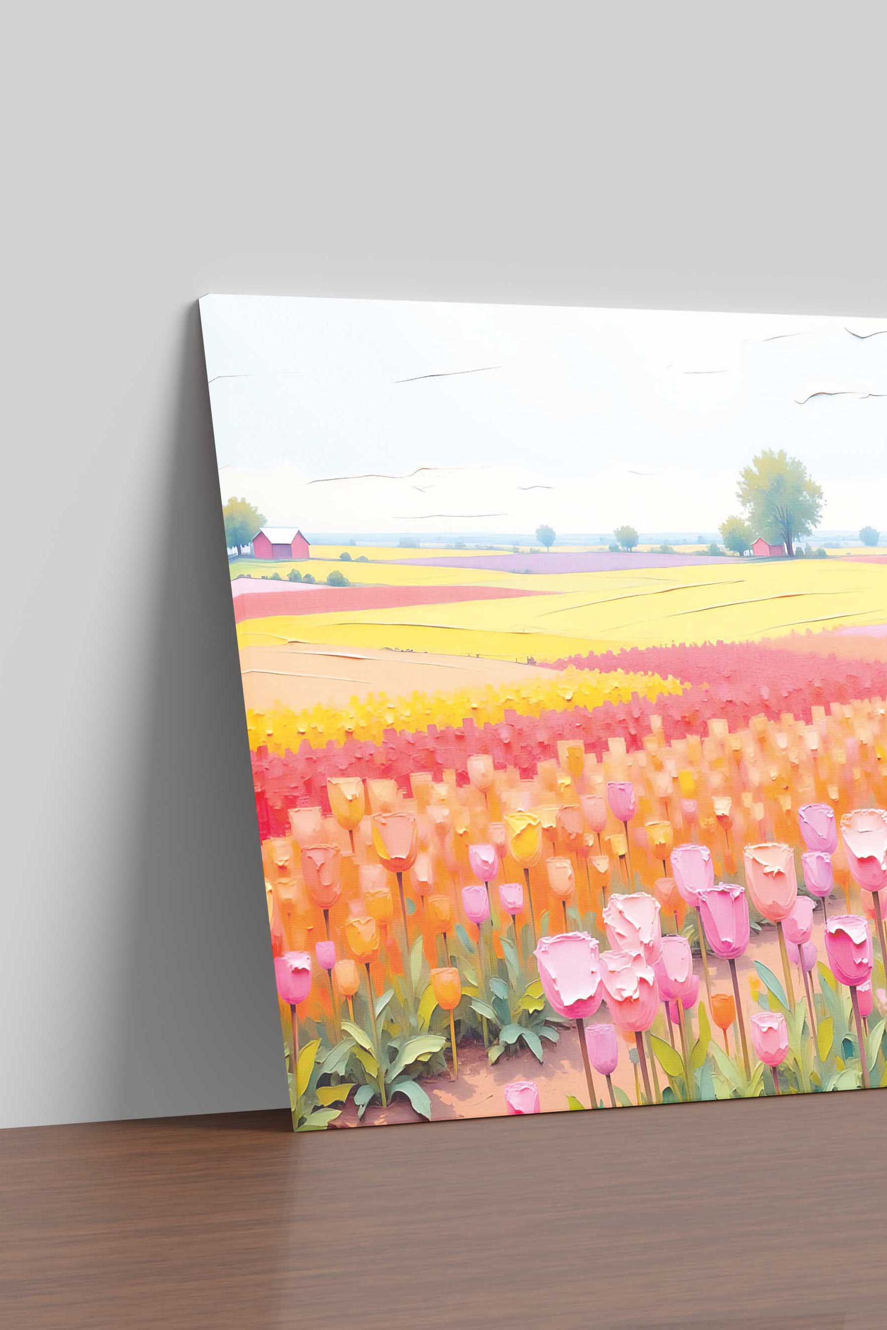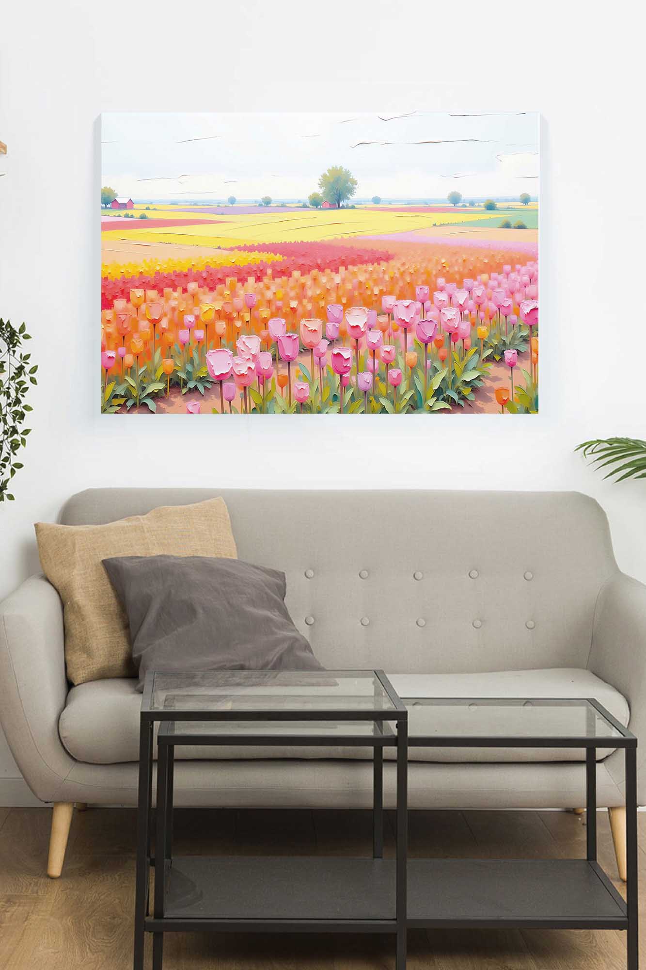Vibrant Tulip Meadow canvas print shows a wide field of blooming tulips in soft pink, coral, and warm orange tones. Rolling farmland and gentle horizons create depth while keeping the scene open and calm. The painted-look illustration style adds artistic character while remaining a smooth, flat printed image. Bright floral colors balance with soft countryside hues, creating a fresh and uplifting mood. This artwork suits living rooms, kitchens, bedrooms, or interiors inspired by spring décor, farmhouse style, and nature themes.