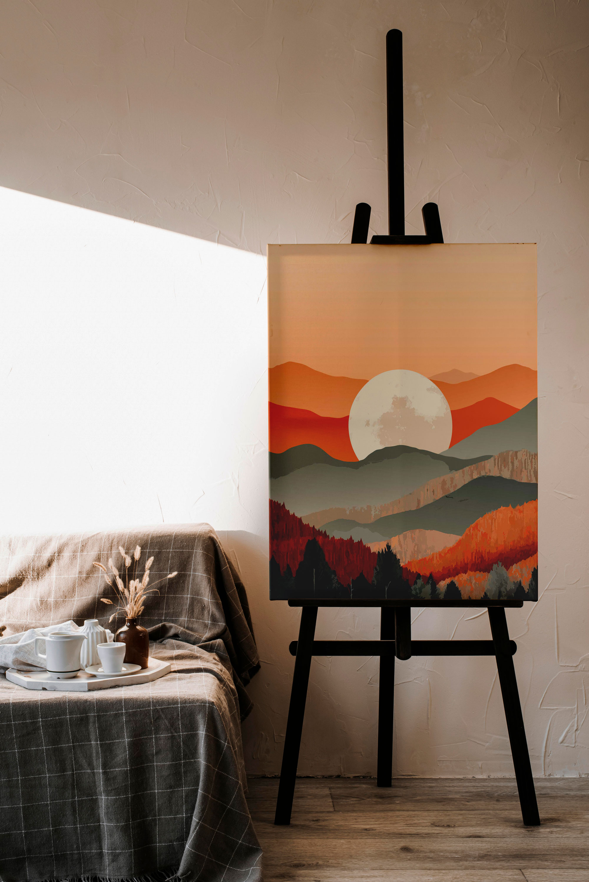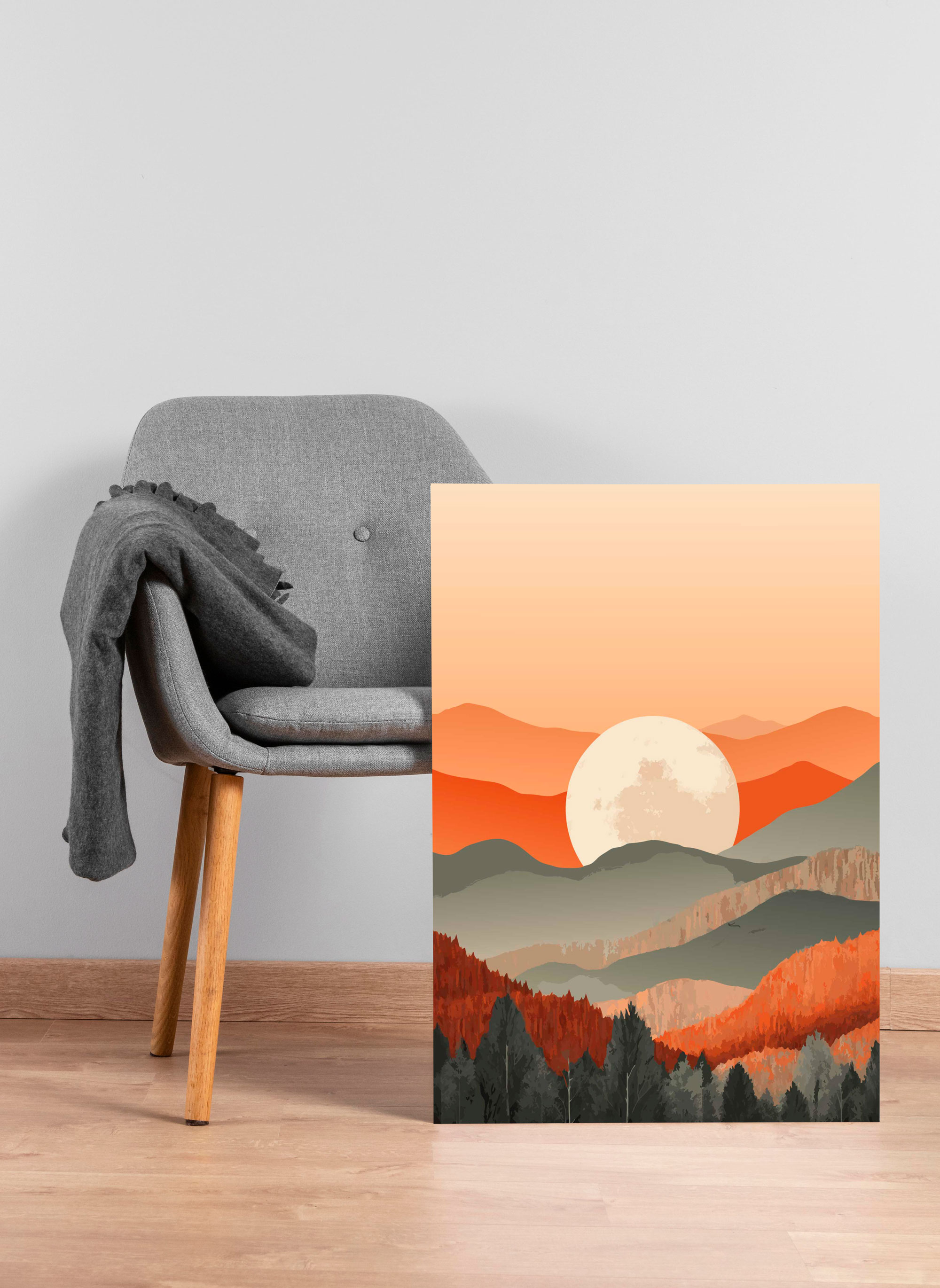 Warm Mountain Sunset Canvas Print features a serene layered landscape with rolling hills and a glowing sun resting above distant ridgelines. Soft gradients of warm orange, muted terracotta, and earthy green tones create depth and calm, while the simplified shapes give the artwork a modern, minimal character. The composition feels balanced and open, capturing the quiet atmosphere of an autumn sunset without visual noise.