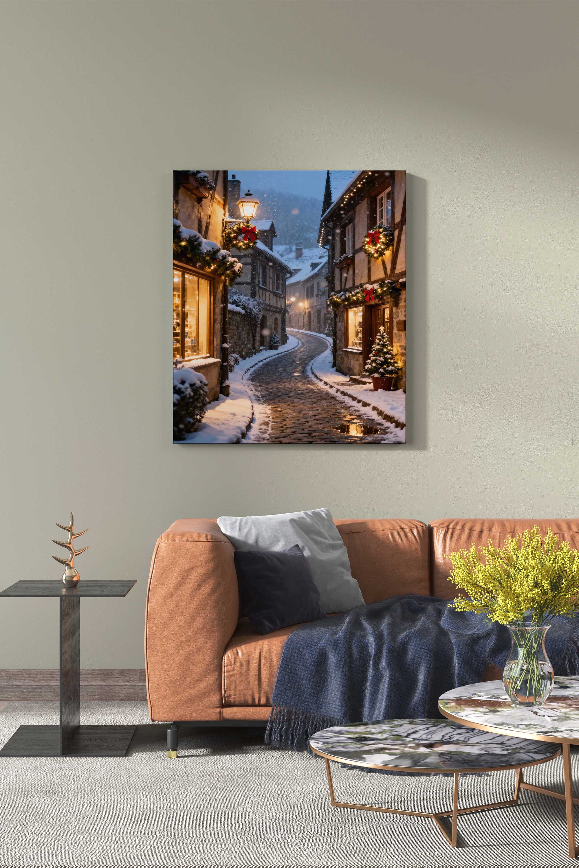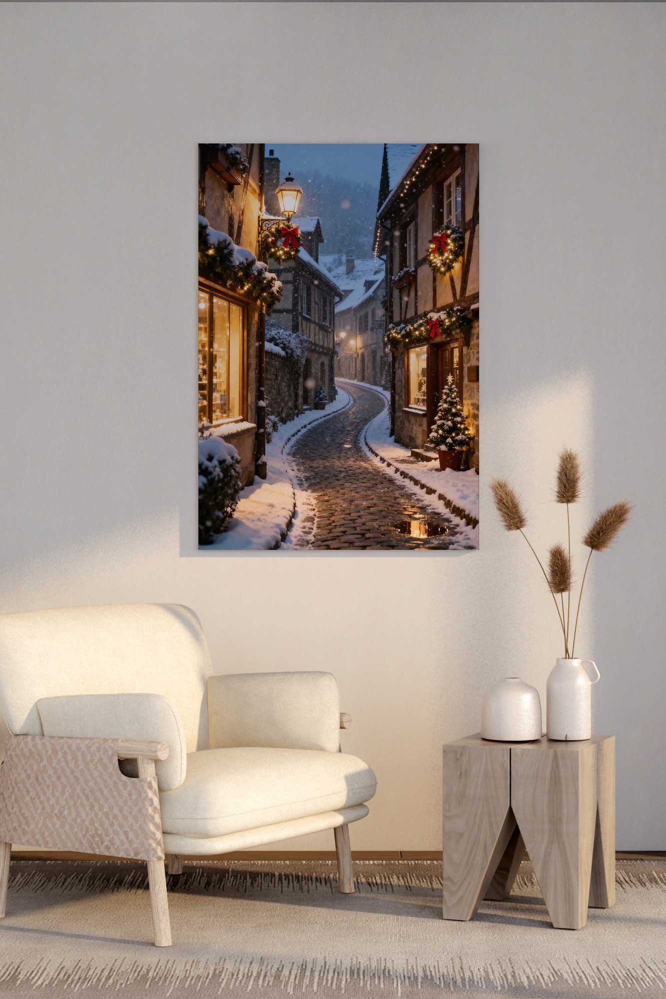 Winter Old Town Street canvas print captures a snowy evening in a historic city. Snow settles on cobblestones while warm window lights and festive wreaths add a welcoming glow. The curved street creates depth and a cozy mood for living rooms, bedrooms, hallways, or seasonal interiors.