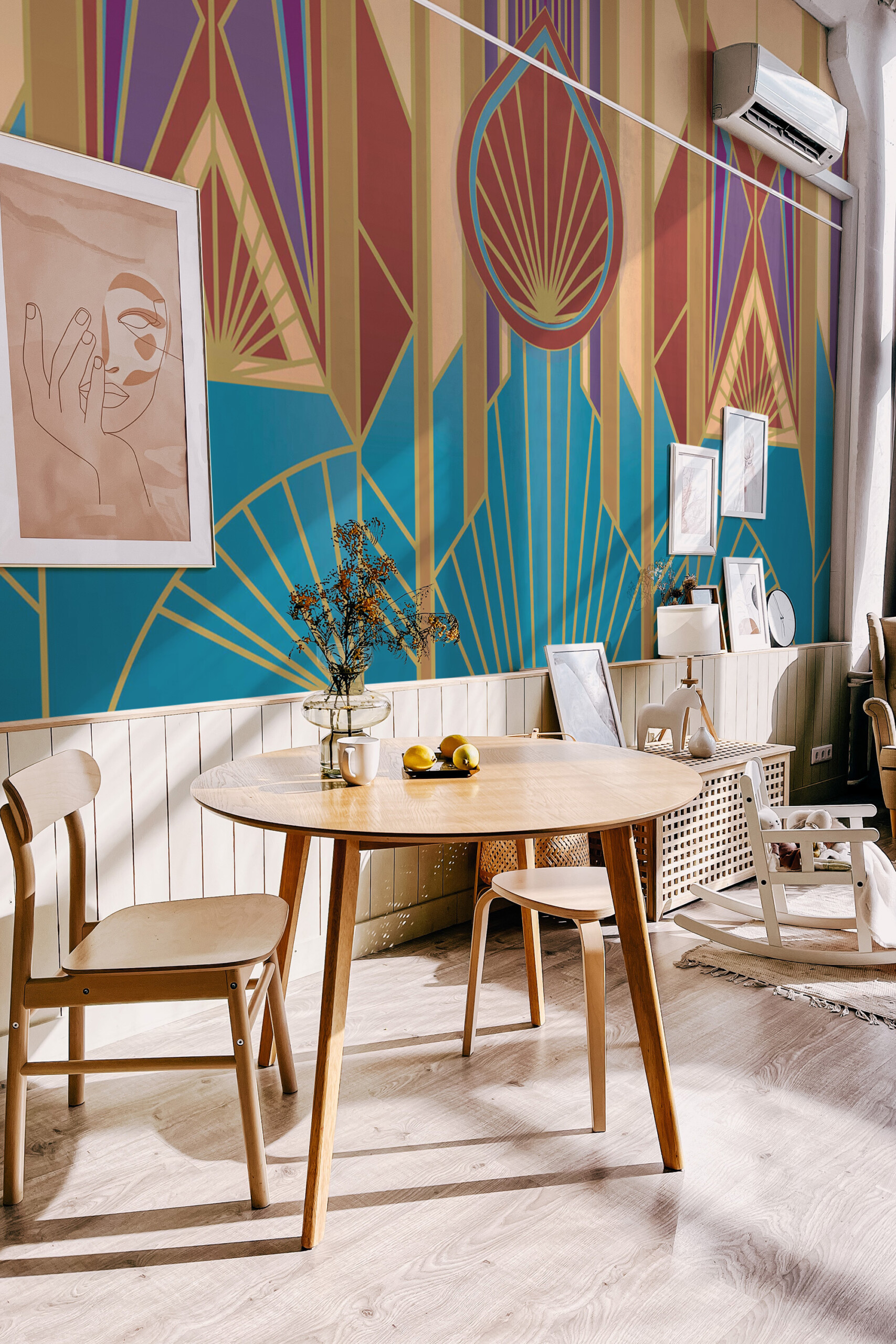 Art Deco Burst wall mural brings vibrant sophistication to living rooms, creative spaces, or hallways with its colorful geometric pattern and golden accents. This Art Deco Burst peel and stick wall mural captures the energy and glamour of the roaring twenties while adding a modern artistic edge.