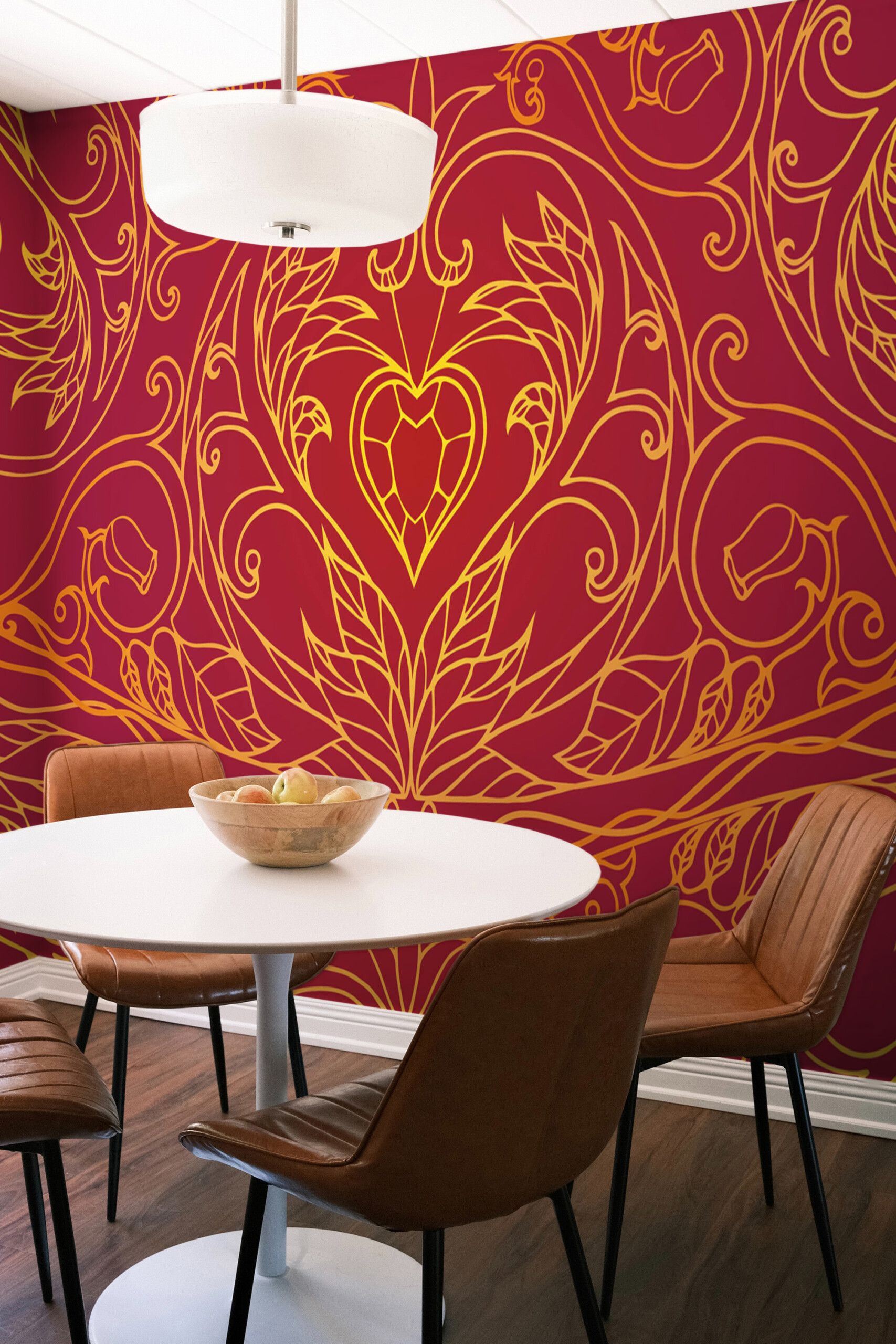 Art Deco Romance wall mural brings bold elegance to interiors with a striking symmetrical heart motif framed by ornate gold linework on a rich red background. The refined geometry and decorative flow create a luxurious, dramatic atmosphere, making this design ideal for bedrooms, dining rooms, boutique interiors, or statement walls inspired by vintage glamour.