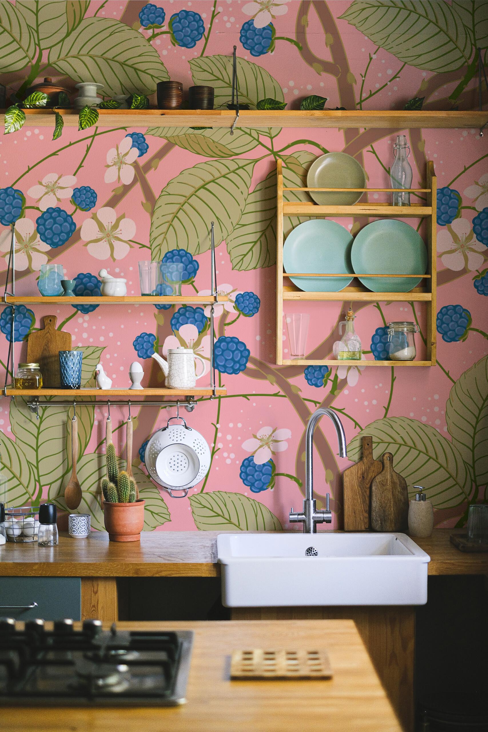 Art Nouveau Bramble Garden wall mural features elegant blackberry branches with delicate white blossoms and deep blue berries set against a soft pink background, creating a refined vintage floral composition inspired by classic botanical illustrations. The flowing lines and layered elements bring natural rhythm and a gentle faux textured effect that adds warmth and artistic charm to the space.