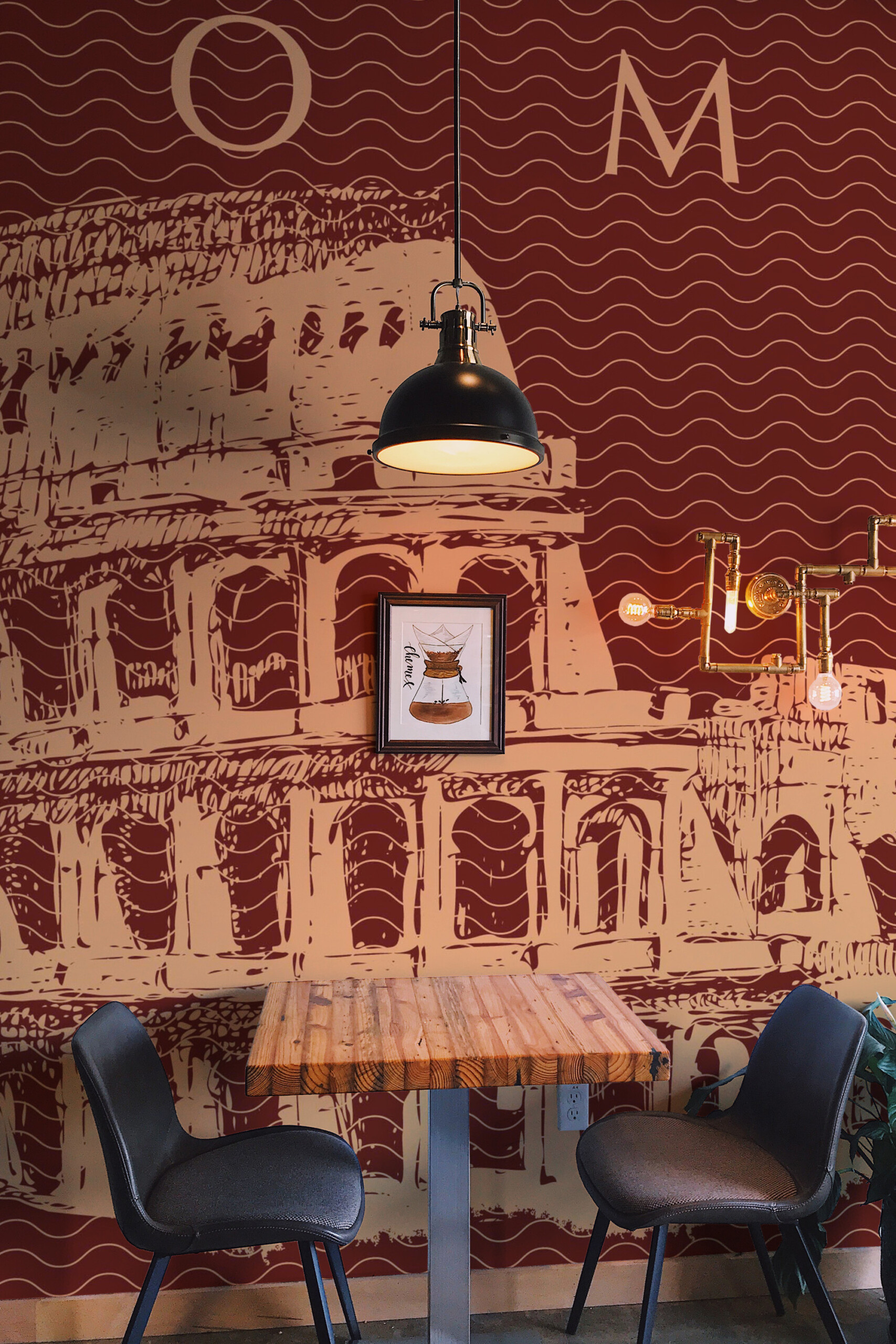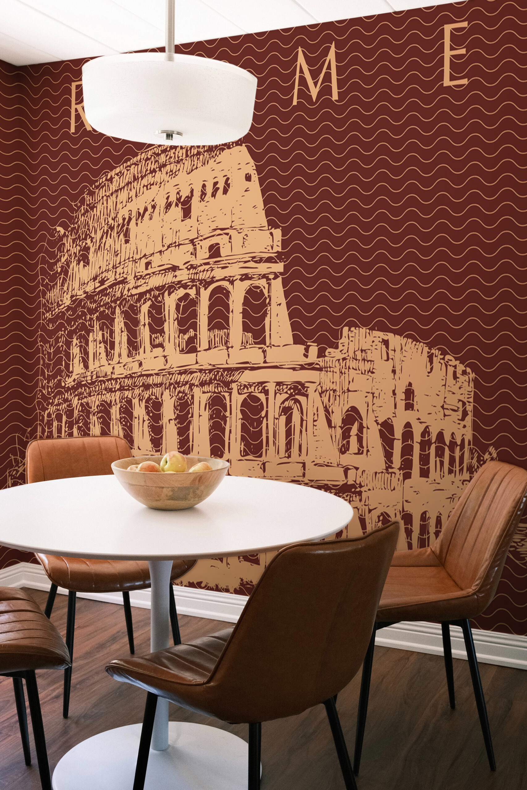Bold Vintage Colosseum wall mural transforms your space with the grandeur of Rome’s most famous monument reimagined in elegant vintage style. The hand-drawn Colosseum illustration sits against a wavy burgundy background, creating a refined sense of movement and depth ideal for living rooms, offices, or travel-inspired interiors.