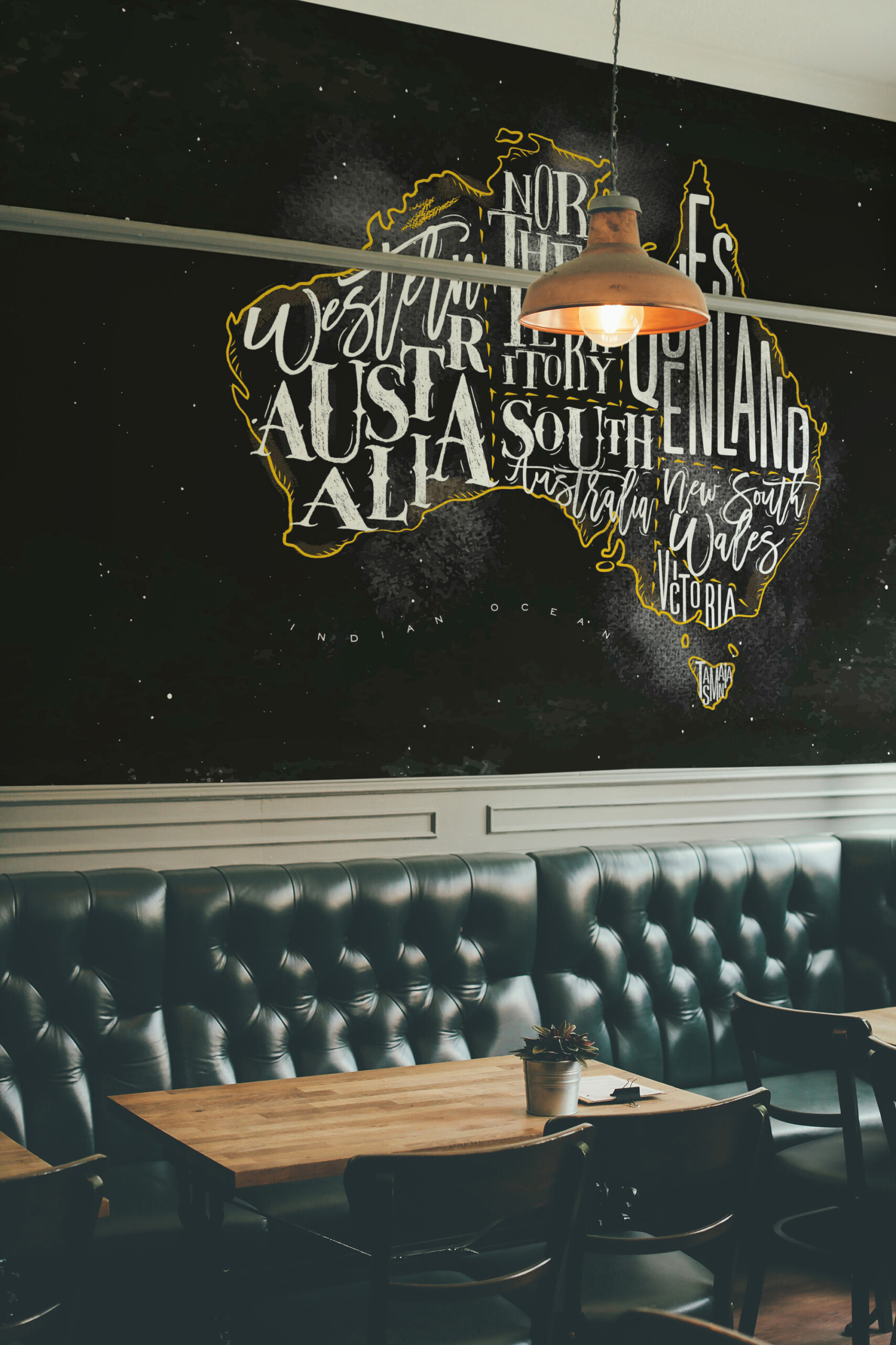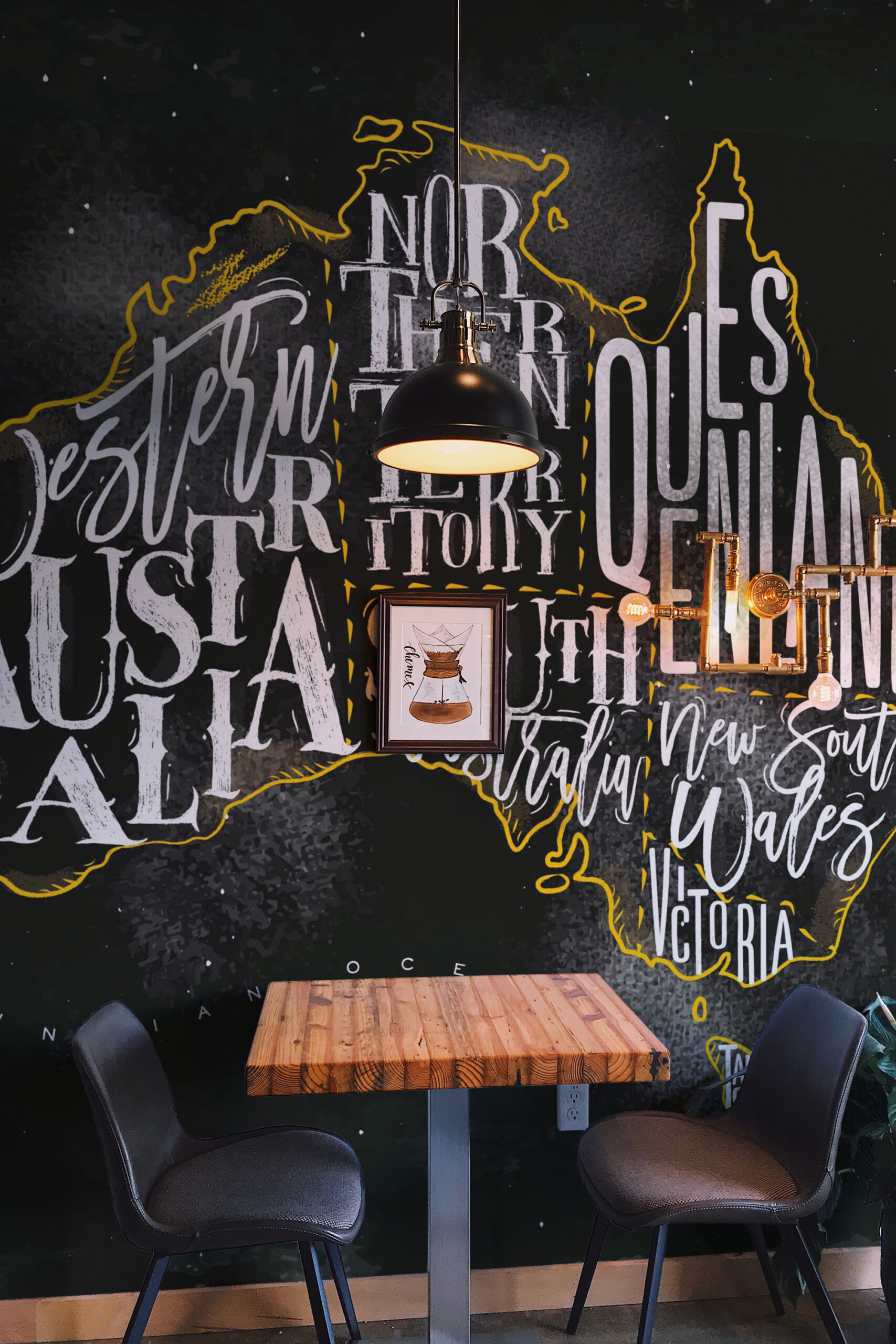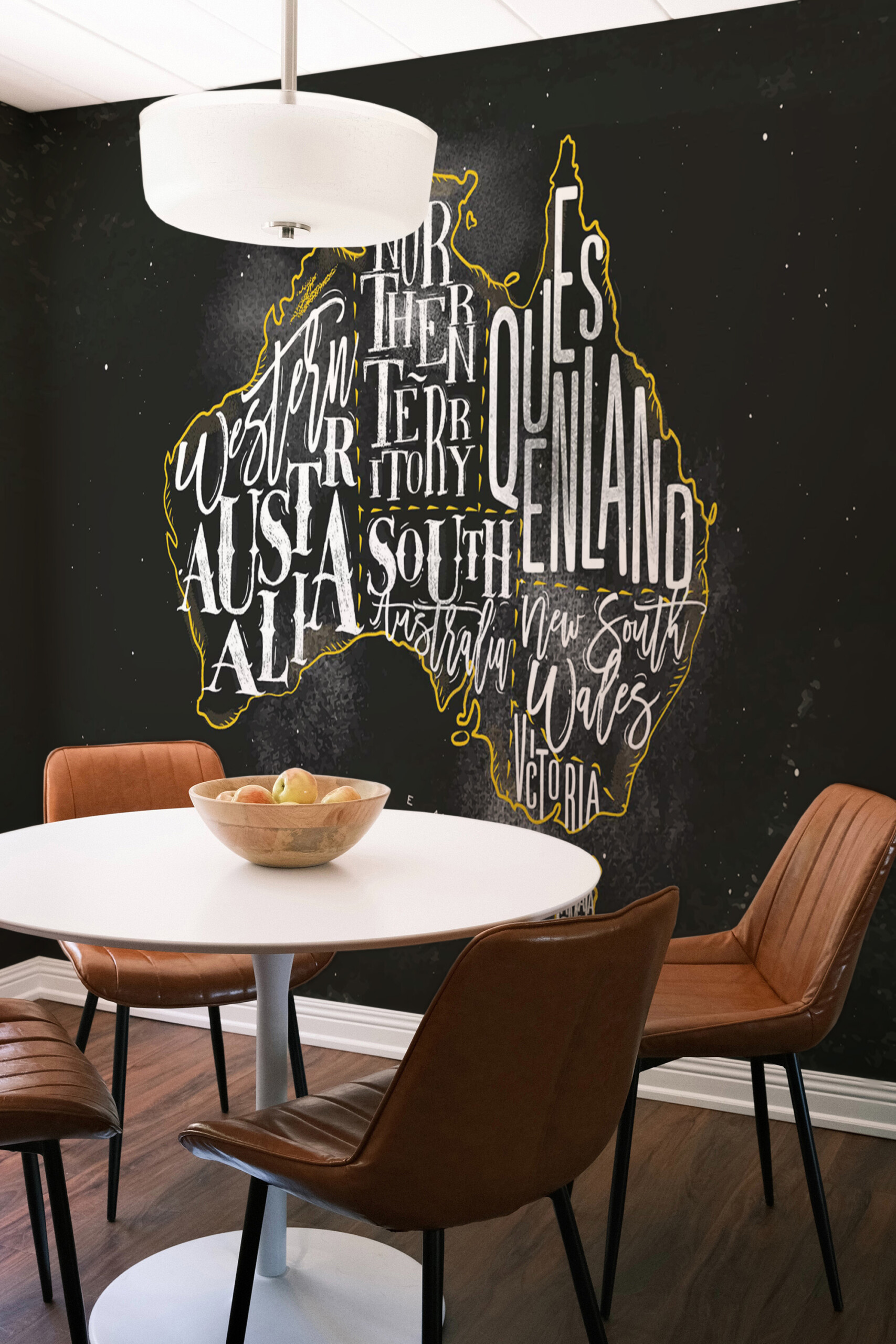 Chalkboard Australia Map wall mural brings modern graphic charm to offices, study rooms, or creative workspaces with its bold black background and expressive white typography. The hand-lettered region names form a striking silhouette that feels artistic, clean, and full of character.