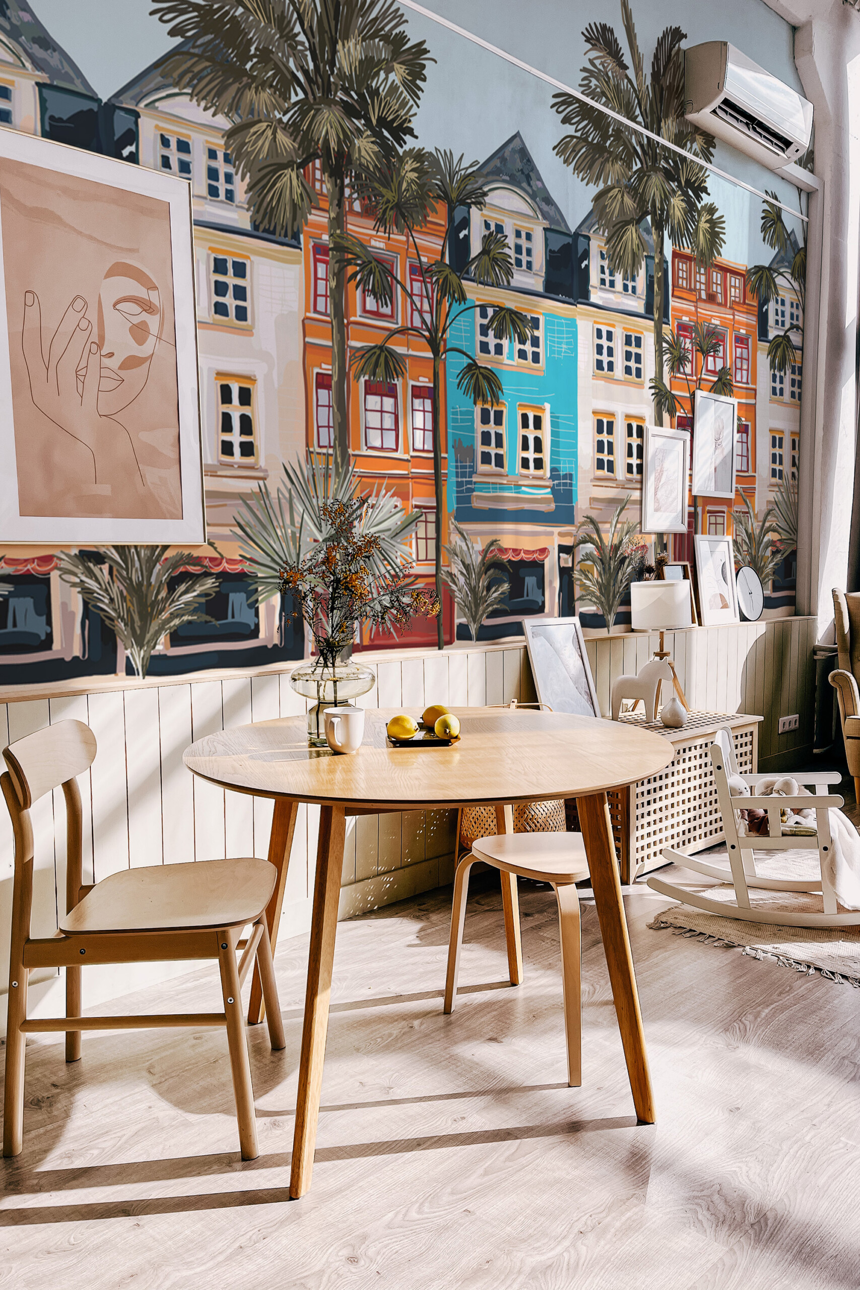Coastal Town wall mural captures the joy and brightness of a seaside escape, featuring rows of colorful houses framed by tall palm trees under a clear blue sky. Tropical Avenue wall mural adds a splash of vacation energy to your space, blending cheerful architectural hues with lush greenery for a lively, summery atmosphere.