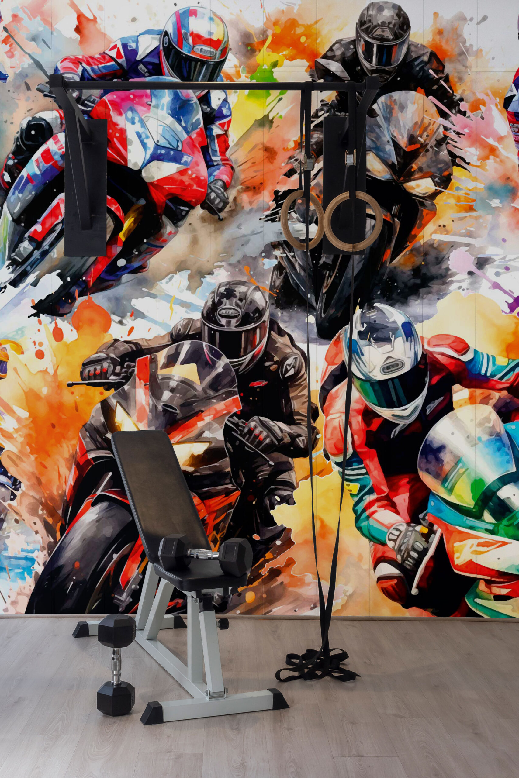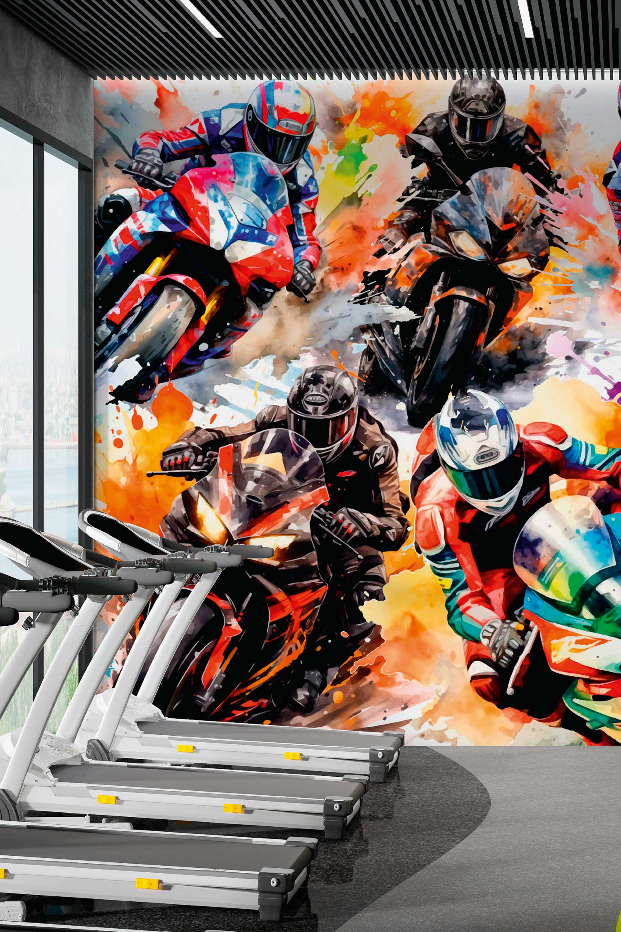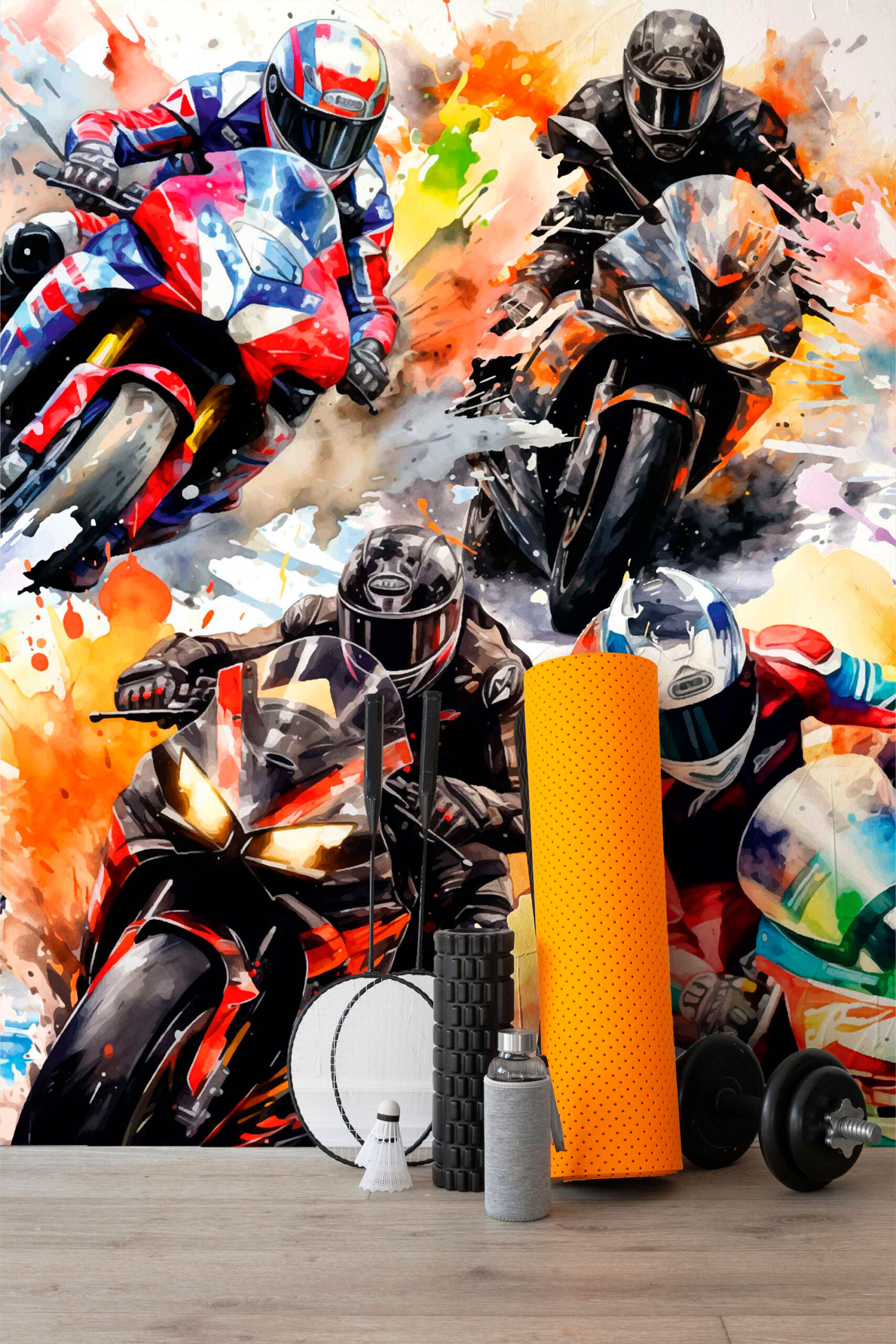 Colorful Moto Racing Wall Mural brings instant adrenaline and bold energy to your Game & Gaming Room. The fast-paced scene makes the whole space feel more alive and competitive. Bright reds, blues, oranges, and whites pop against the wall and lift the room’s mood. It pairs well with modern gaming setups, LED lighting, and sleek black furniture.