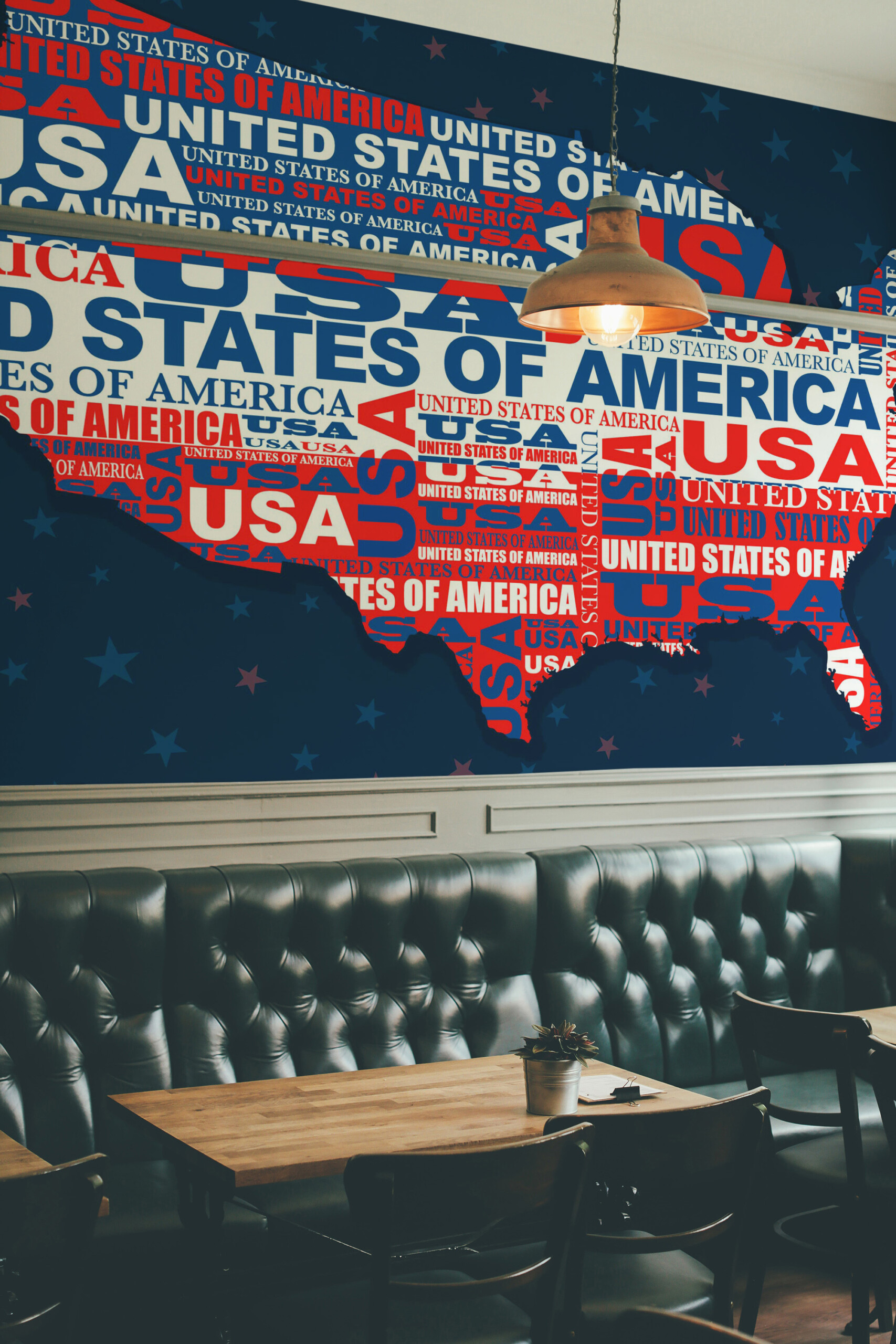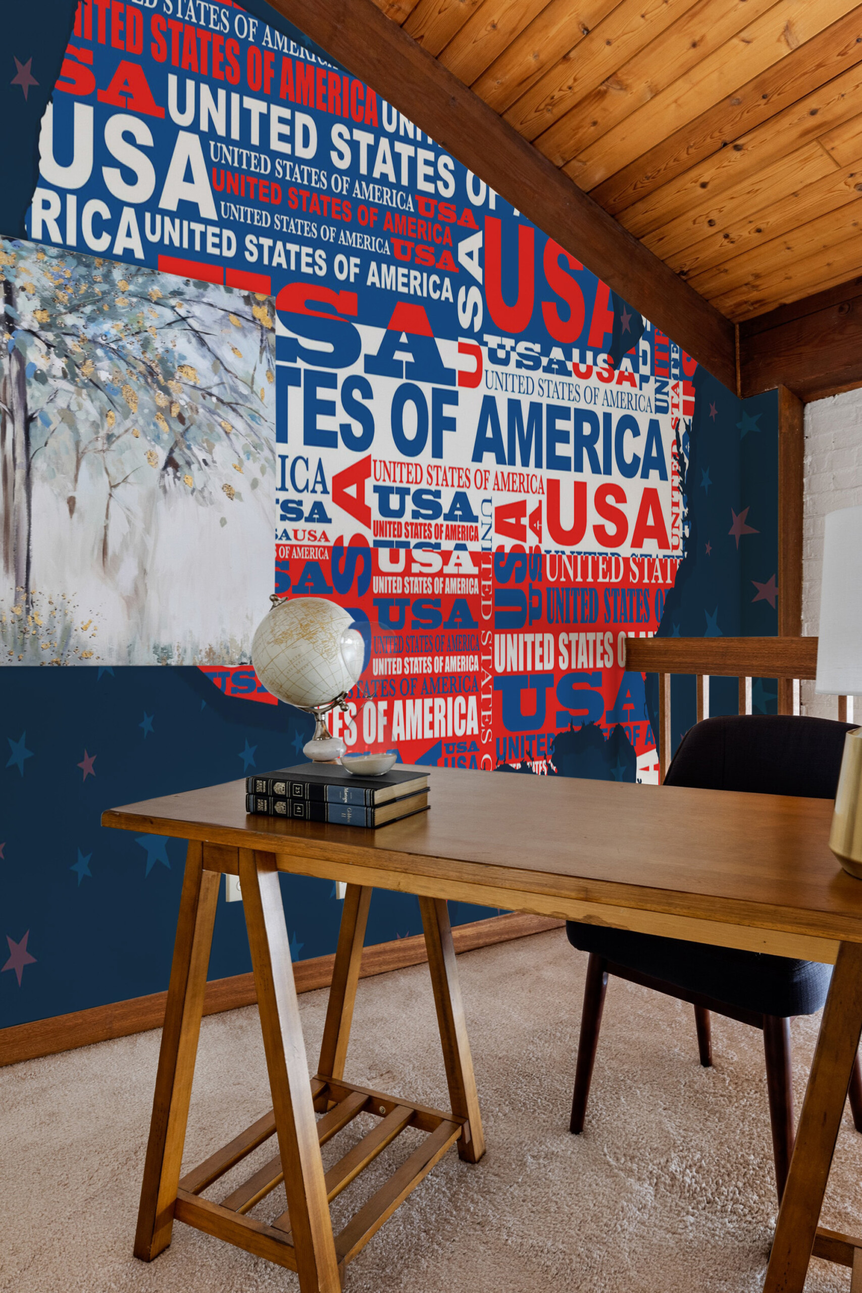 Creative USA Map wall mural brings bold patriotic style to offices, living rooms, or modern entertainment spaces with its blue backdrop and striking red, white, and blue typography. The dynamic letter-based map creates a graphic centerpiece that adds energy and character to any interior.