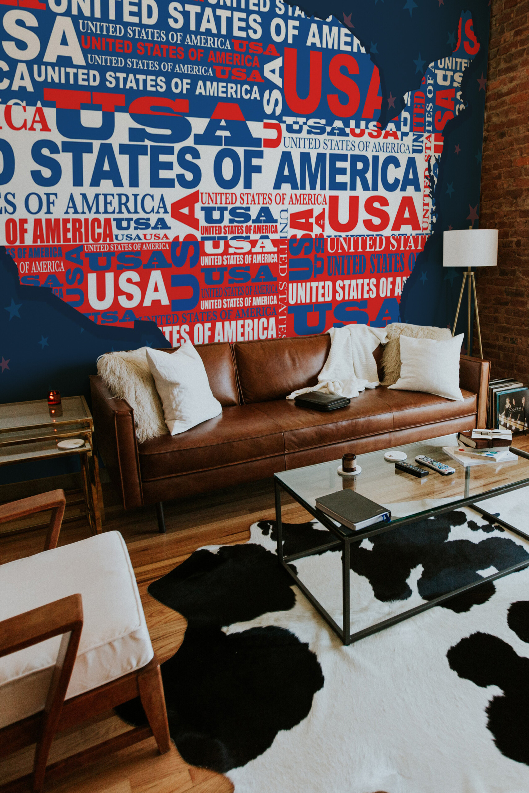 This Creative USA Map peel and stick wall mural installs easily, offering a renter-friendly way to refresh your décor with a modern patriotic theme. The USA typography map blends contemporary design with eye-catching color, making it a standout accent wall for both homes and commercial settings. Printed on eco-friendly, PVC-free materials using GreenGuard Certified inks, this removable, self-adhesive wallpaper is safe for indoor use and ideal for long-term decorating.Wall Mural Highlights