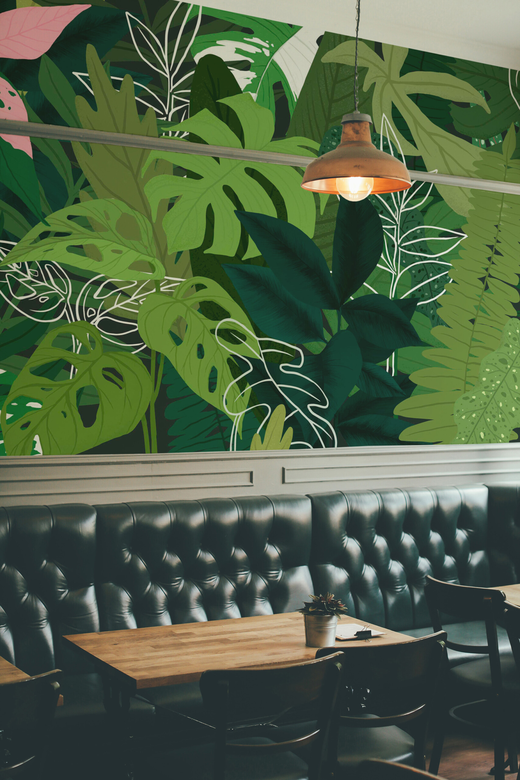 Deep Jungle Canopy peel and stick wall mural installs smoothly as a removable, self-adhesive wallpaper ideal for quick room transformations, while the traditional non-pasted option offers a timeless application for long-term décor projects, and Tropical Botanical Mural enhances both contemporary and classic spaces. Printed on eco-friendly, PVC-free materials using GreenGuard Gold certified inks, it ensures safe indoor air quality, vibrant color richness, and lasting durability for everyday living.Wall Mural Highlights