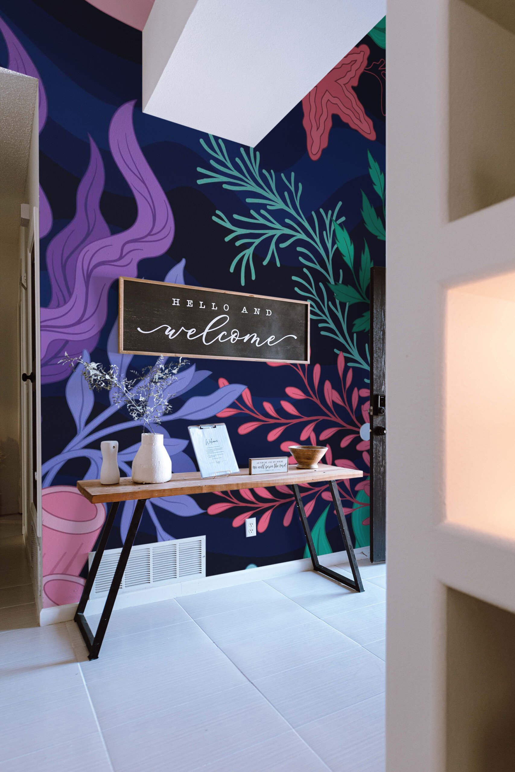 Deep Sea Botanicals wall mural invites you beneath the surface with its rich navy background and flourishing marine foliage. Coral branches, sea plants, and ocean blooms in pink, green, and violet hues create a layered, botanical scene that feels both vibrant and tranquil—perfect for bathrooms, bedrooms, or creative coastal interiors.