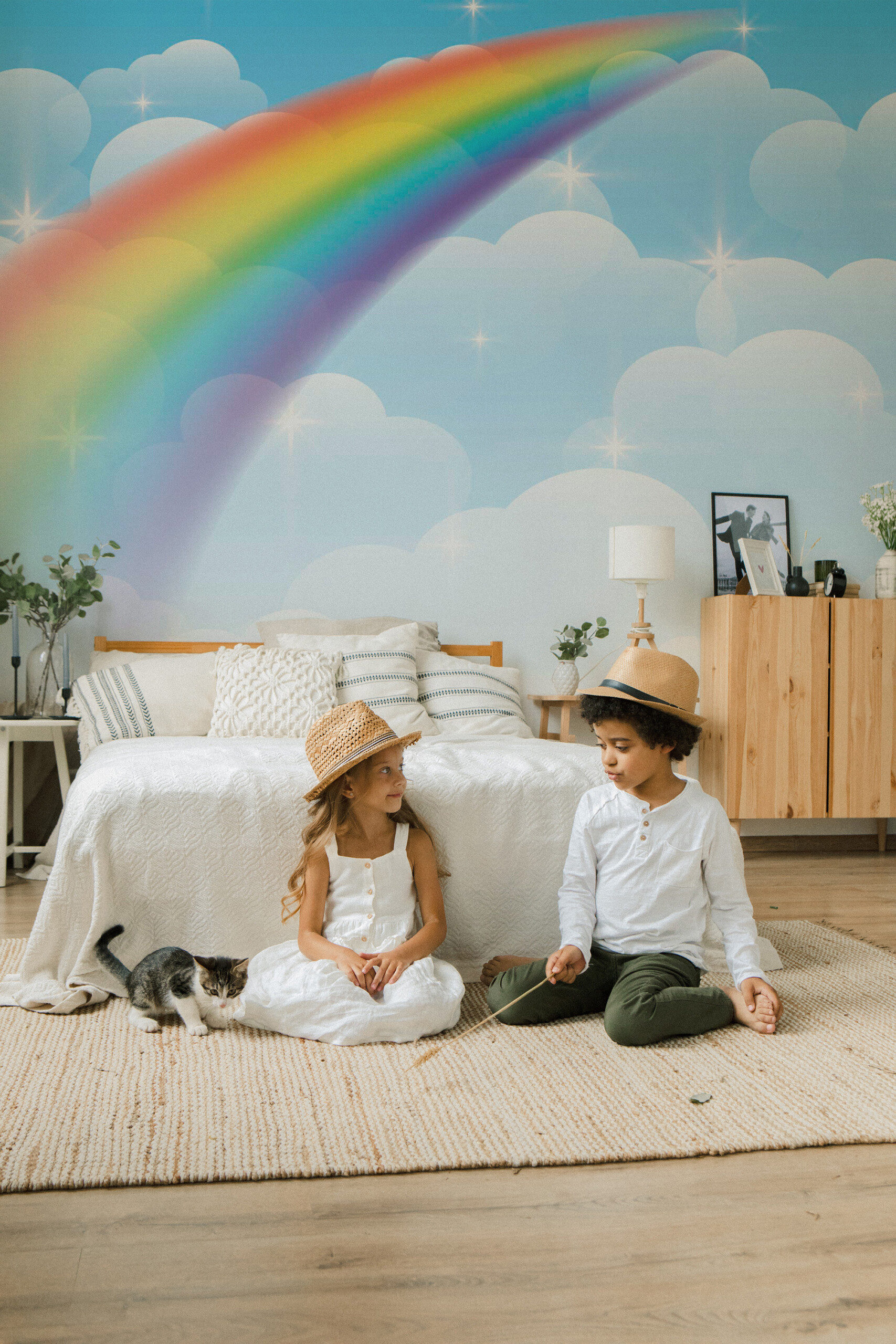 Dreamy Rainbow in Clouds peel and stick wall mural installs easily as a removable, self-adhesive wallpaper, while the traditional non-pasted option offers a smooth, long-lasting finish for family homes. Pastel Rainbow Sky mural adds whimsical charm to Scandinavian, modern nursery, and soft minimalist interiors. Printed on eco-friendly, PVC-free materials, it provides safe, vibrant décor designed especially for children’s spaces.Wall Mural Highlights
