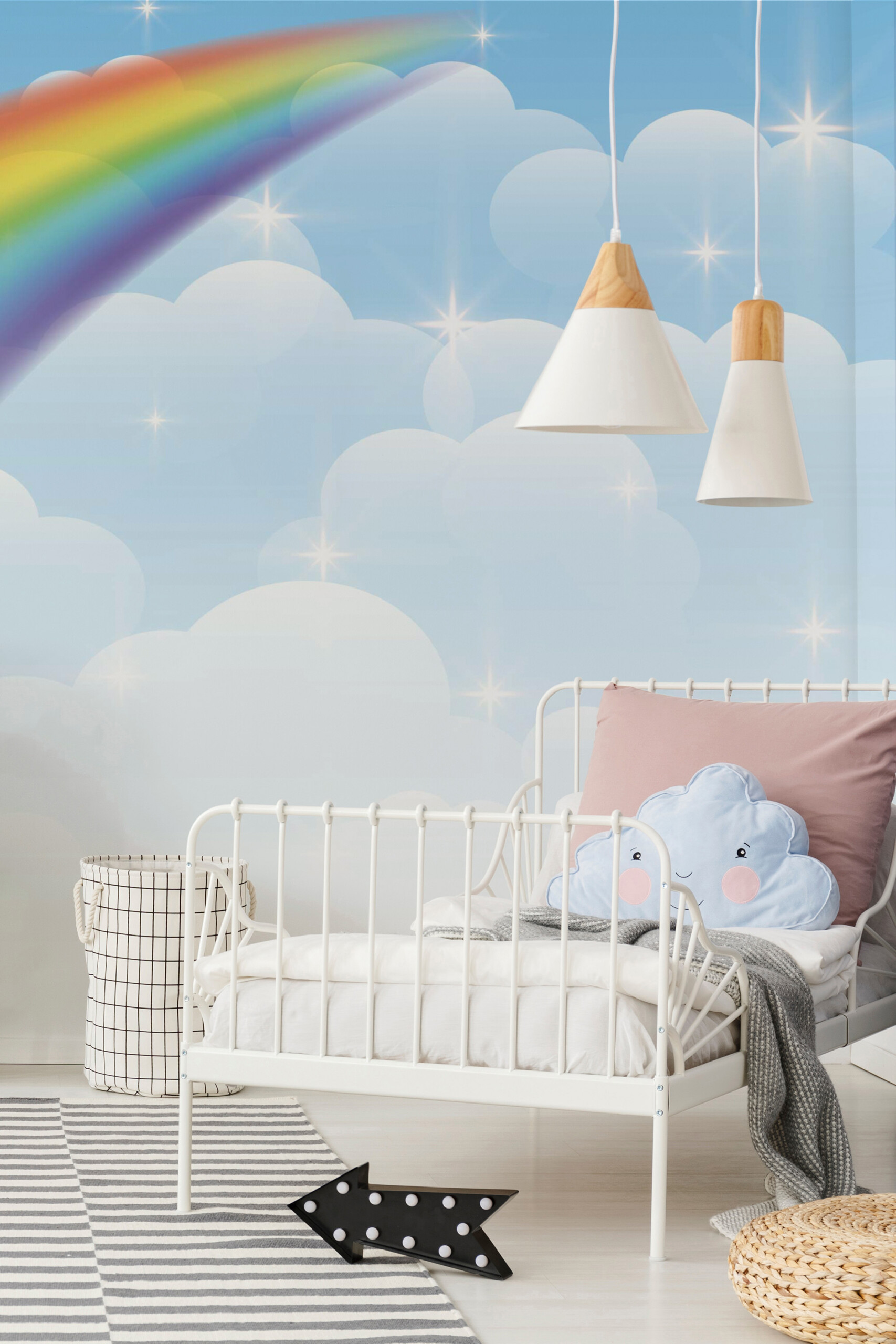 Dreamy Rainbow in Clouds wall mural creates a soft, magical atmosphere with a glowing pastel rainbow, fluffy white clouds, and subtle sparkles drifting across a calm blue sky. The gentle gradients and dreamy composition make it perfect for nurseries, baby rooms, toddler bedrooms, and playful kids’ spaces where imagination and comfort matter most.