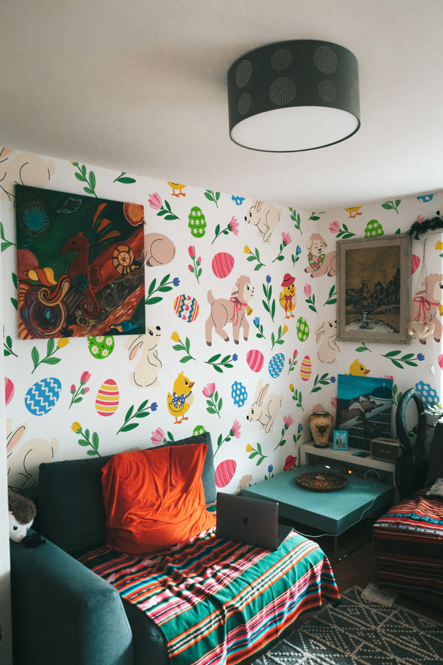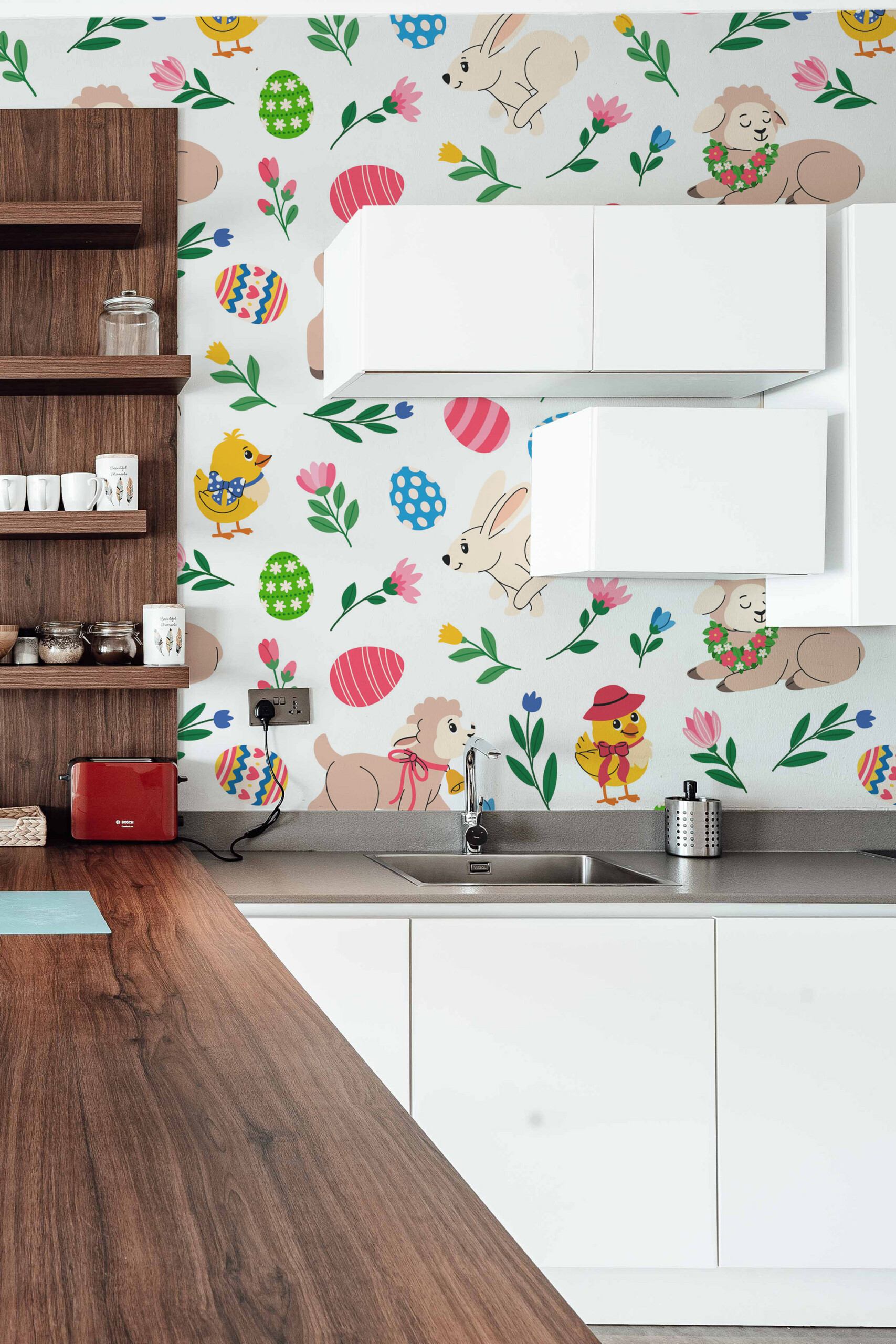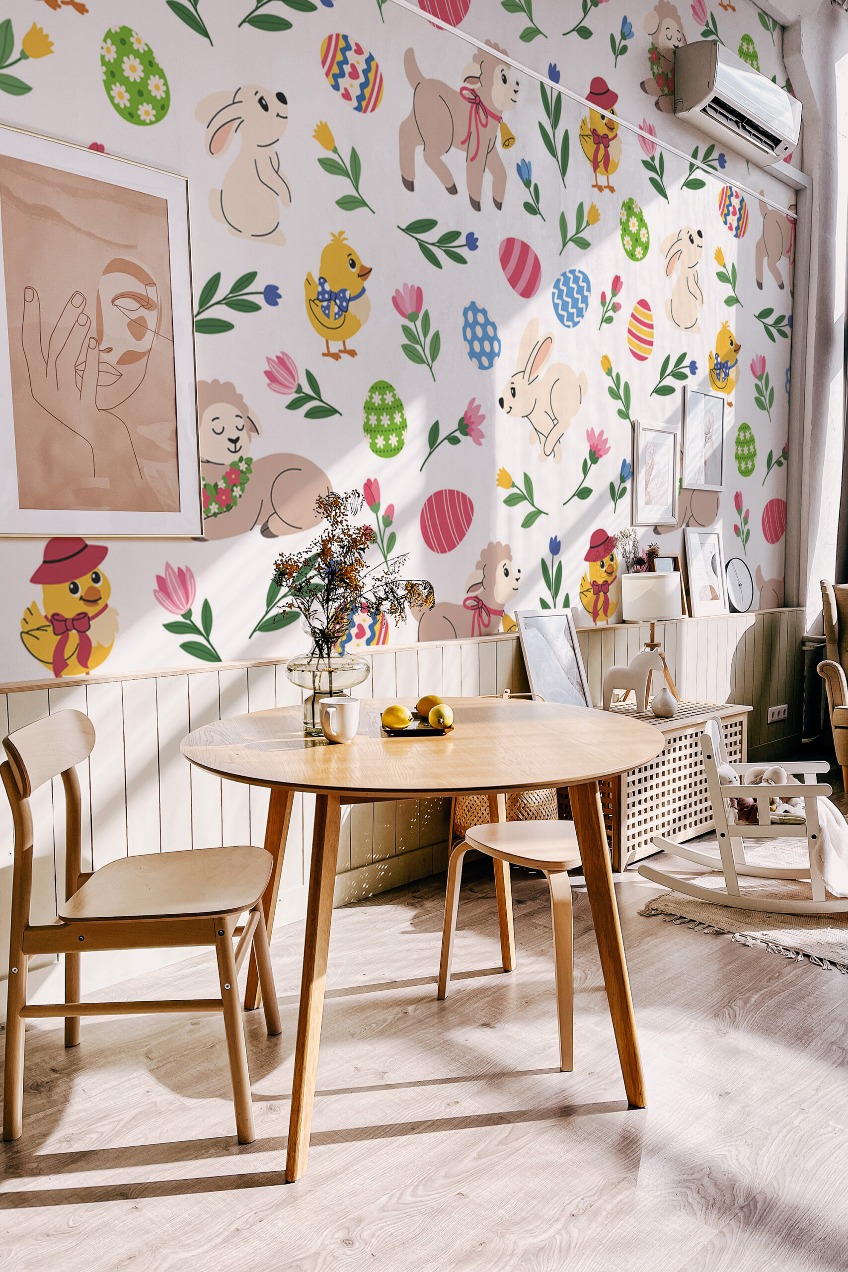 Easter Garden Party peel and stick wall mural installs smoothly as a removable, self-adhesive wallpaper ideal for quick seasonal décor updates, while the traditional non-pasted option offers a classic installation for long-lasting interiors, and Cute Easter Animals mural adds playful personality to nursery and kids room décor. Printed on eco-friendly, PVC-free materials using GreenGuard Gold certified inks, it ensures safe indoor air quality and vibrant long-lasting colors.Wall Mural Highlights