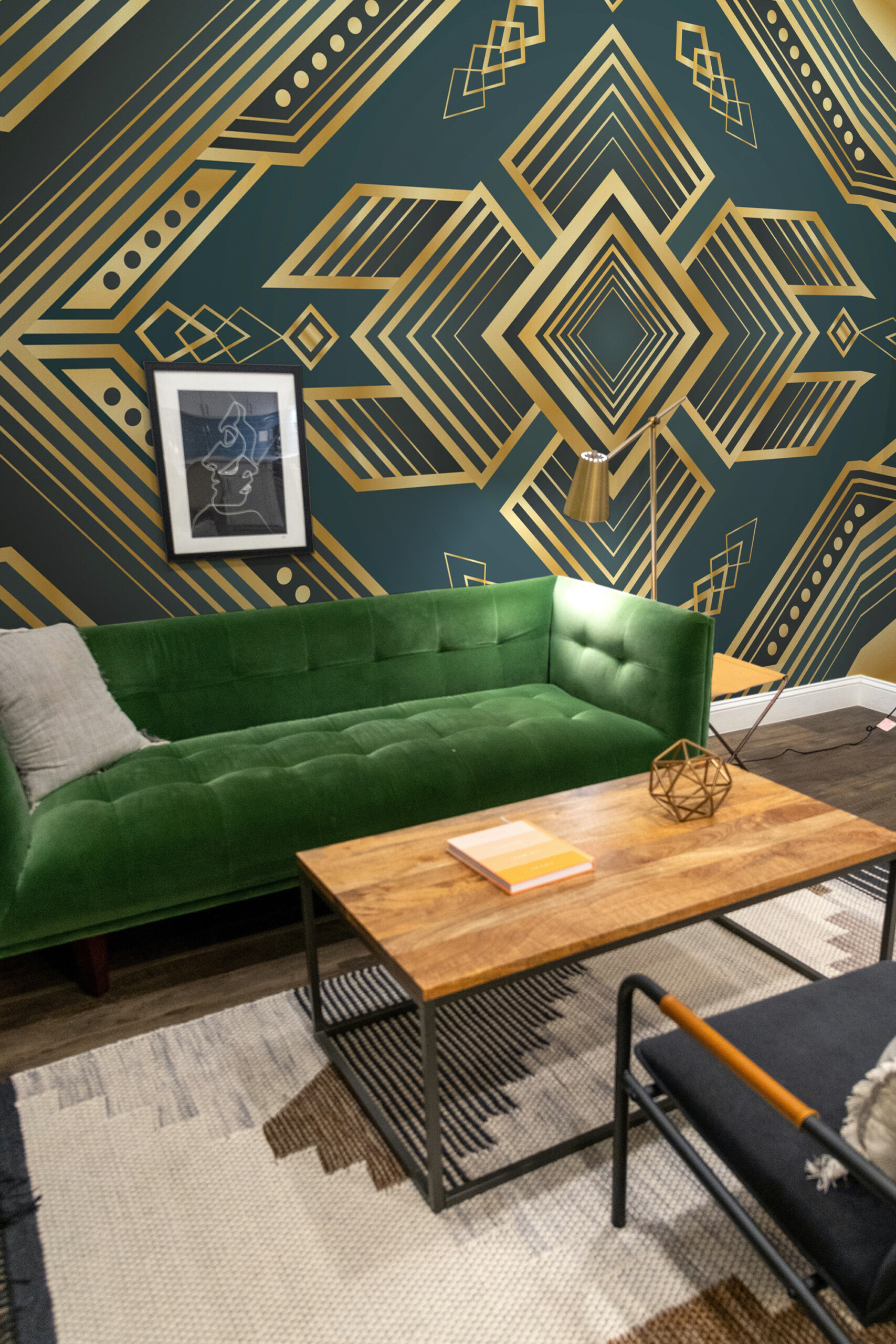 Emerald Deco Rhombus wall mural showcases an Art Deco masterpiece with green and gold geometric shapes, ideal for elegant living spaces or office interiors. This Emerald Deco Rhombus peel and stick wall mural combines bold symmetry and metallic-like accents to create a stunning vintage statement.