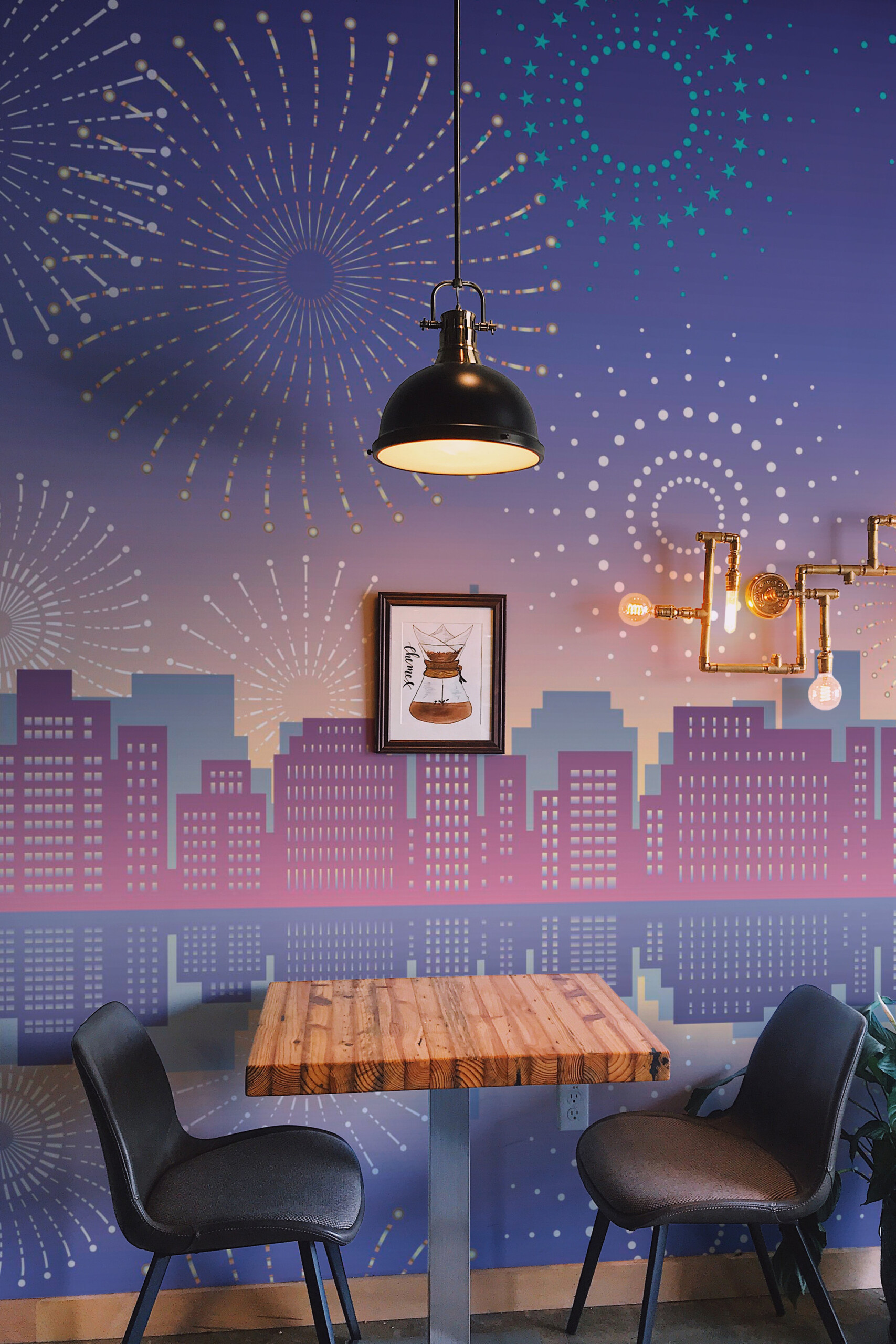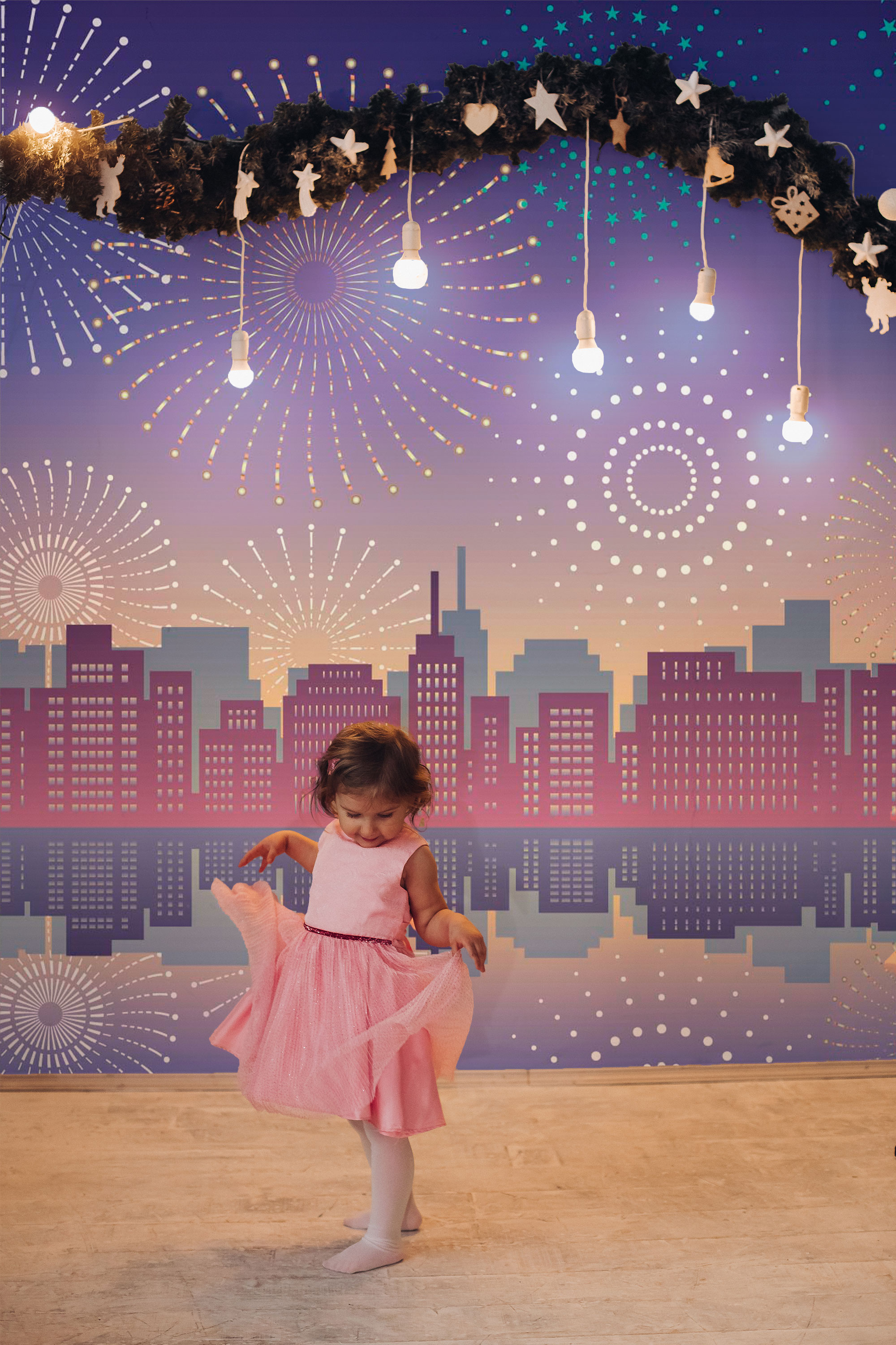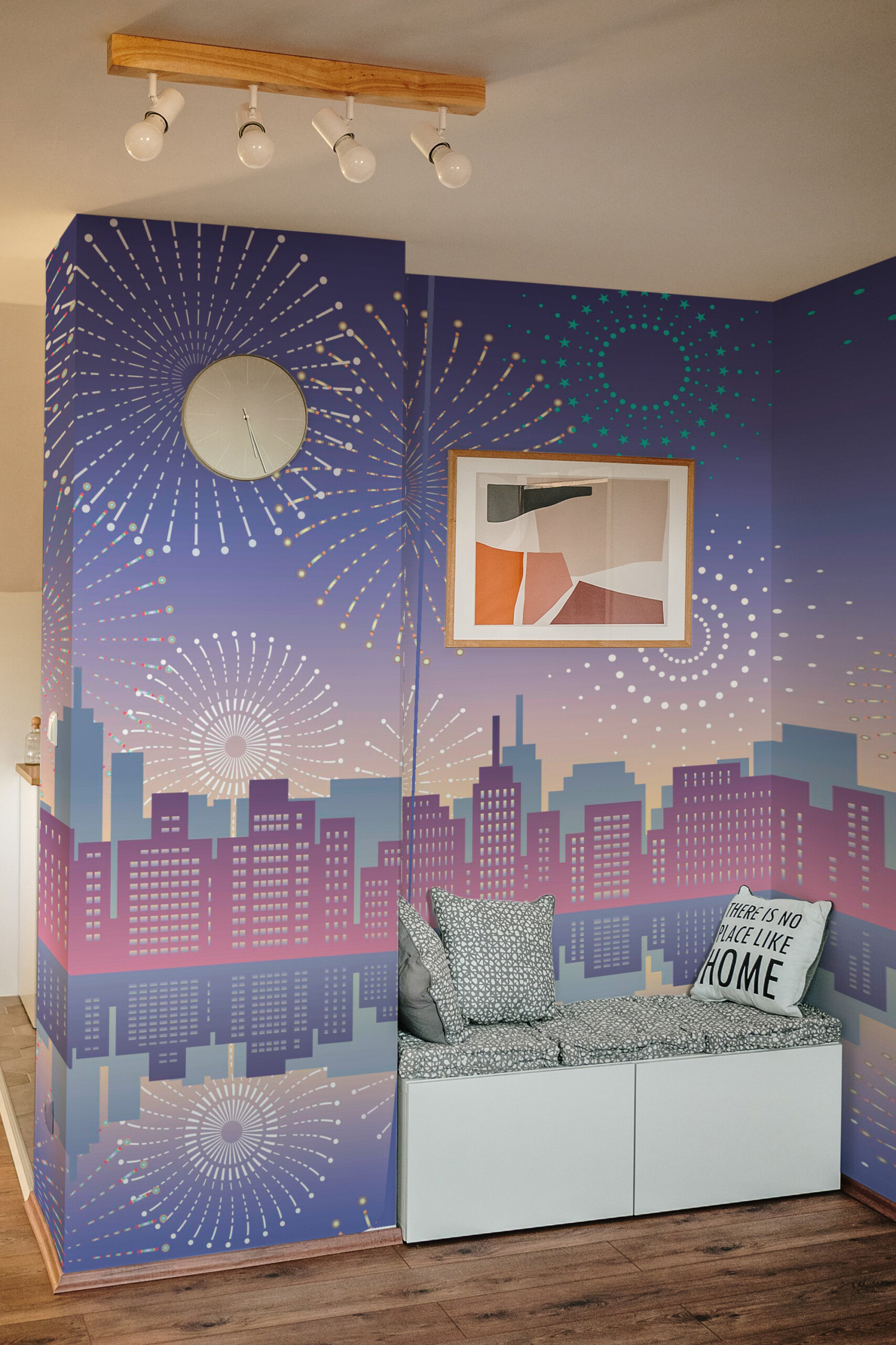 Festive Cityscape wall mural brings a lively metropolitan sparkle to living rooms, creative studios, or entertainment spaces with its purple skyline silhouette, reflected lights, and celebratory fireworks. The glowing geometric shapes create a vibrant holiday-inspired mood that feels modern and energetic.