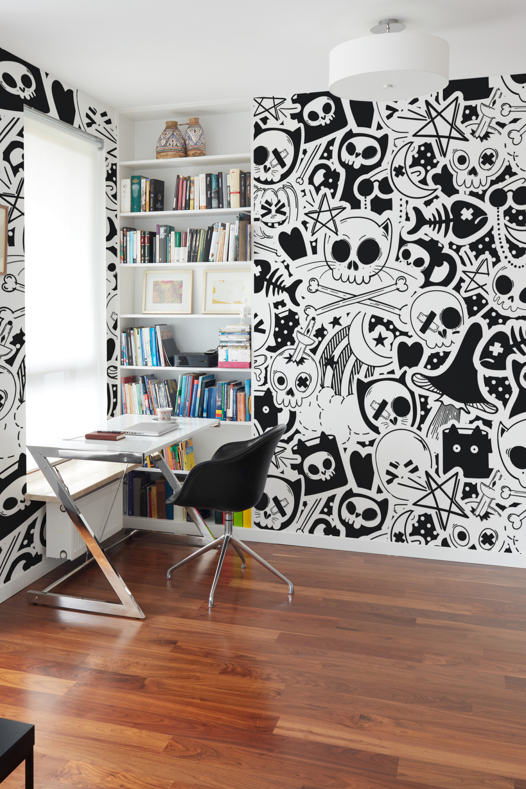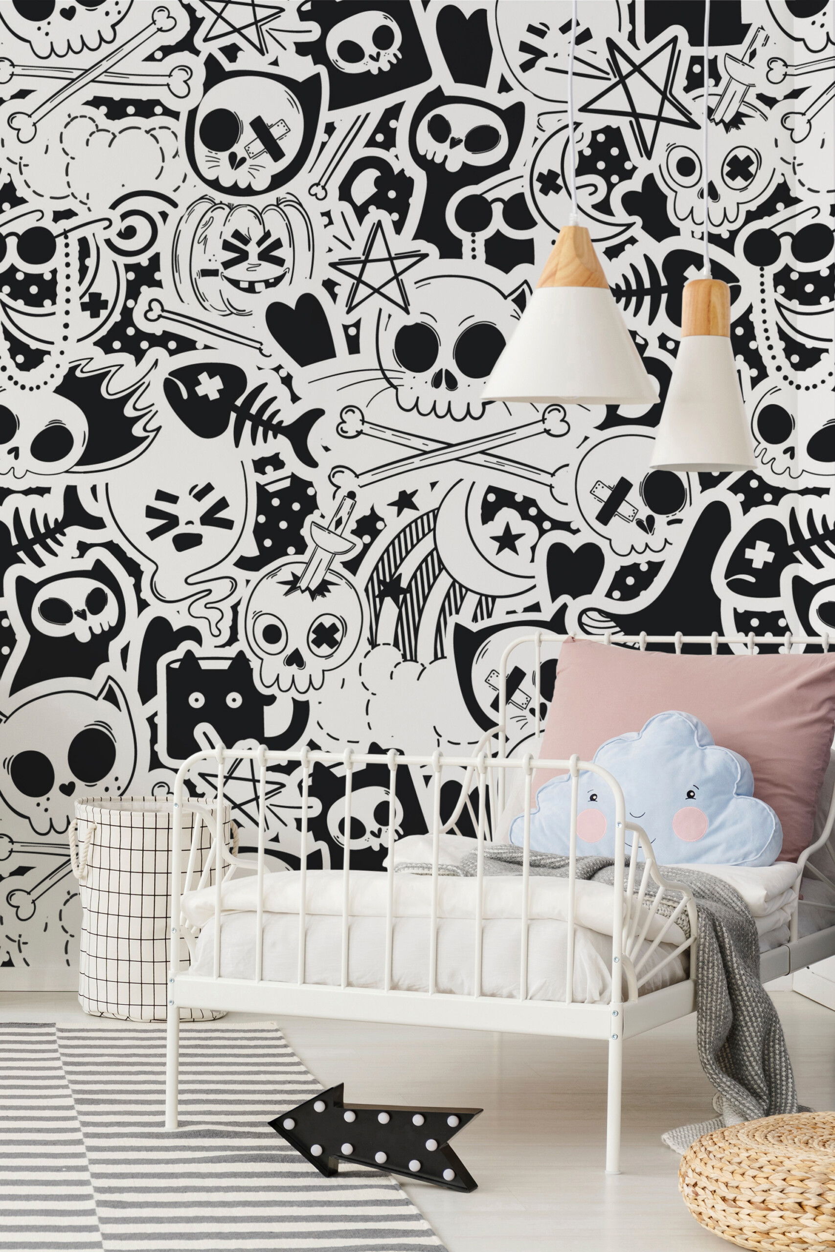 Halloween Graffiti wall mural brings an eclectic and edgy Halloween spirit to your walls with its black and white graffiti pattern of skulls, bones, stars, and ghostly details. Monochrome Spooky Art wall mural offers a fun and rebellious take on traditional Halloween decor, blending bold outlines and playful motifs for a street-art-inspired look.