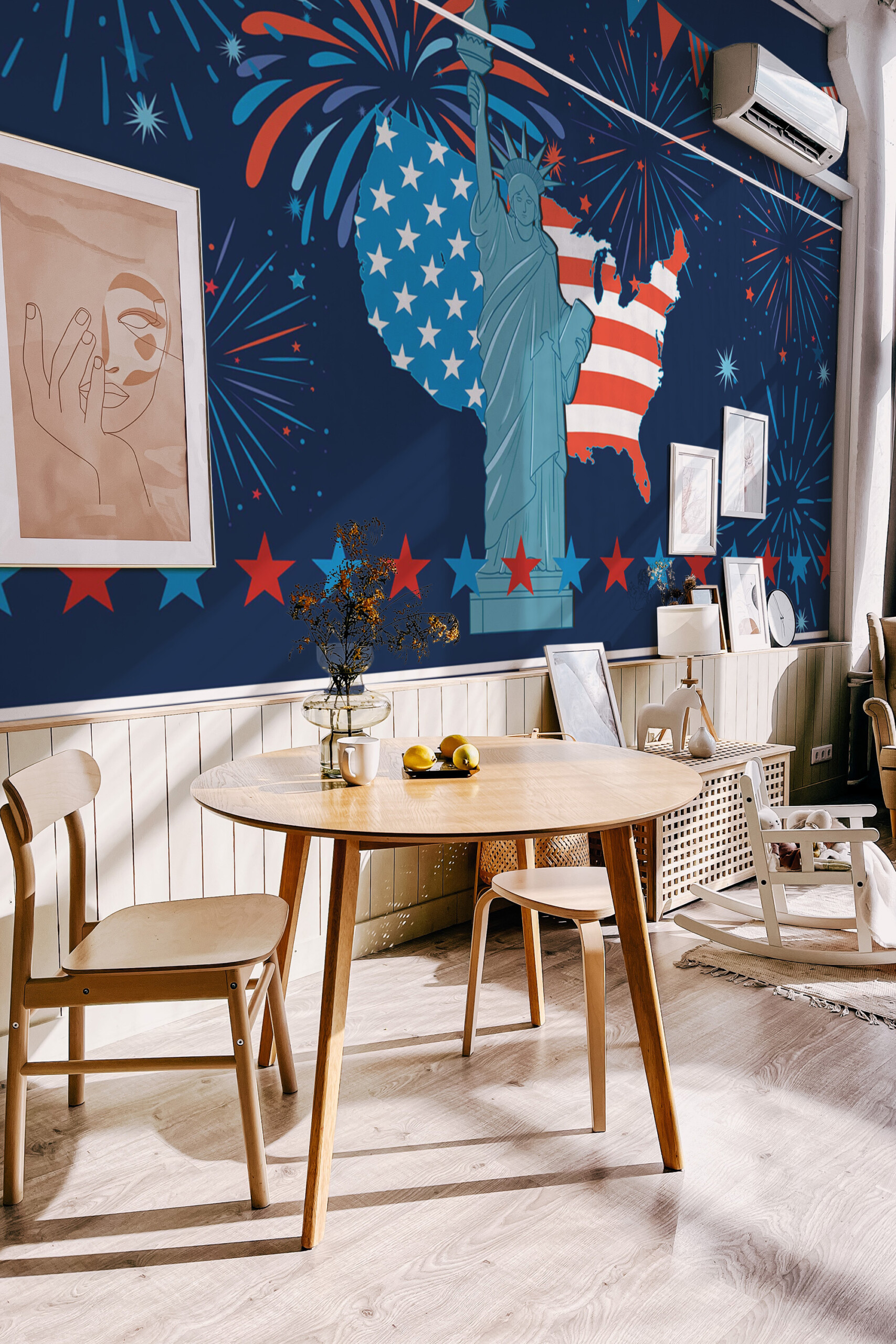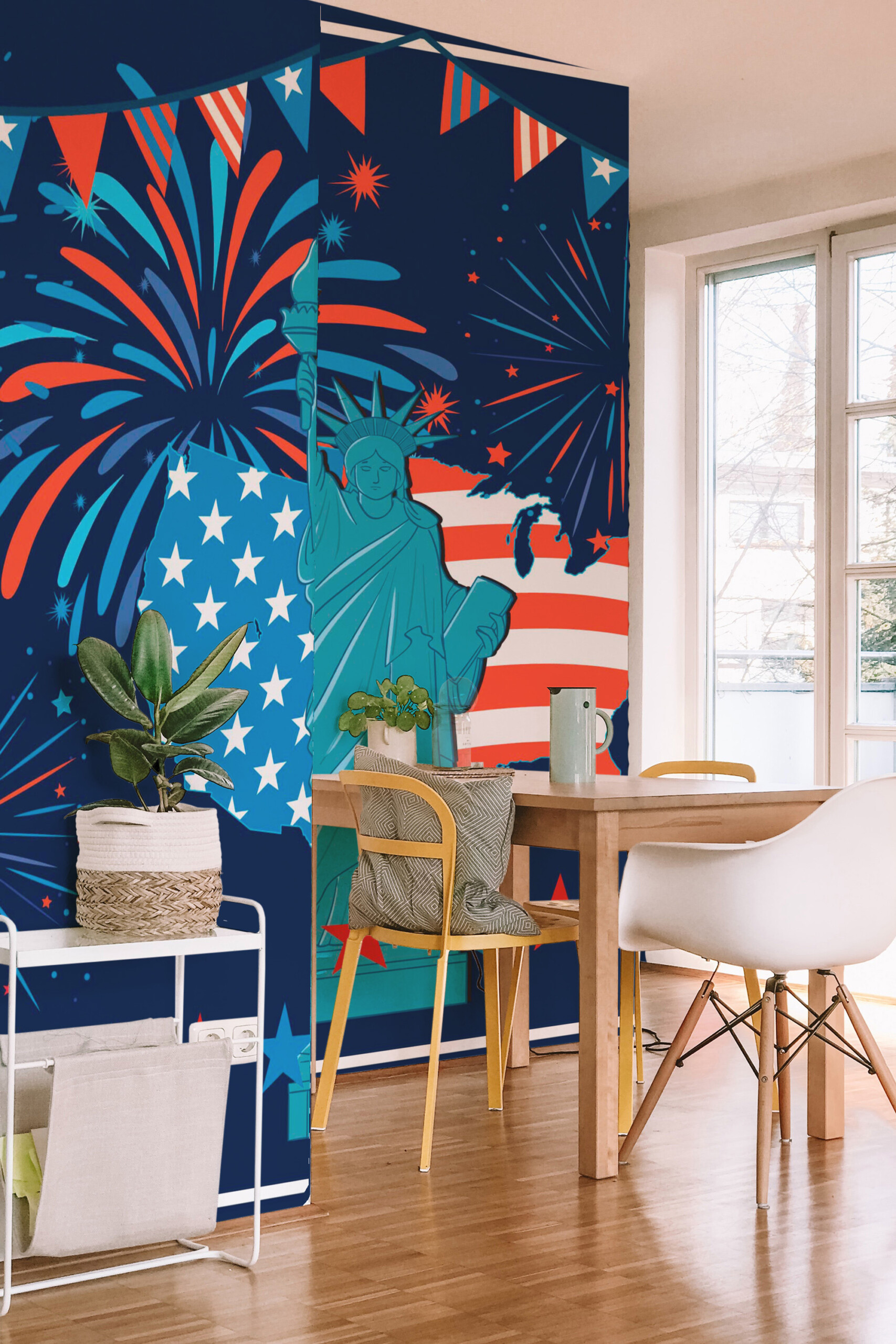 Liberty Fireworks wall mural brings bold patriotic excitement to living rooms, game areas, or festive event spaces with its deep blue backdrop, bright fireworks, and iconic Statue of Liberty silhouette. The lively composition creates an energetic USA-themed atmosphere that instantly enhances any celebratory décor.