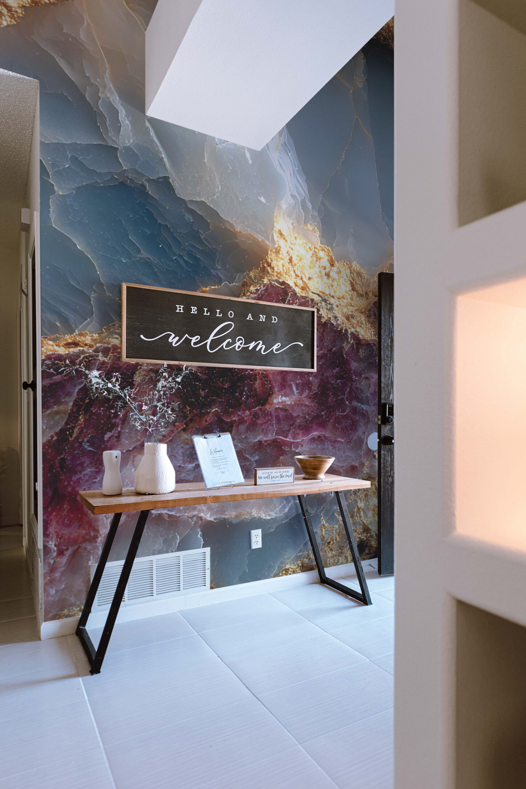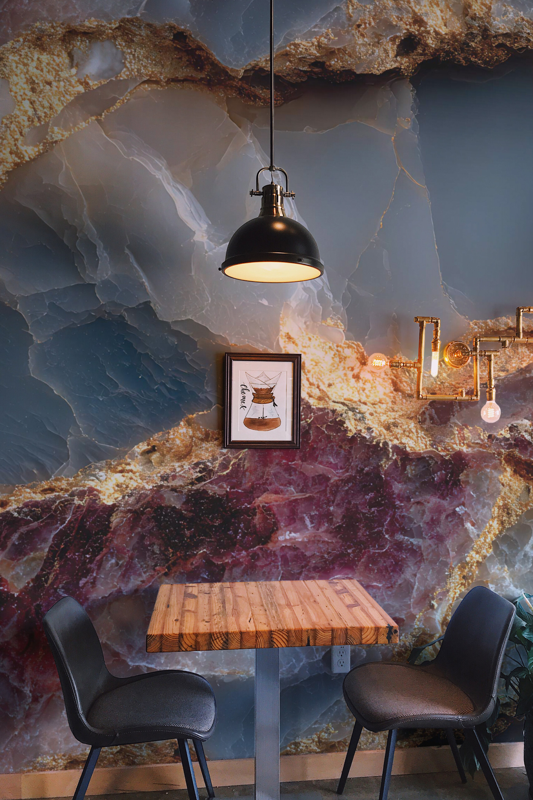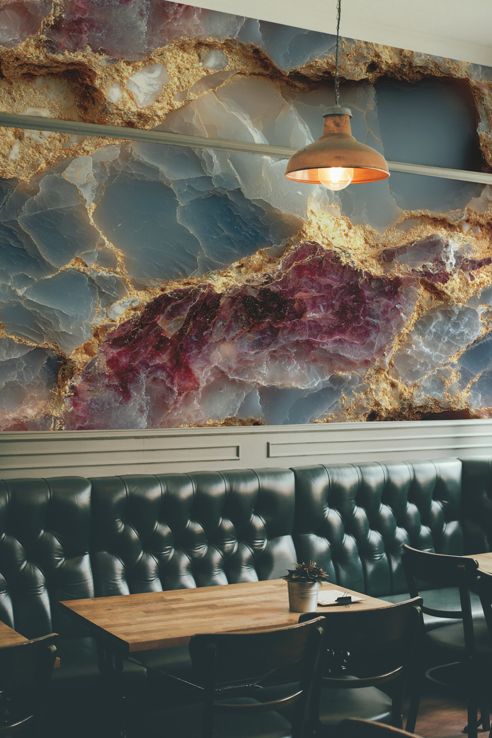 Luxury Gemstone wall mural brings the rich beauty of polished minerals into your space, featuring deep blue, rose, and golden tones intertwined in striking harmony. The design imitates natural gemstone texture, giving your walls the look of luxury stone with radiant metallic highlights. Each detail – veined gold, crystal depth, and luminous color transitions – creates an atmosphere of elegance and sophistication. Ideal for accent walls in living rooms, dining areas, or offices, it adds a refined, modern touch to any décor.