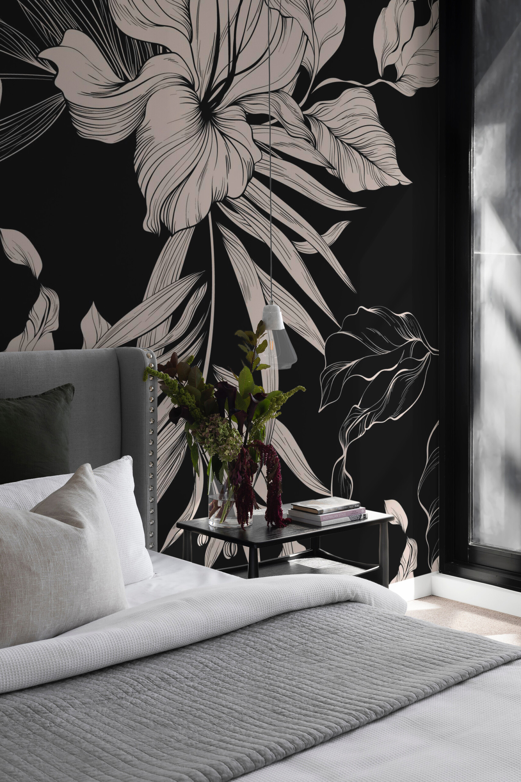 Midnight Floral Garden wall mural creates a dramatic yet refined atmosphere with elegant floral line art set against a deep black background. The flowing botanical forms add movement and sophistication, making it an excellent choice for bedrooms, dining areas, living rooms, or boutique-style interiors that embrace bold décor.