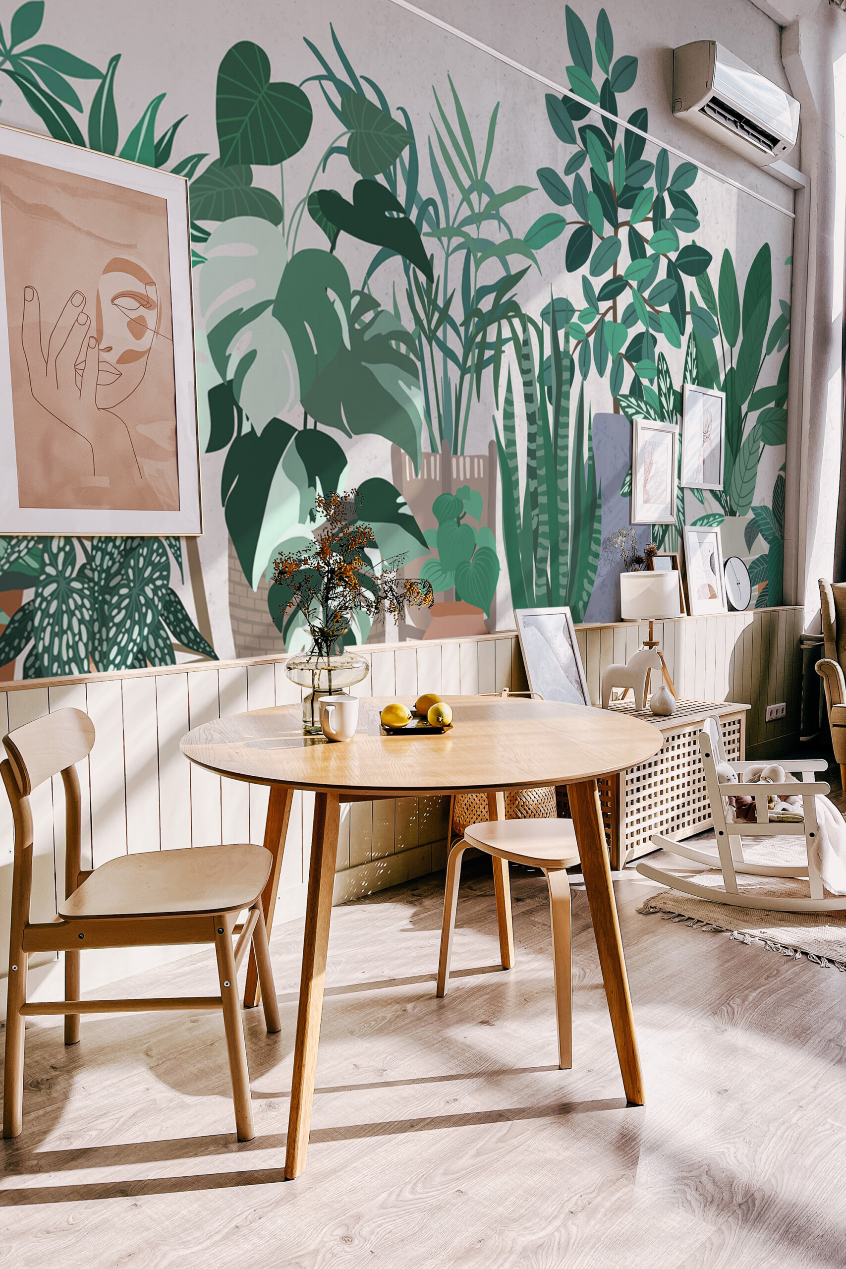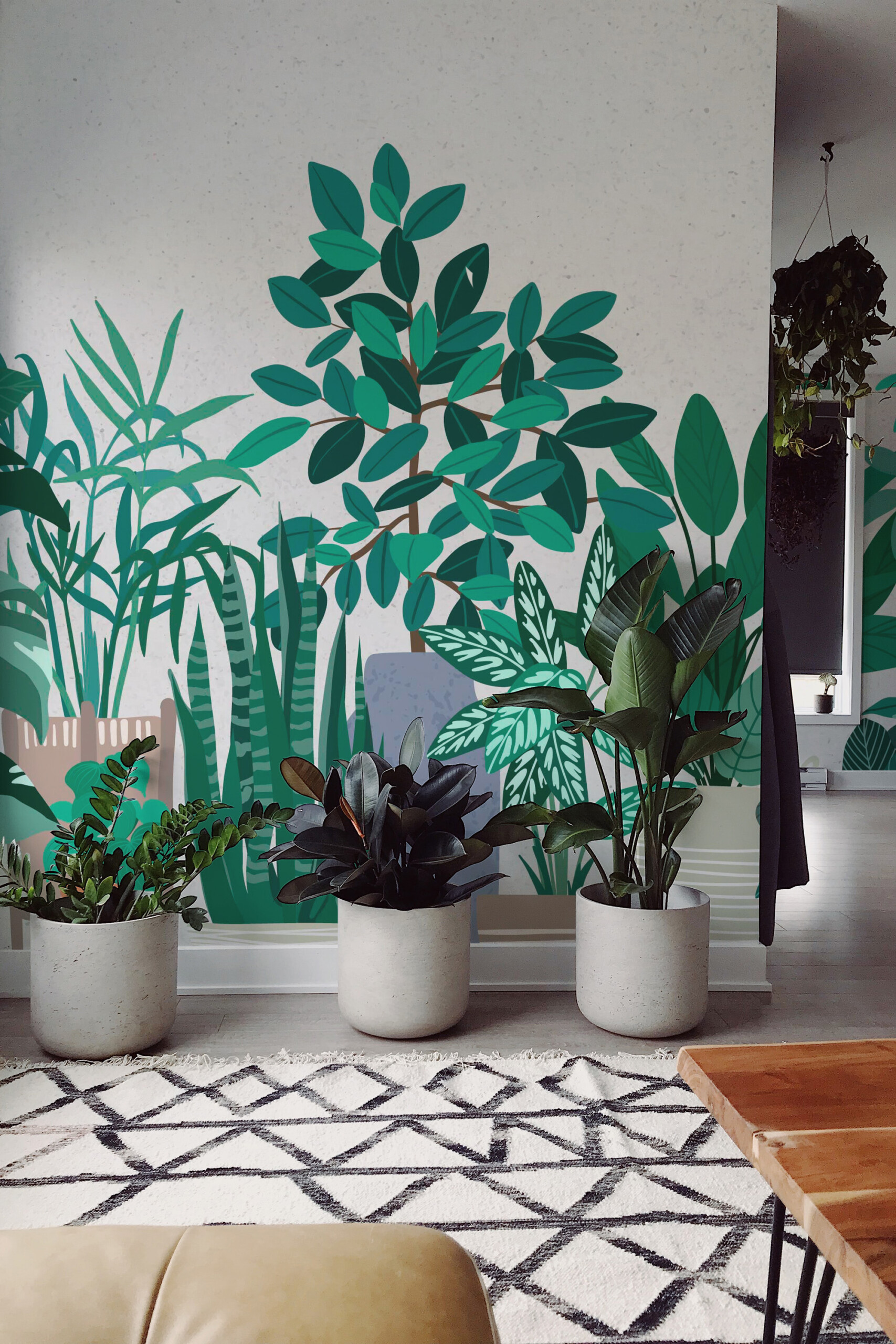 Modern Office Jungle peel and stick wall mural installs easily as a removable, self-adhesive wallpaper, while a traditional non-pasted option is also available for classic application. Indoor Plant Studio mural adds a contemporary botanical touch to workspaces and creative environments. Printed on eco-friendly, PVC-free materials using GreenGuard Gold certified inks, it ensures safe indoor air quality and lasting color.Wall Mural Highlights