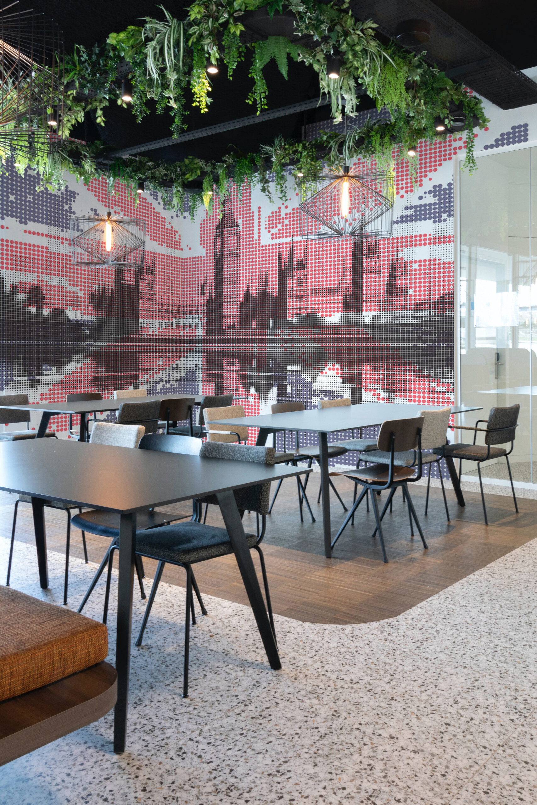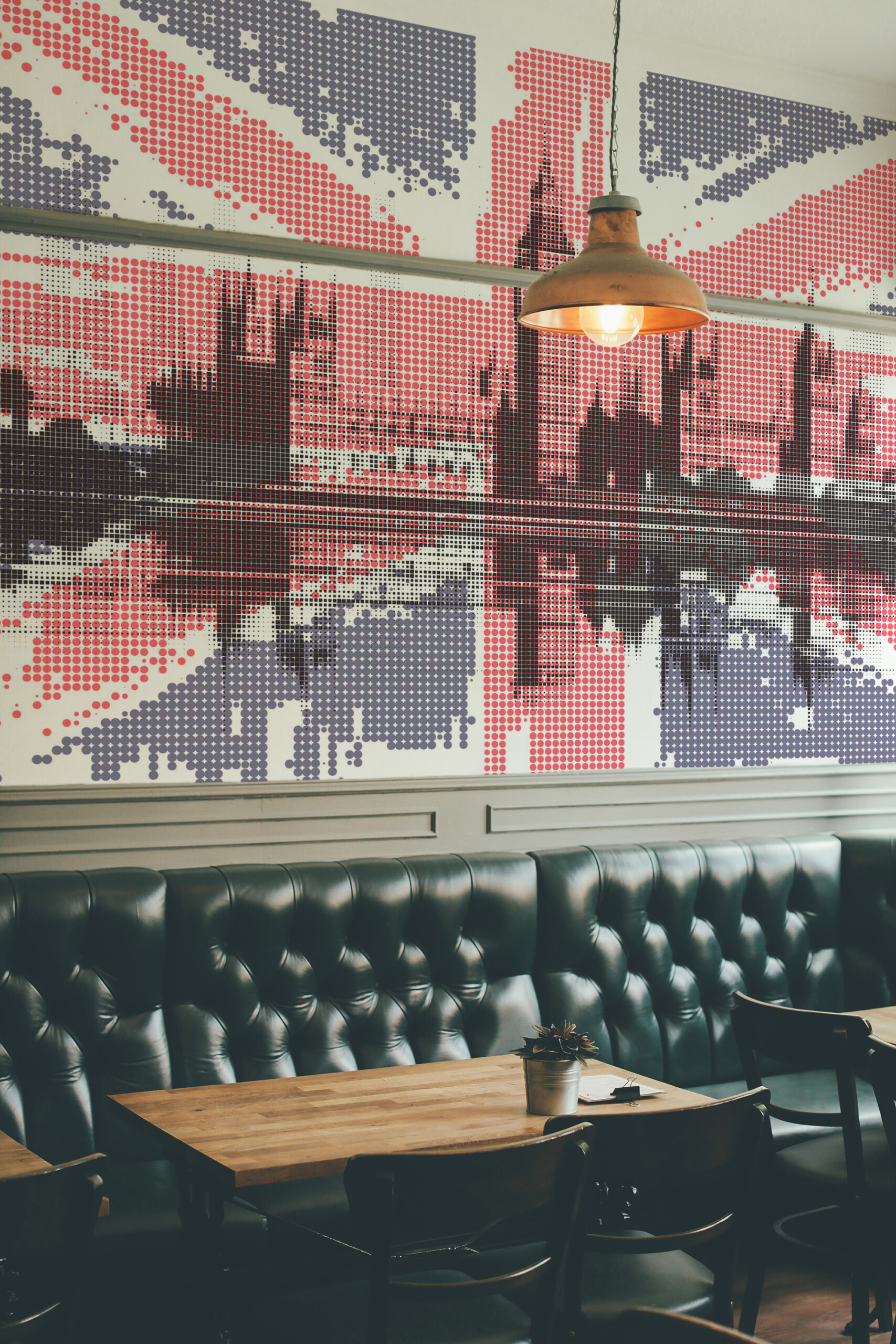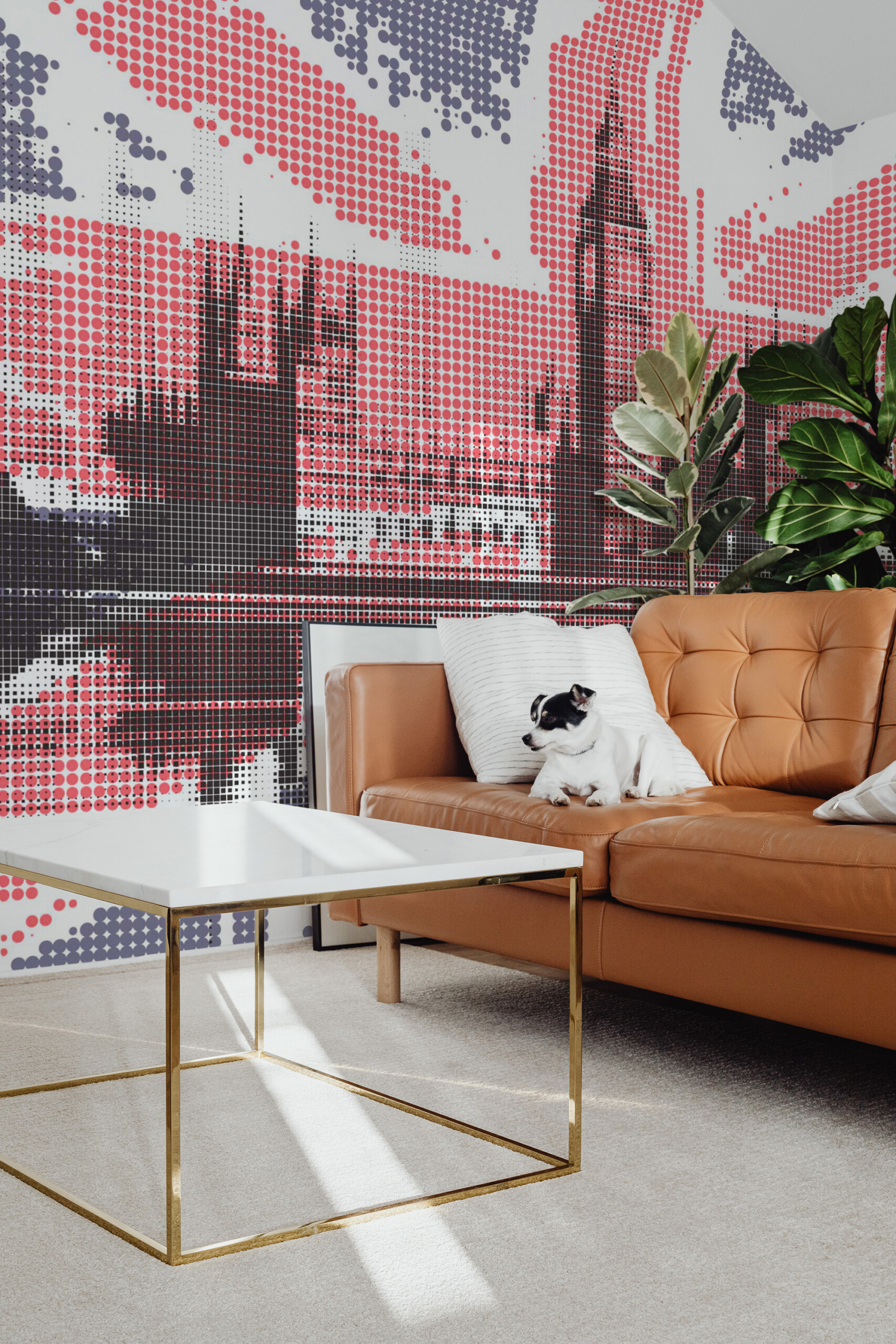 Mosaic London Skyline wall mural brings bold modern character to living rooms, offices, or creative spaces with its red dotted Union Jack backdrop and striking black London silhouette. The geometric mosaic design adds vibrant energy and a contemporary edge, creating a stylish focal point that works beautifully in urban or minimalist interiors.