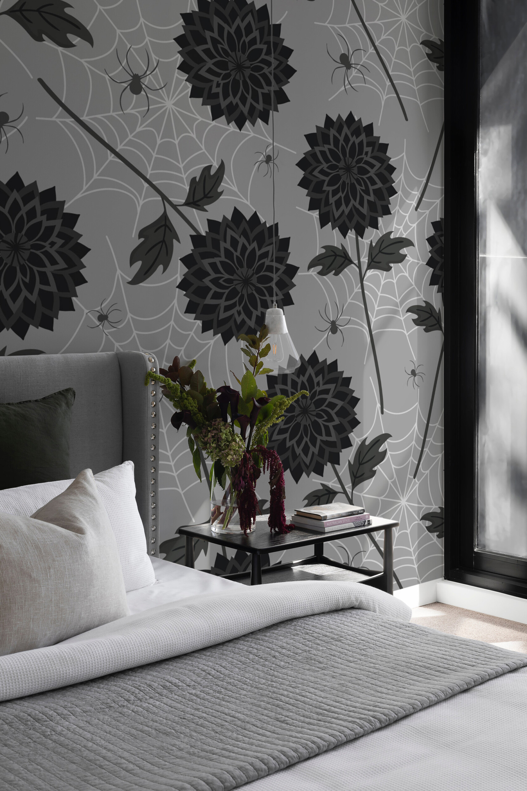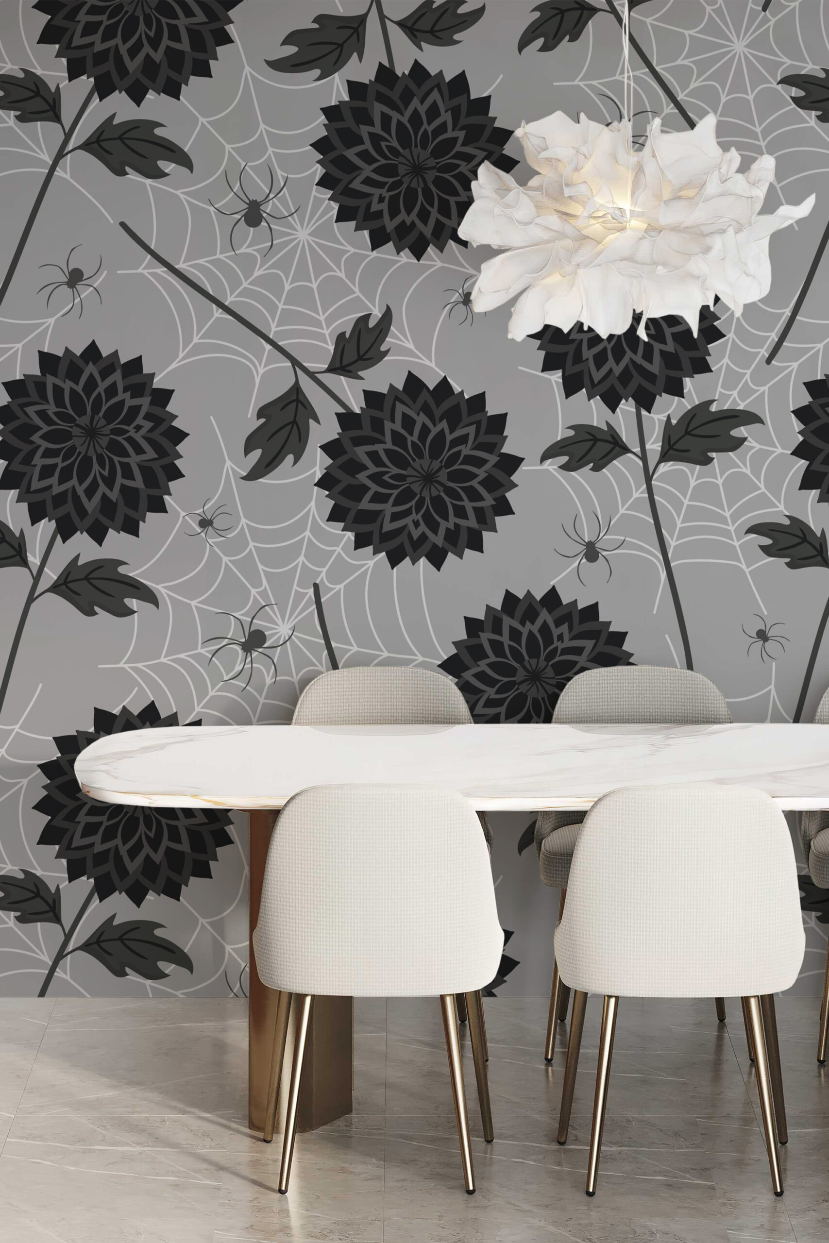 Noir Blooms and Spiders wall mural brings a darkly romantic touch to your space with its bold black flowers, delicate cobwebs, and tiny spiders set against a smooth grey-beige background. Gothic Dark Floral wall mural captures the perfect balance between elegance and intrigue, creating a statement piece that suits bedrooms, creative studios, or modern gothic interiors.