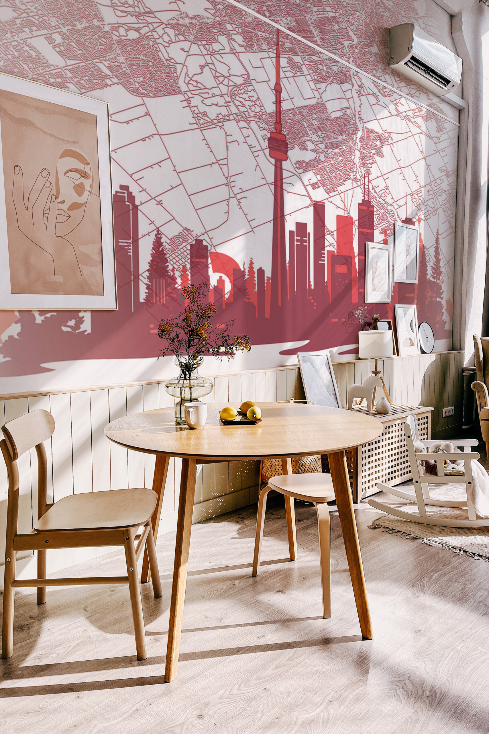 Ottawa Map Skyline wall mural brings artistic city charm to home offices, living rooms, or creative studios with its deep red line-art map of Canada’s capital and minimalist skyline silhouette in the foreground. The layered cartographic details and stylized buildings create a modern, design-forward focal point that adds depth and quiet energy to any feature wall.