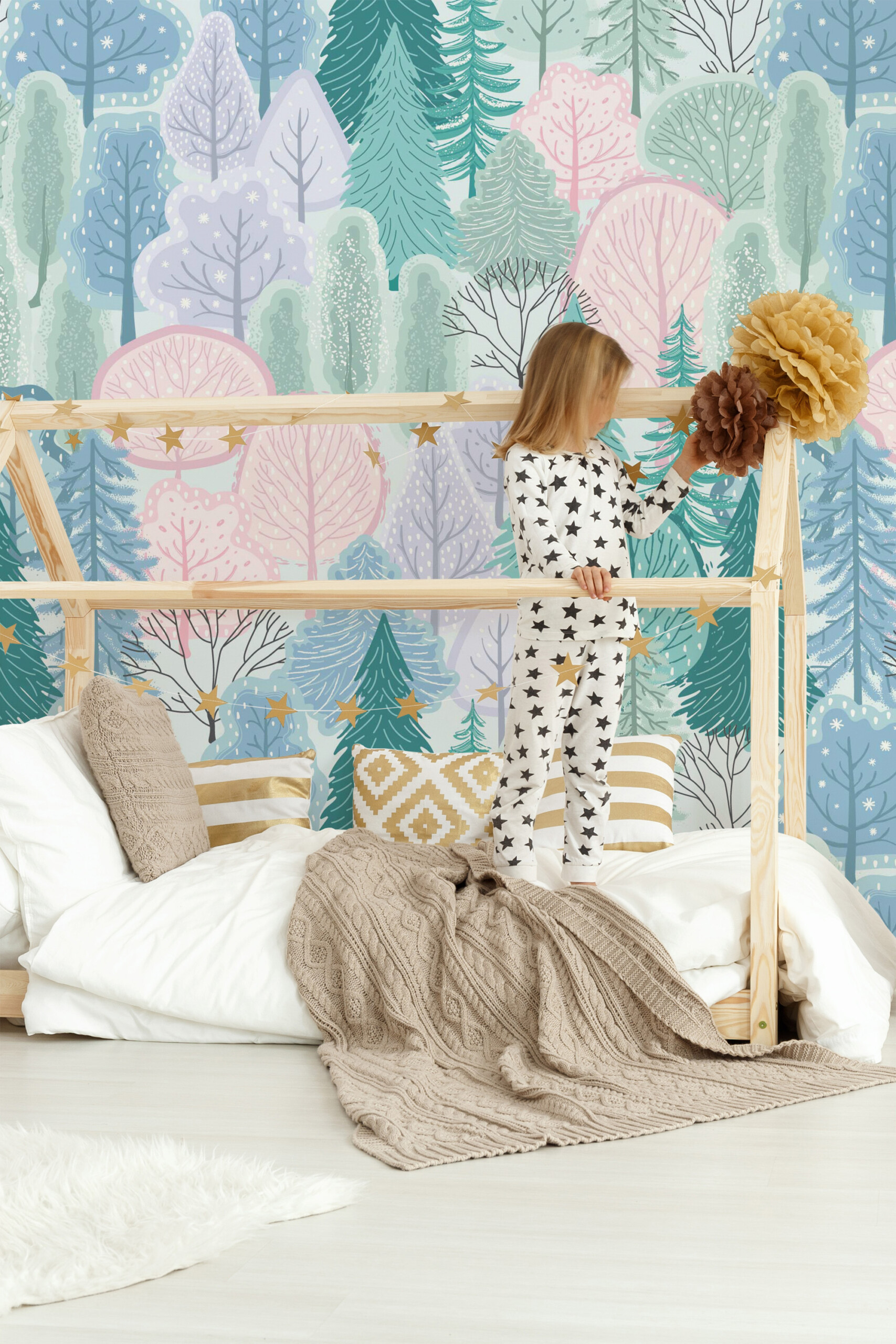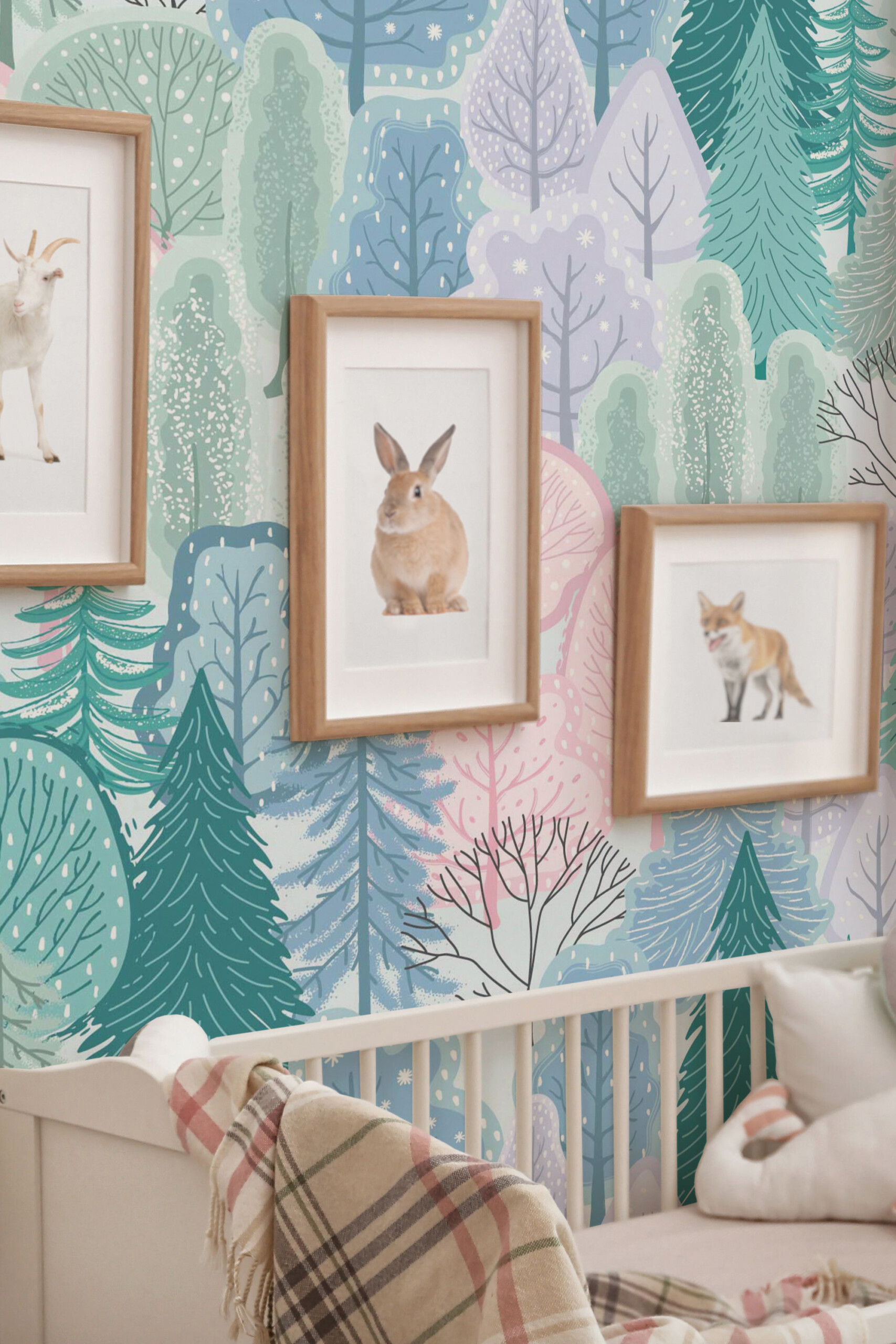 Pastel Woodland wall mural brings a calm, dreamy forest atmosphere to your nursery with soft pink, mint, and lavender tones. Hand-drawn trees—pines, birches, and leafy woodland shapes—form a layered, whimsical landscape that feels playful yet peaceful. Gentle pastel shading and snowy accents create a sense of wonder and serenity, perfect for both boys’ and girls’ rooms.
