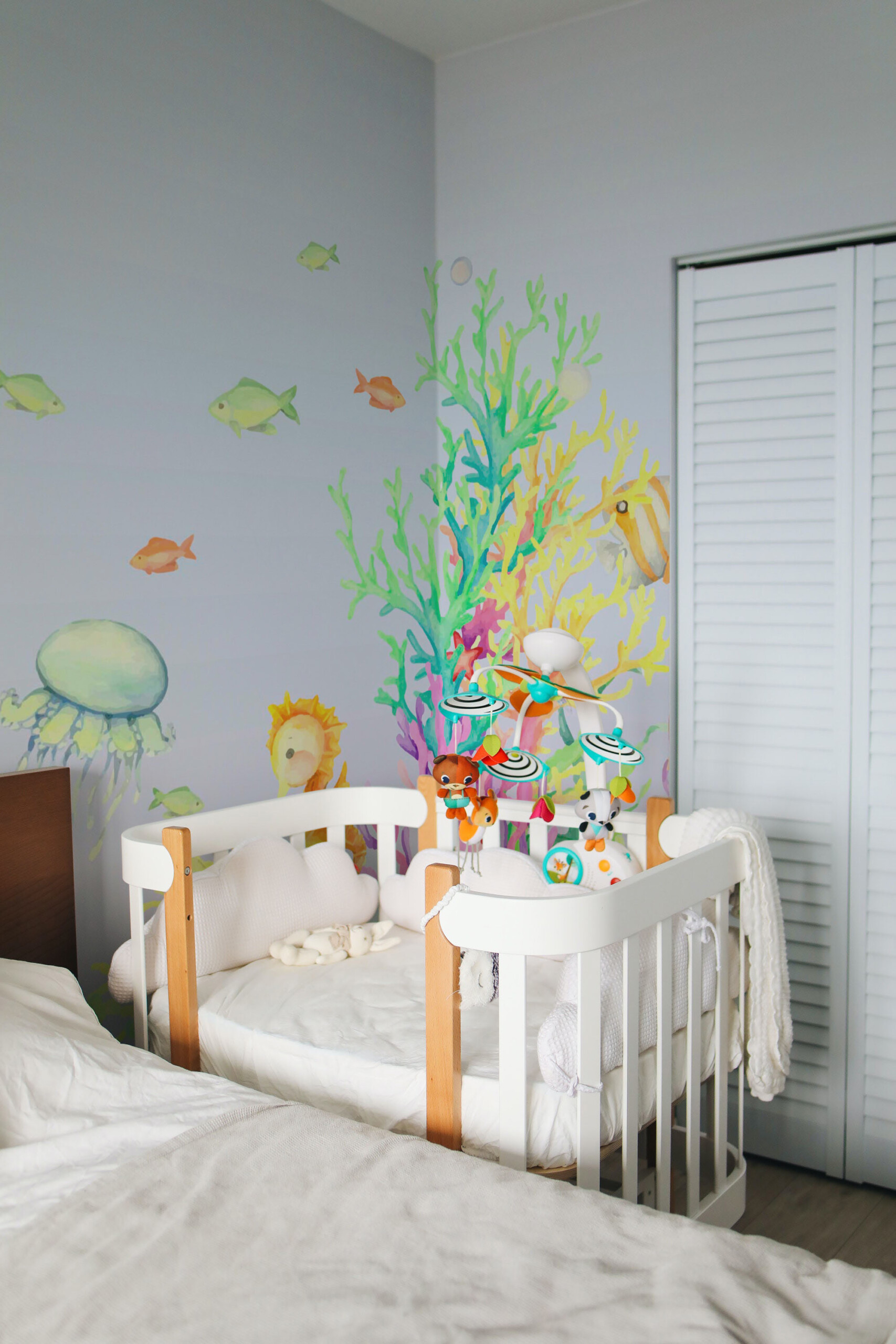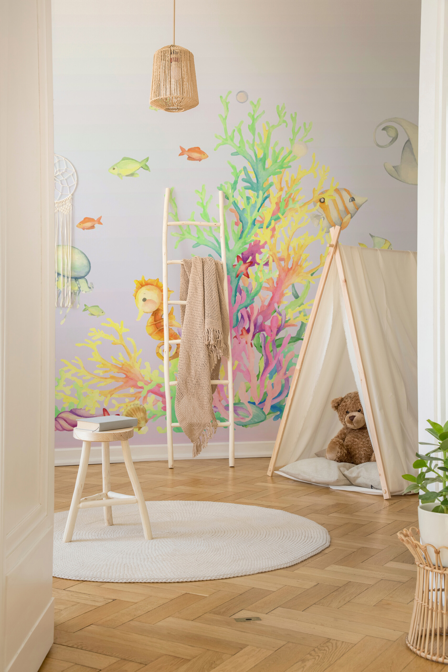 Playful Undersea Friends wall mural brings ocean magic to your nursery with cheerful watercolor sea creatures, coral gardens, and soft pastel tones. Smiling seahorses, jellyfish, and fish swim through aqua and coral hues, creating a lively underwater scene full of joy and curiosity. The gentle gradients and friendly characters spark imagination, making it perfect for nurseries, playrooms, or children’s bedrooms.
