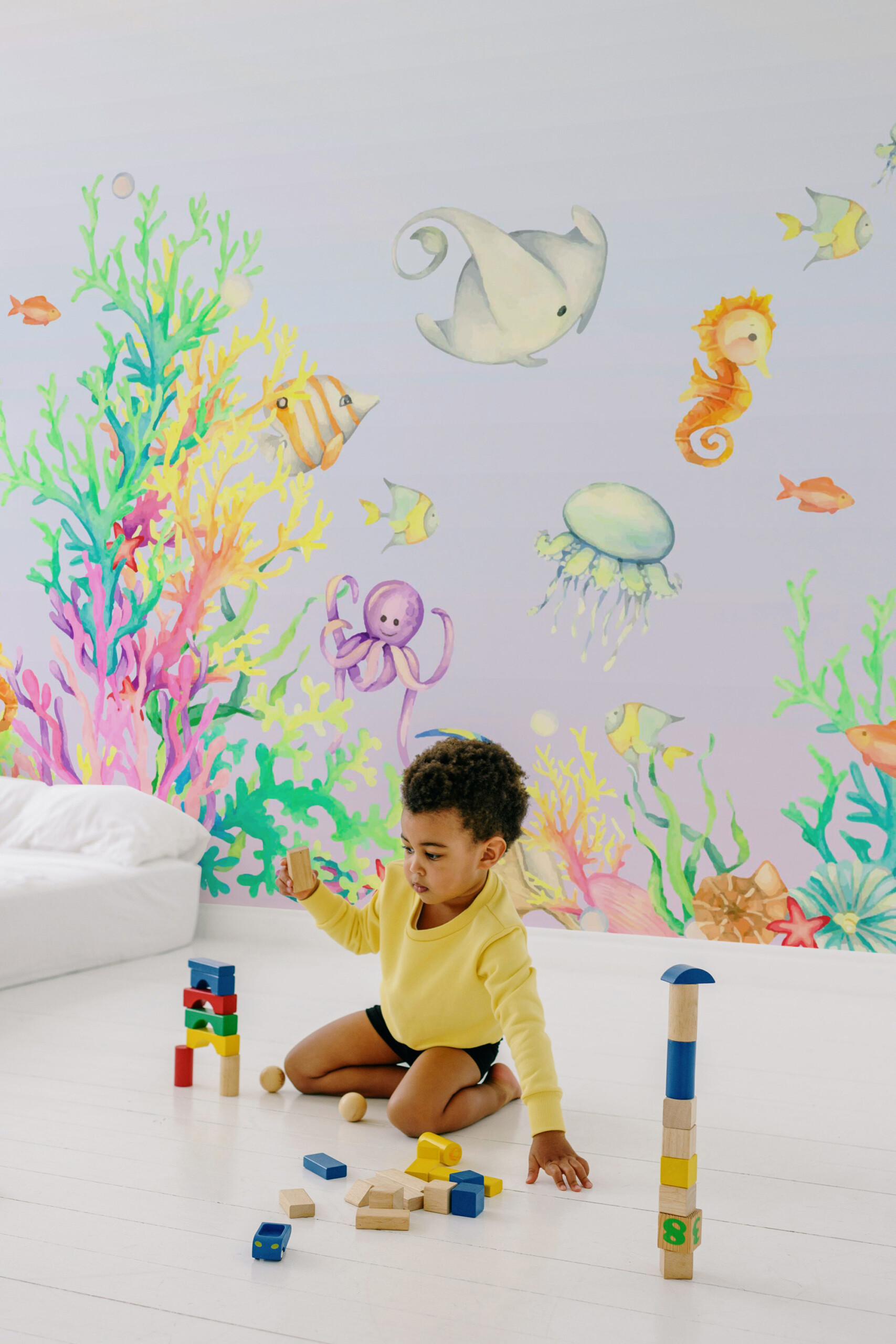 This Playful Undersea Friends peel and stick wall mural installs easily and removes cleanly without damage. Watercolor Underwater Creatures wall mural uses PVC-free, eco-friendly materials and GreenGuard Gold certified inks for vivid color and safe indoor air. It creates a soothing, ocean-themed décor that feels playful and bright.Wall Mural Highlights