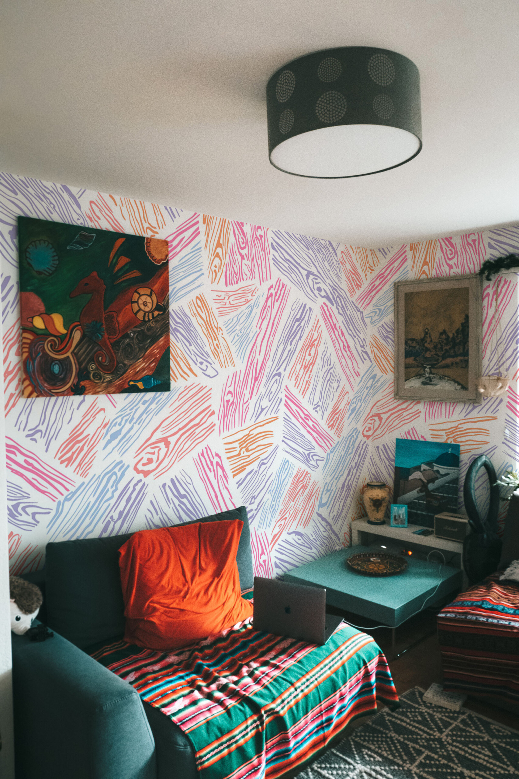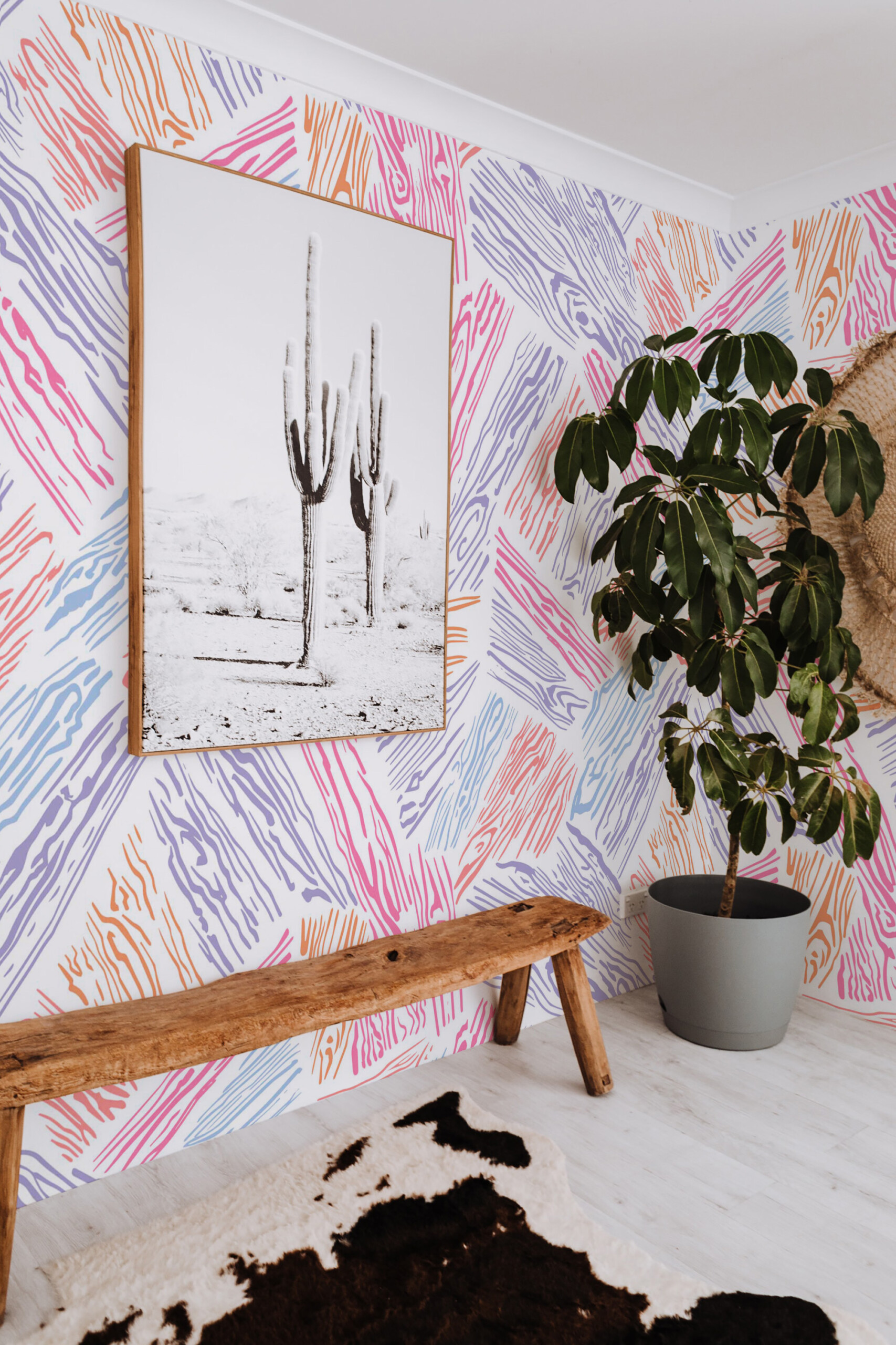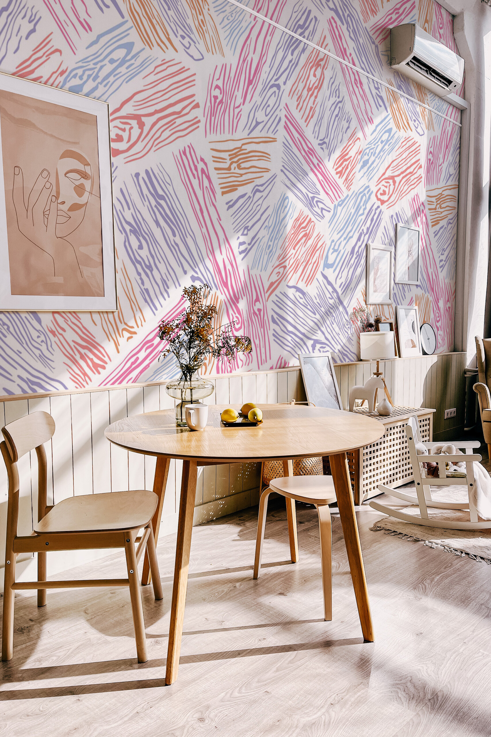 Playful Wood Contours peel and stick wall mural installs smoothly as a removable, self-adhesive wallpaper, while a traditional non-pasted option is also available for classic application. Colorful Wood Line Art mural adds personality and movement to contemporary décor. Printed on eco-friendly, PVC-free materials using GreenGuard Gold certified inks, it ensures safe indoor air quality and long-lasting color.Wall Mural Highlights