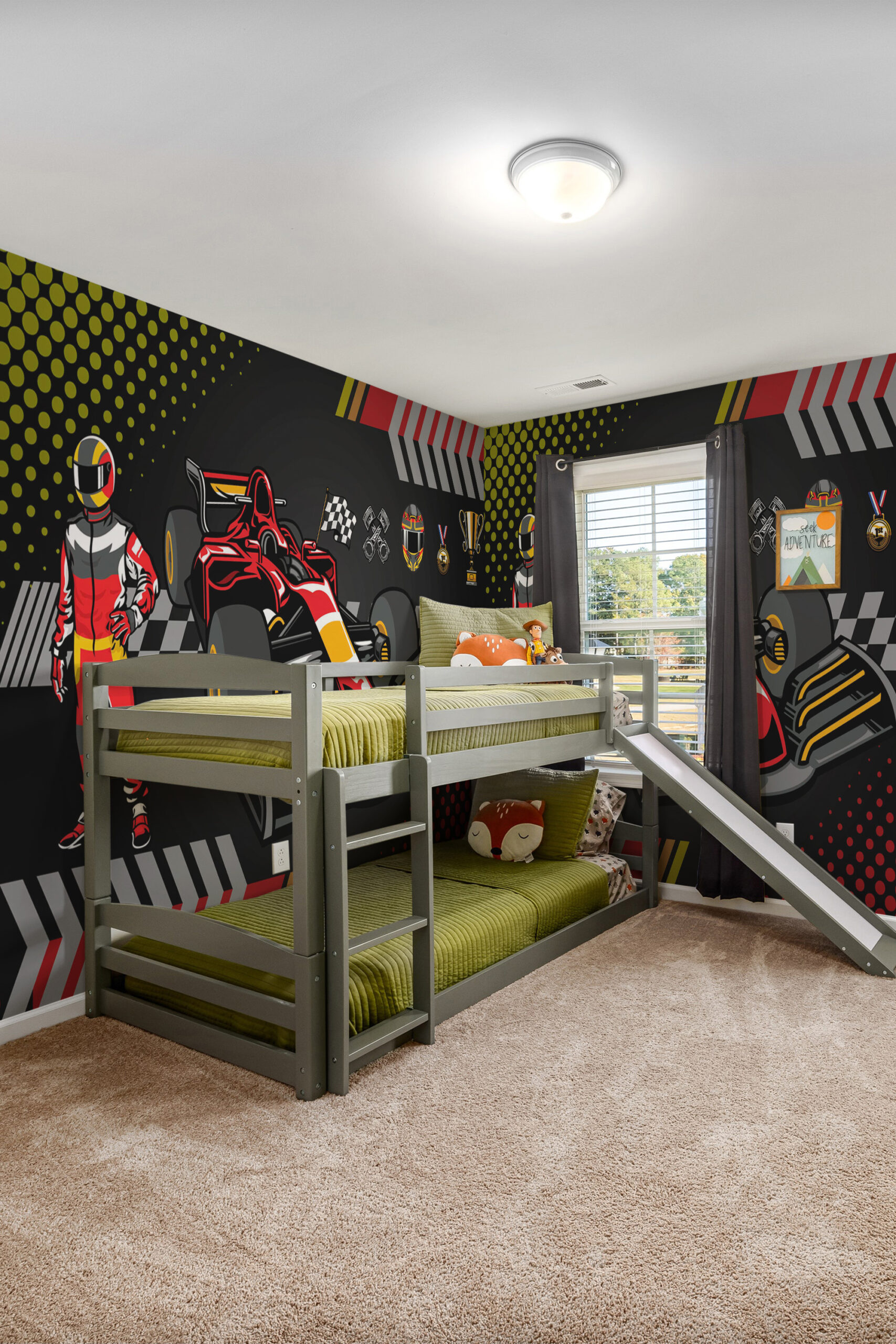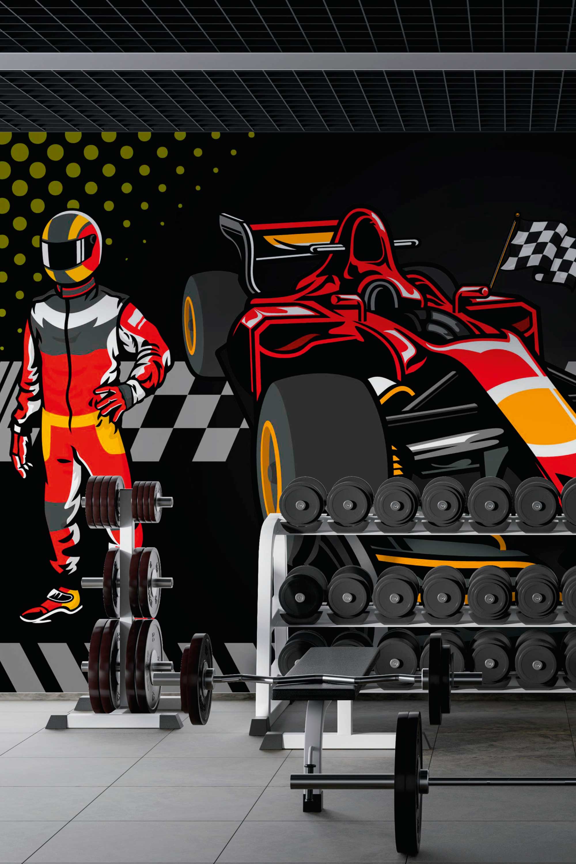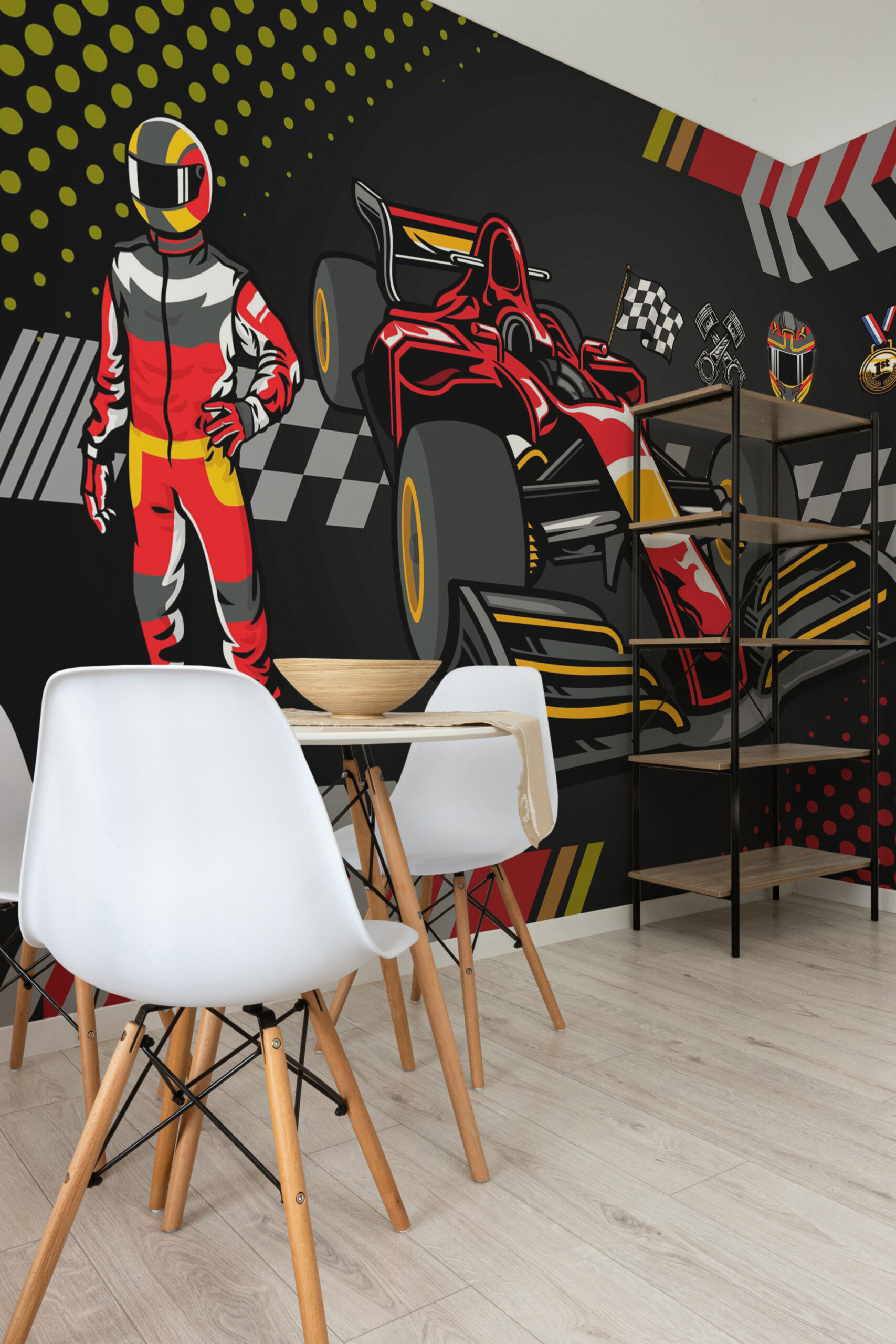 This bold motorsport wall mural adds a winner’s vibe without feeling too busy. We print it to your exact wall size, and you can choose non-pasted, pre-pasted, or peel and stick wallpaper, all PVC-free with GreenGuard inks. Measure your wall, pick your material, then enter your dimensions to order.