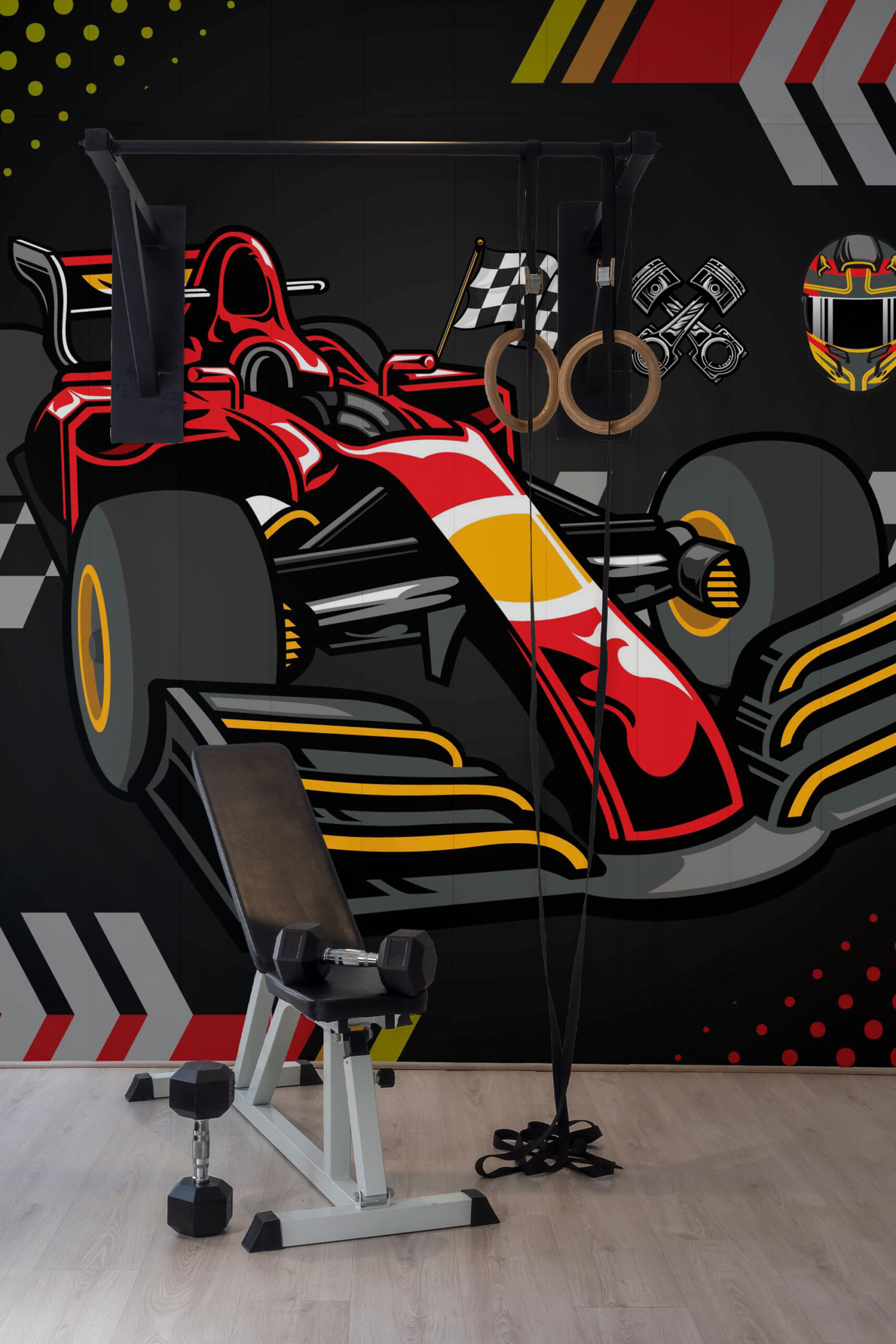 Red Formula Racing Wall Mural brings fast, bold energy to a kids room in a clean modern style. The deep dark background makes the bright reds, whites, and yellow accents pop. It instantly turns a plain wall into a sporty backdrop for play and big dreams. Use it behind a bed, desk, or toy area for an exciting focal point.