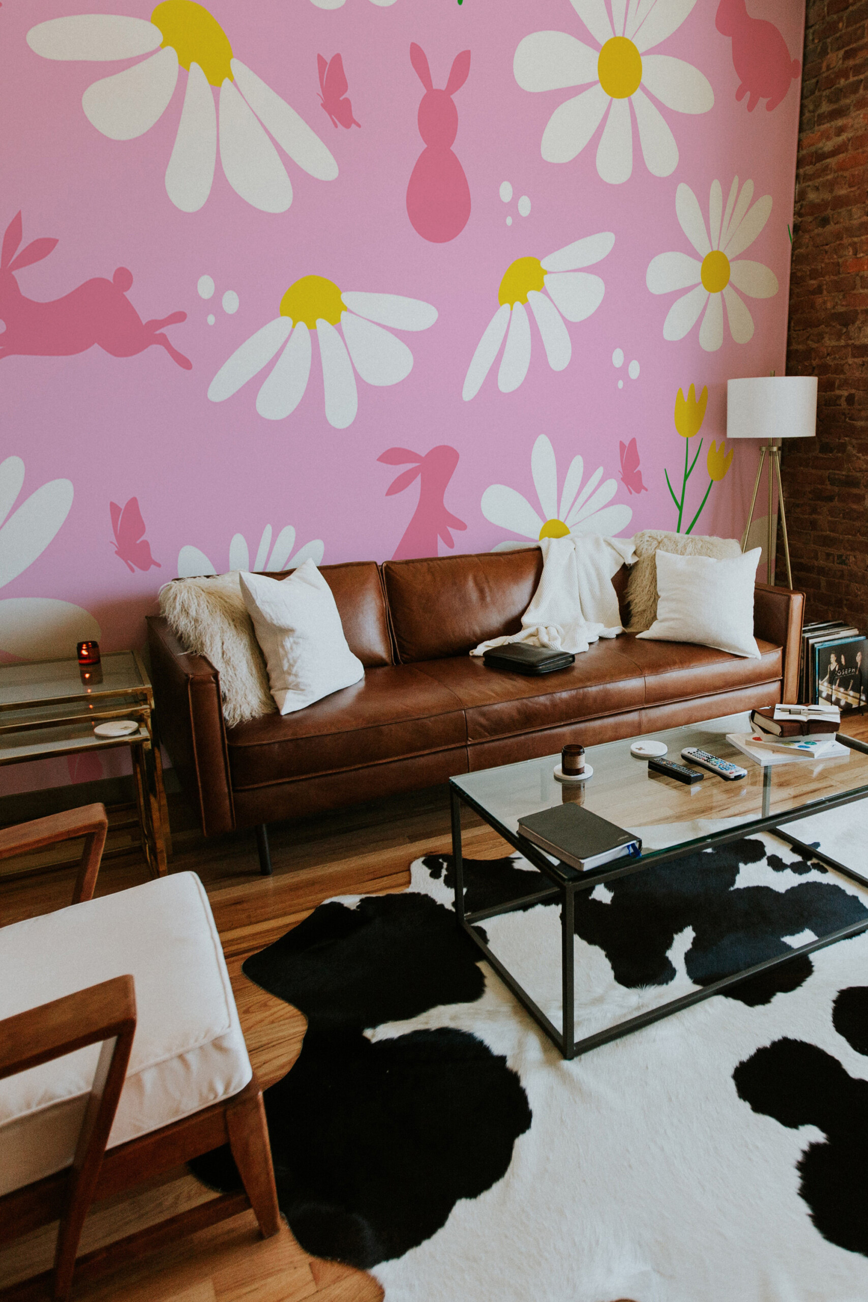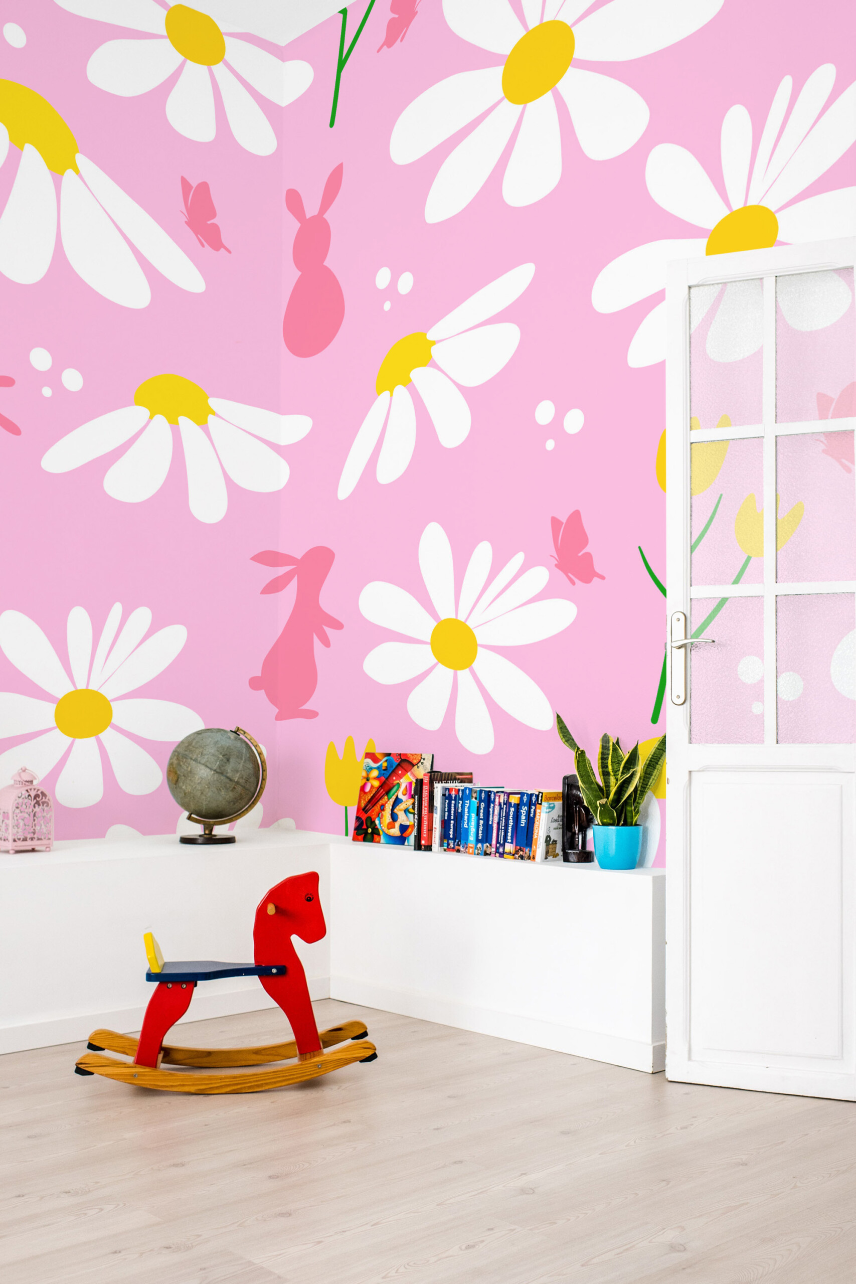 Spring Bunny Meadow wall mural features playful bunny silhouettes hopping among large blooming daisies, delicate butterflies, and cheerful spring flowers on a soft pink background, creating a lighthearted floral pattern that brings joyful springtime charm and gentle color to nurseries, kids rooms, playrooms, and seasonal interiors, while also making a lovely decorative accent for Easter celebrations and festive spring décor.