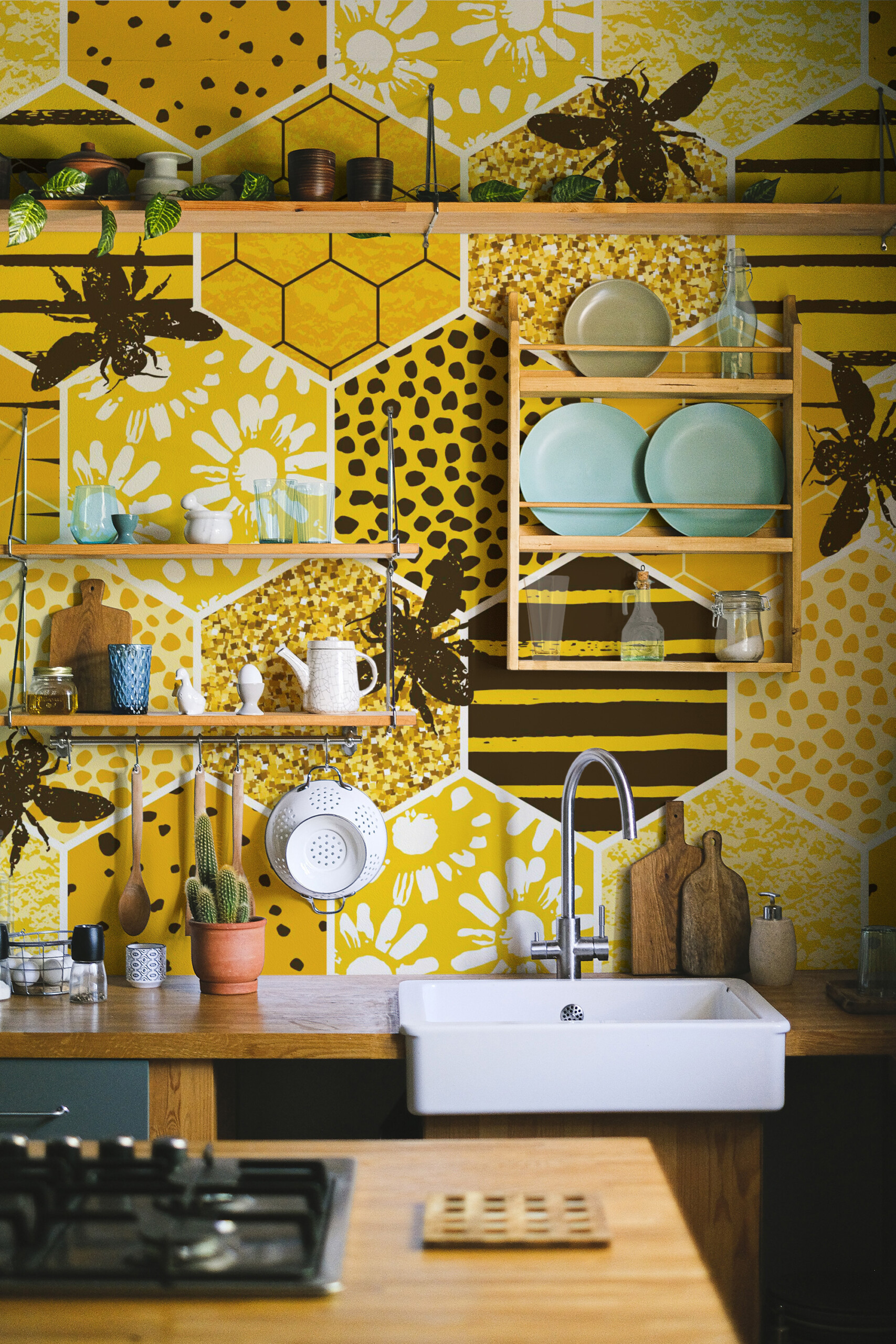 Sunny Honeycomb Meadow wall mural features a vibrant mix of hexagonal tiles filled with playful bee motifs, floral elements, and textured patterns in warm golden yellow tones, creating a cheerful geometric composition with a light boho character. The combination of organic shapes and layered details brings a lively rhythm while adding a subtle faux textured effect that enhances depth and visual interest.