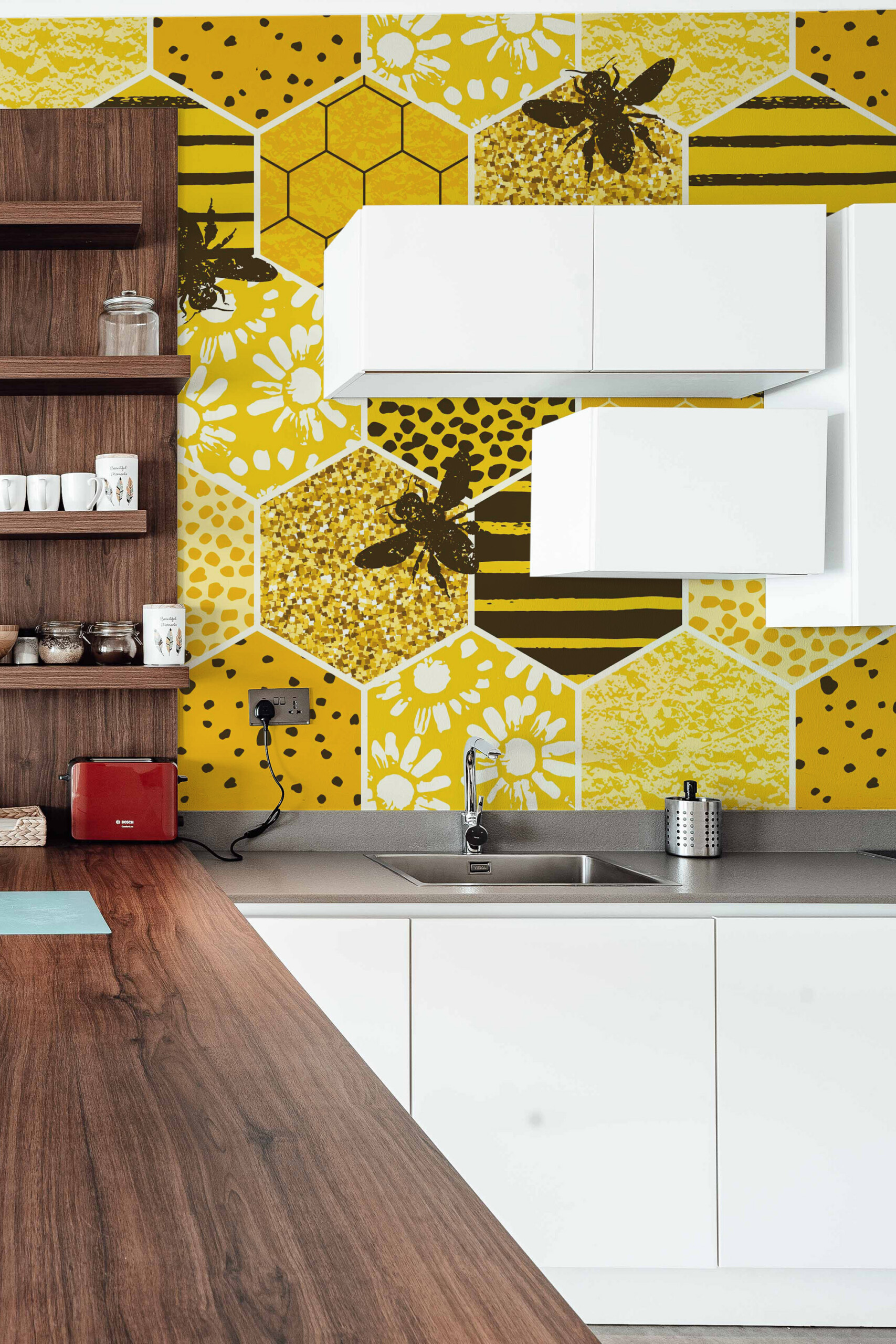 Sunny Honeycomb Meadow peel and stick wall mural installs smoothly as a removable self-adhesive wallpaper ideal for quick décor updates, while the traditional non-pasted option offers a classic installation for long-lasting interiors, and Golden Bee Garden mural is perfect for kitchens & dining rooms, bringing a bright, fresh, and uplifting atmosphere inspired by sunny meadow vibes.Wall Mural Highlights