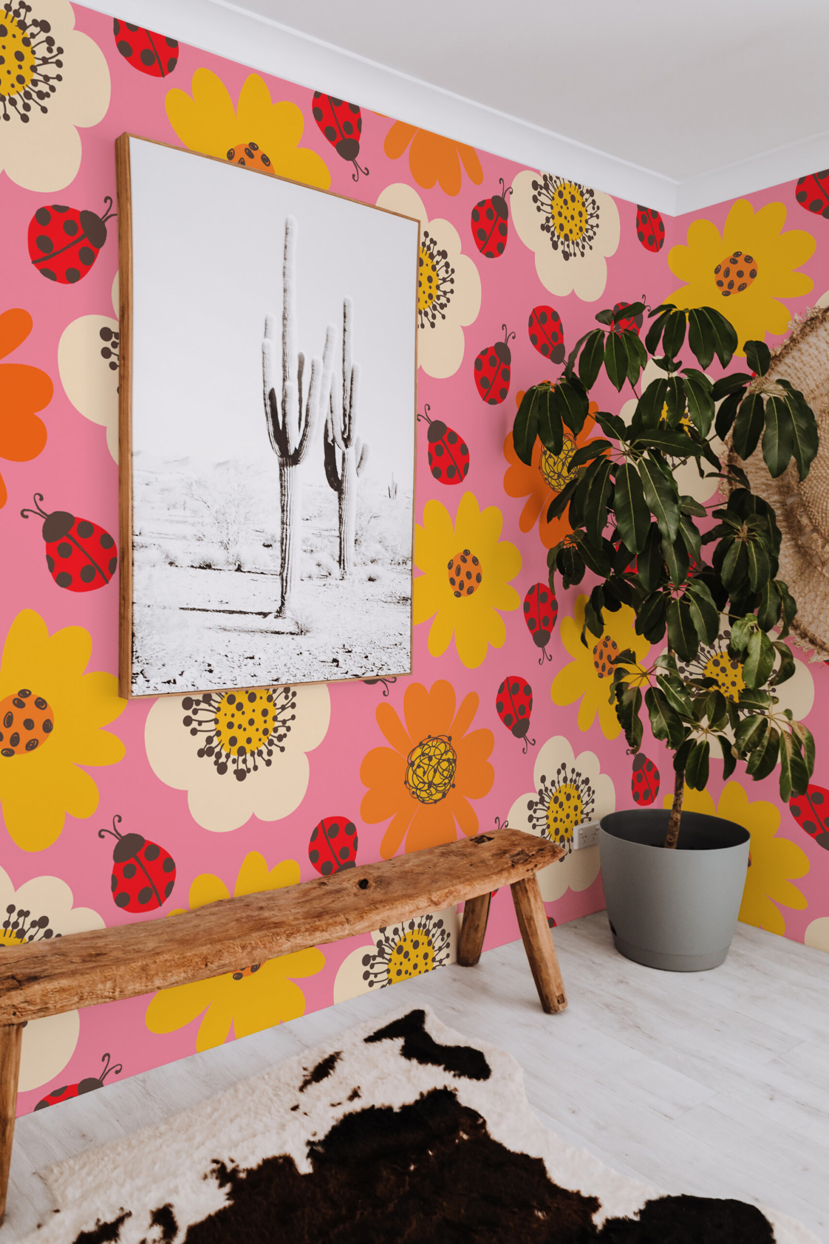 Sunny Ladybug Flowers peel and stick wall mural installs smoothly as a removable self-adhesive wallpaper ideal for quick décor updates, while the traditional non-pasted option offers a classic installation for long-lasting interiors, and Retro Ladybug Garden mural adds vibrant personality to playful and vintage-inspired spaces. Printed on eco-friendly, PVC-free materials using GreenGuard Gold certified inks, it ensures safe indoor air quality, crisp botanical detail, and durable long-lasting color.Wall Mural Highlights