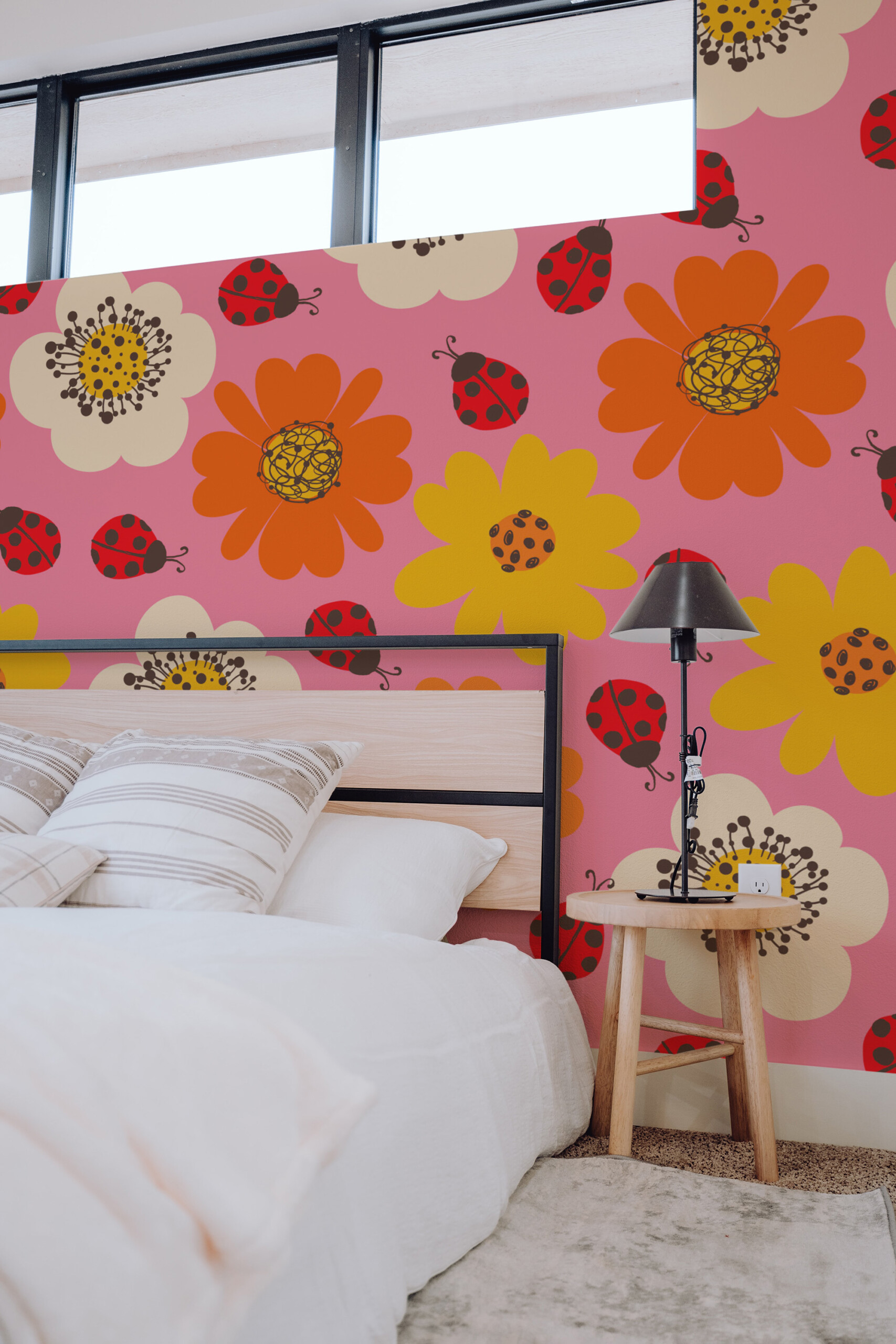 Sunny Ladybug Flowers wall mural features cheerful red ladybugs crawling among bright retro-style blossoms in warm yellow, orange, and cream tones, creating a playful floral meadow pattern that brings joyful color and lively garden charm to nurseries, kids rooms, playrooms, and cheerful interiors inspired by sunny springtime nature.