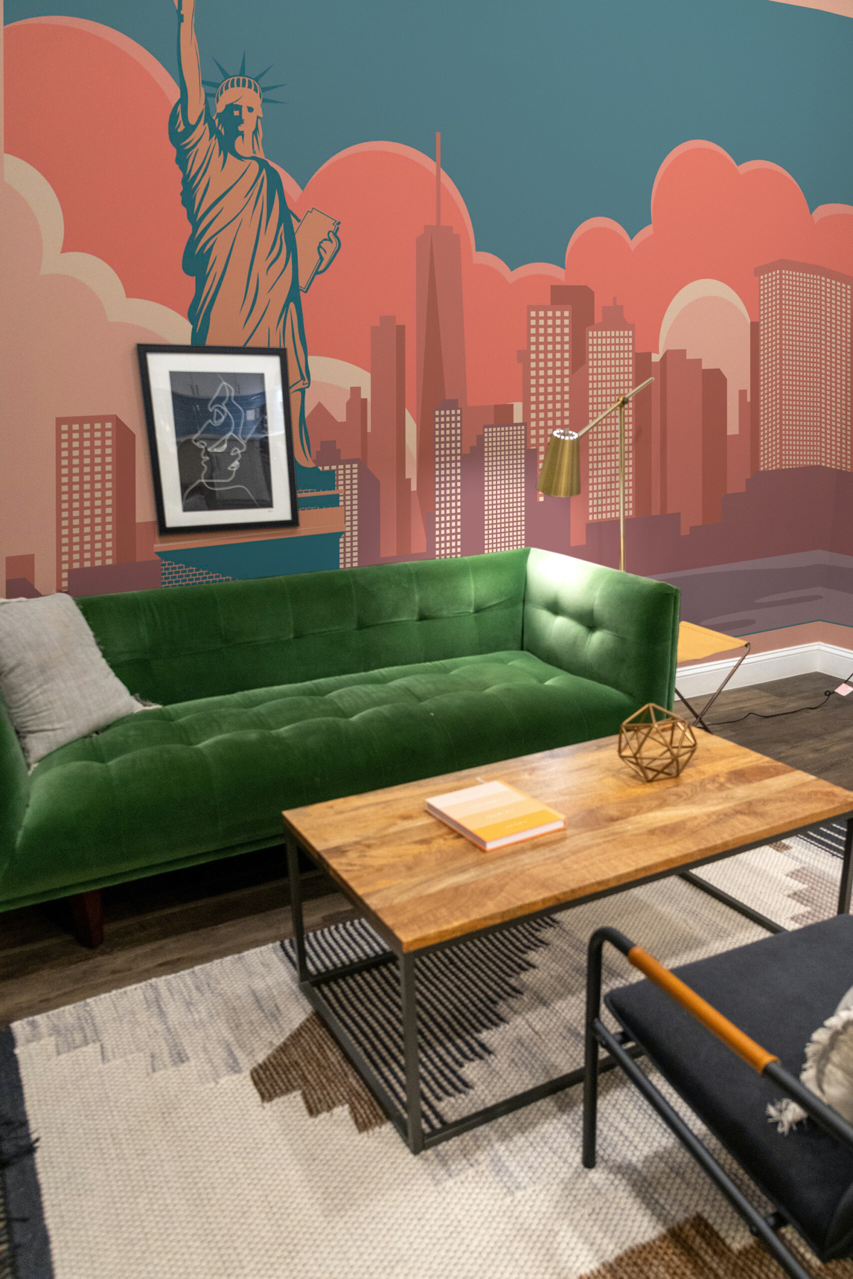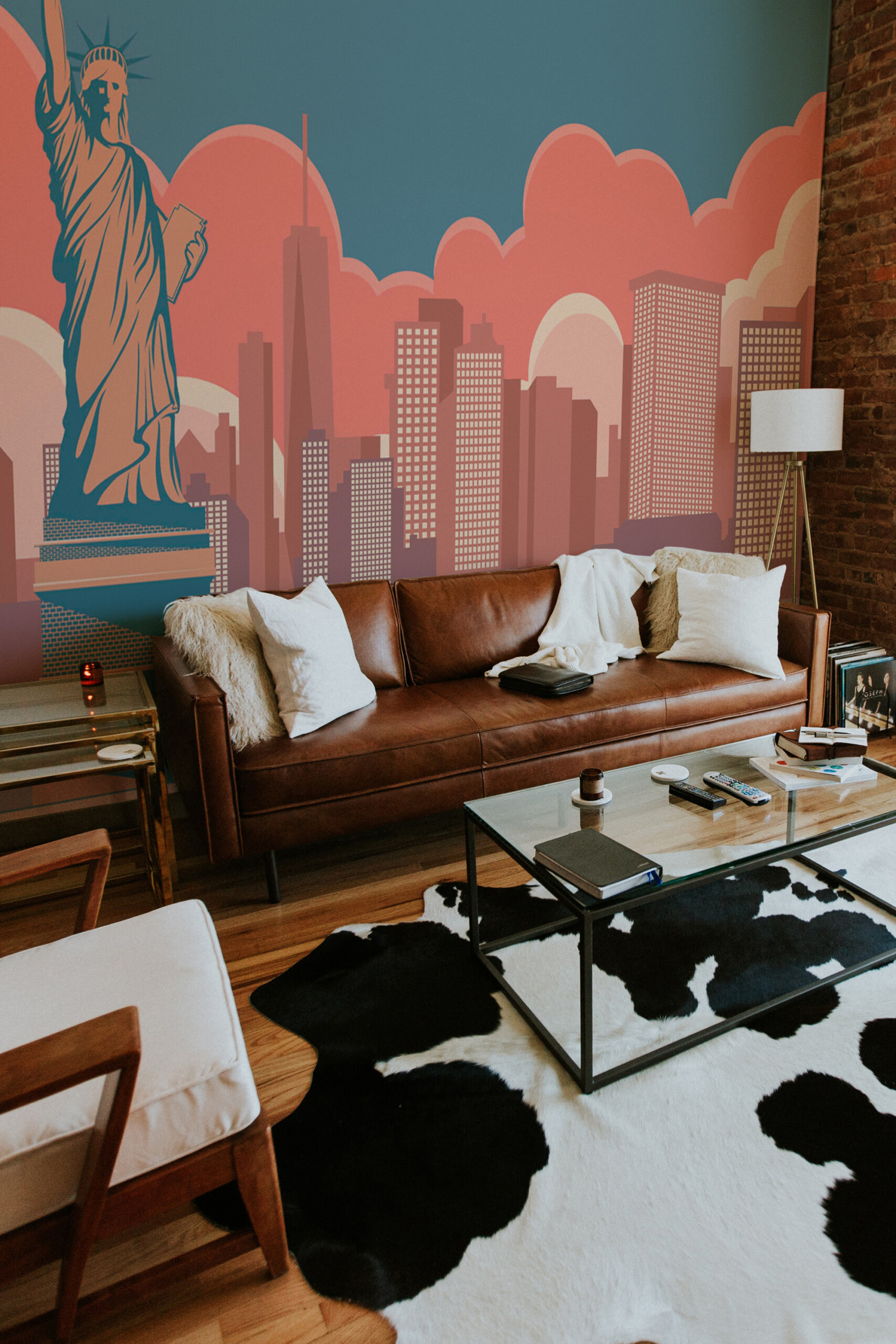 Terracotta Manhattan wall mural brings a warm modern touch to living rooms, studios, or creative workspaces with its terracotta skyline, stylized clouds, and bold pop-art Liberty Statue. The geometric city layout and soft sunset palette create a relaxed atmosphere that feels artistic yet contemporary in any interior.
