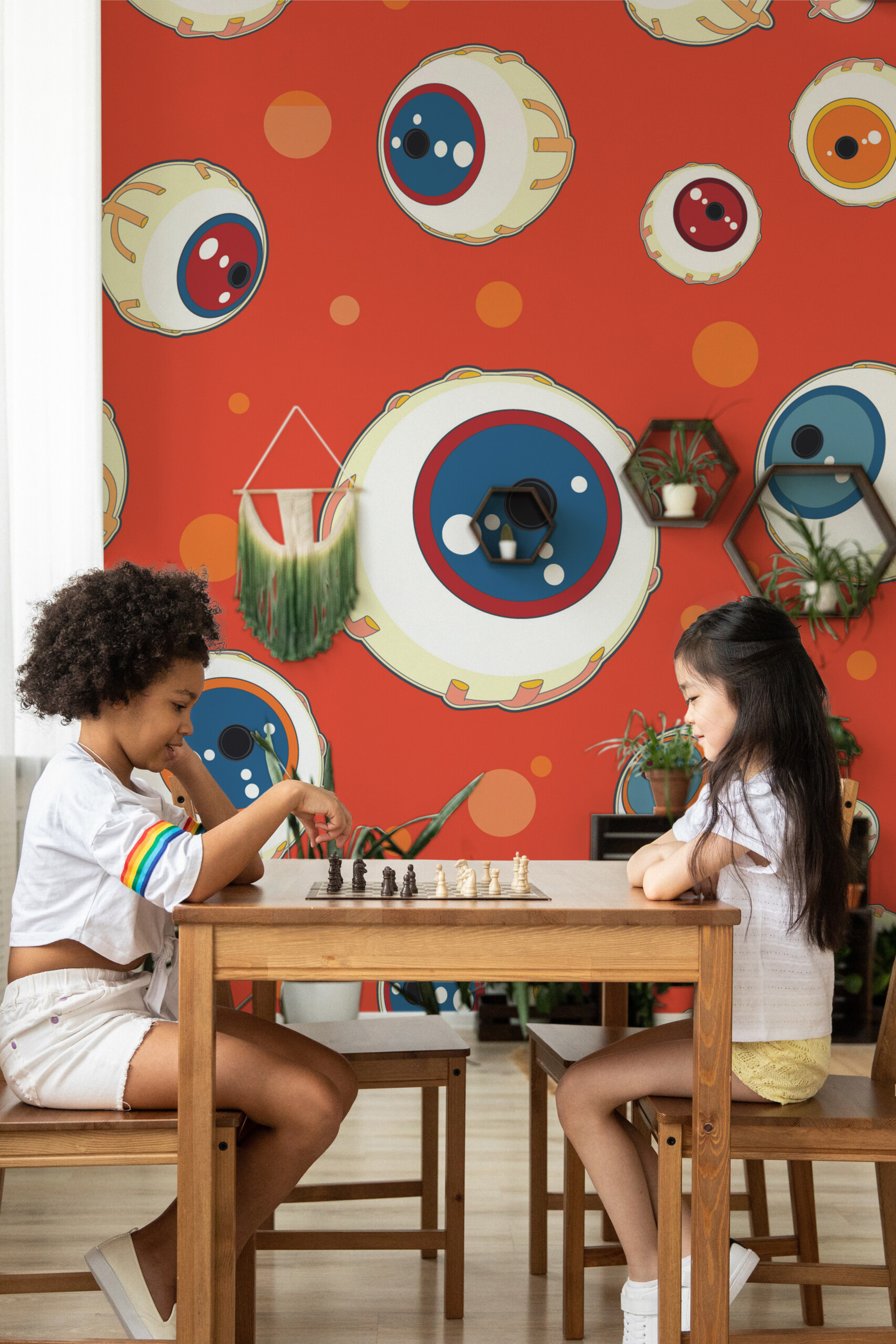 Trick or Treat Eyes wall mural brings a playful Halloween twist to your interior with its vibrant orange background and cheerful cartoon eyeballs scattered across the design. The fun and whimsical pattern adds an instant festive vibe, making it perfect for children’s rooms, party decor, or any creative space that celebrates the spooky season. Creepy Halloween Fun combines humor and bold color for a lighthearted yet eye-catching statement piece.