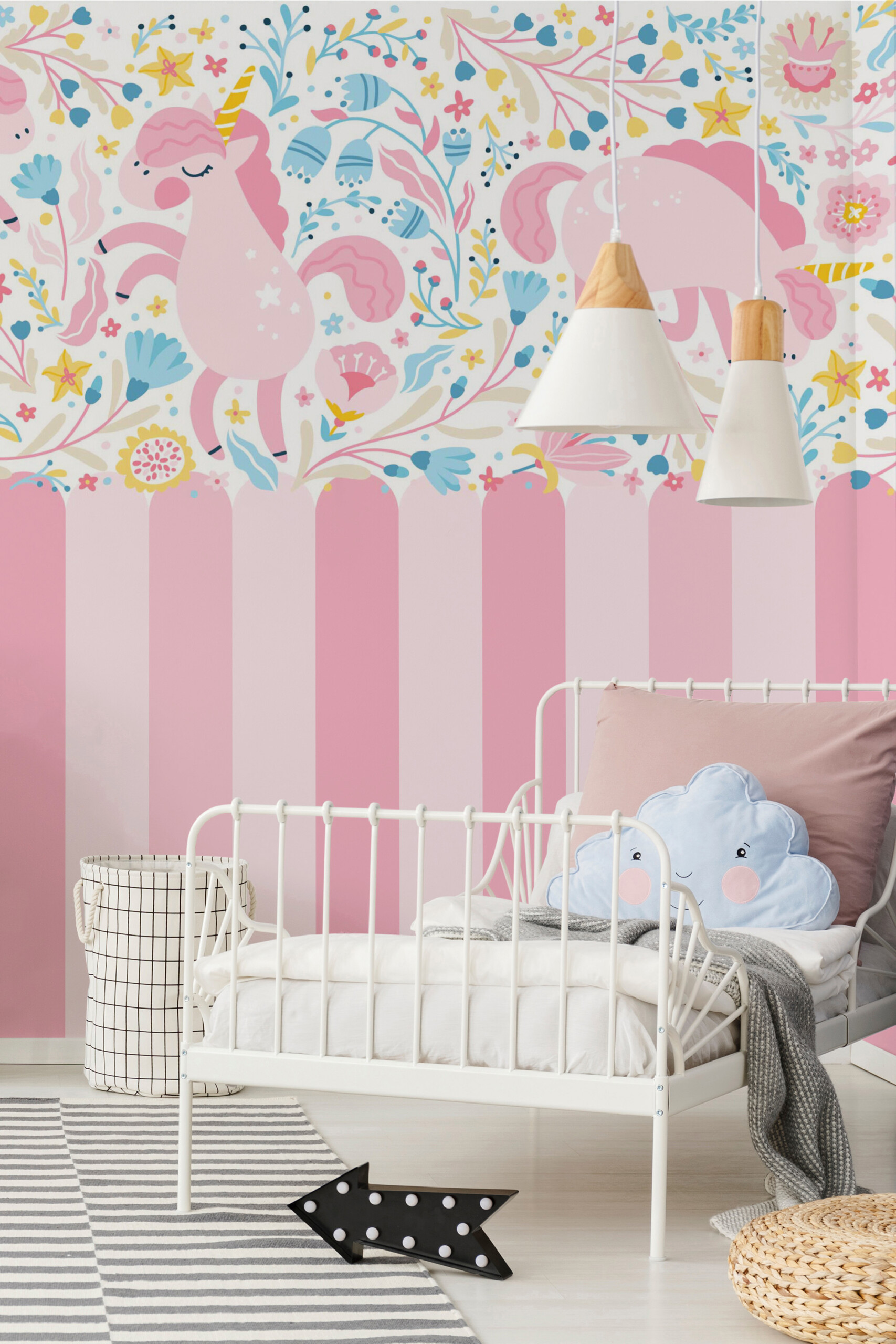 Unicorn Garden wall mural fills your nursery with cheerful pink unicorns dancing among delicate florals and soft pastel hues. The hand-drawn design features blooming flowers, candy-pink stripes, and whimsical details that create a magical, storybook atmosphere. Shades of blush, blue, and yellow bring warmth and playful brightness, making it ideal for kids’ bedrooms or play areas.