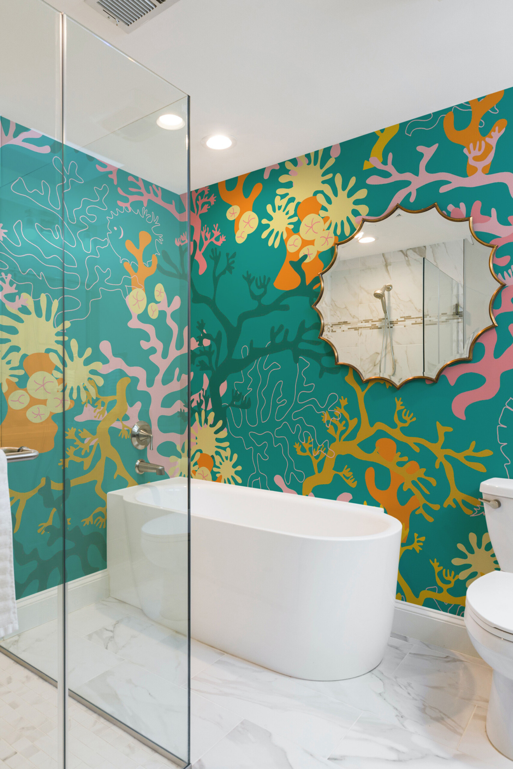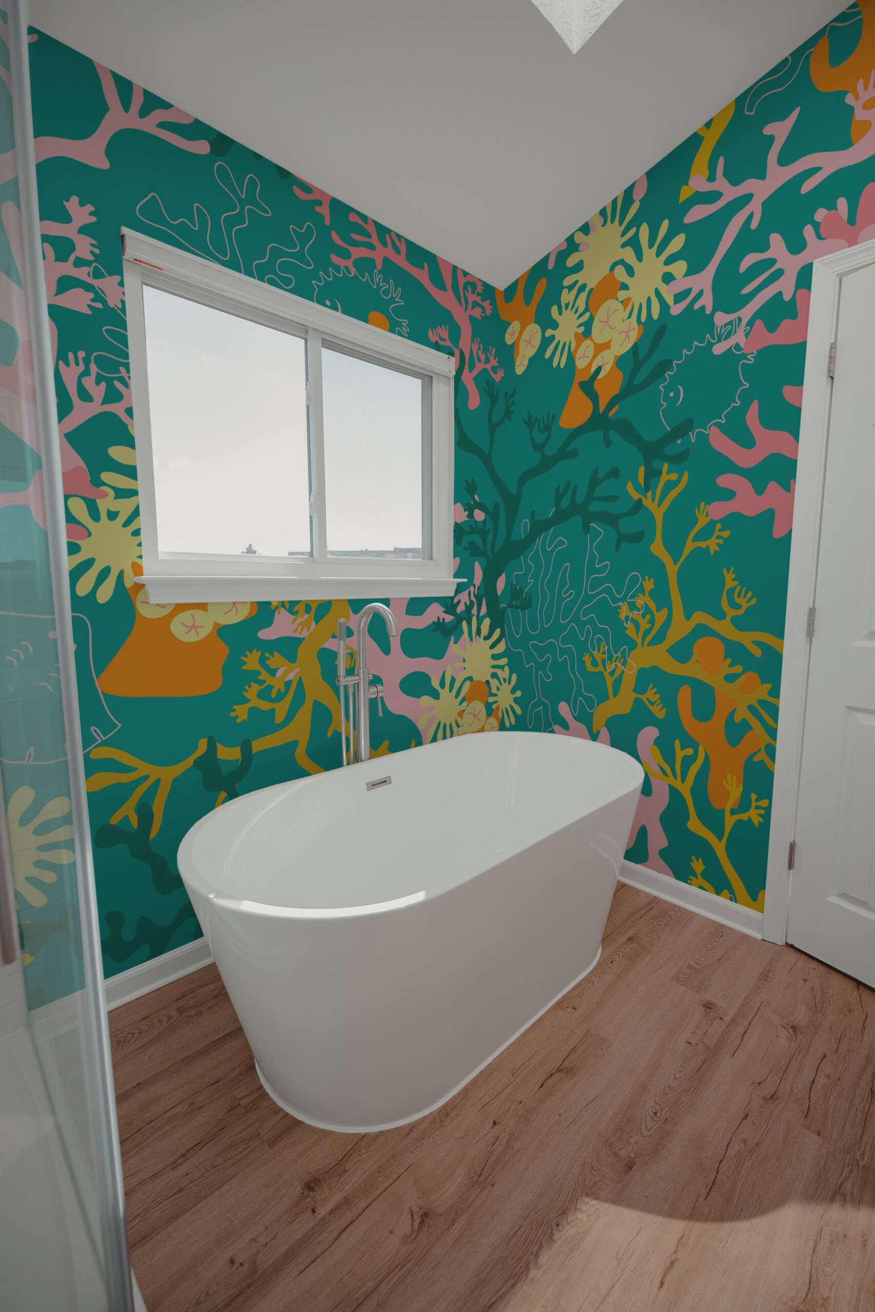Vibrant Coral Symphony wall mural celebrates the playful beauty of marine life through bold, abstract coral forms and vivid underwater hues. The mix of pink, orange, yellow, and teal seaweed-inspired shapes creates an energetic, tropical aesthetic perfect for bathrooms, kids’ rooms, or creative interiors in need of a cheerful touch.