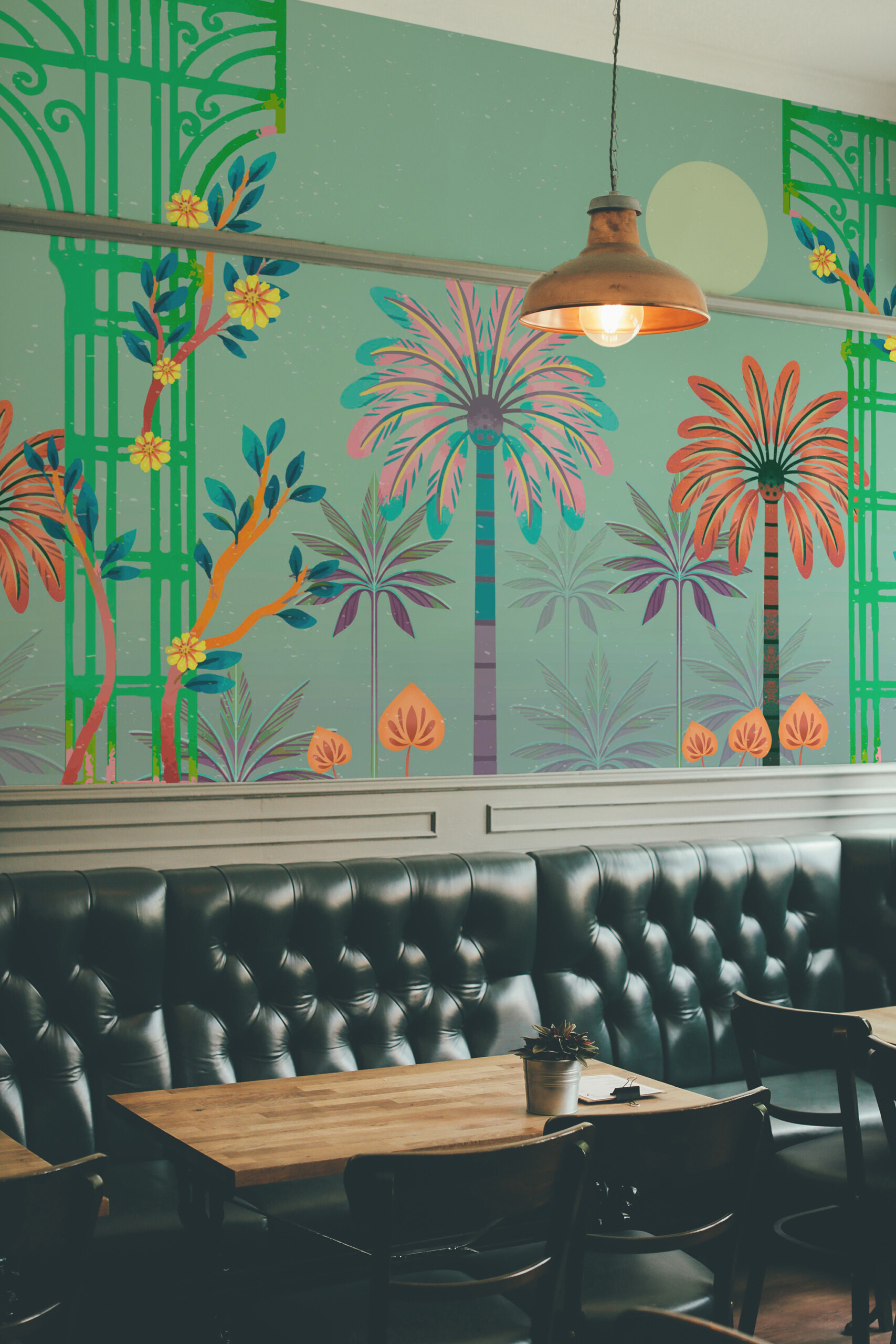 Vibrant Palm Oasis peel and stick wall mural installs smoothly as a removable, self-adhesive wallpaper, while a traditional non-pasted option is also available for classic application. Tropical Night wallpaper mural adds personality and warmth to modern or retro-inspired spaces. Printed on eco-friendly, PVC-free materials using GreenGuard Gold certified inks, it ensures safe indoor air quality and long-lasting color.Wall Mural Highlights