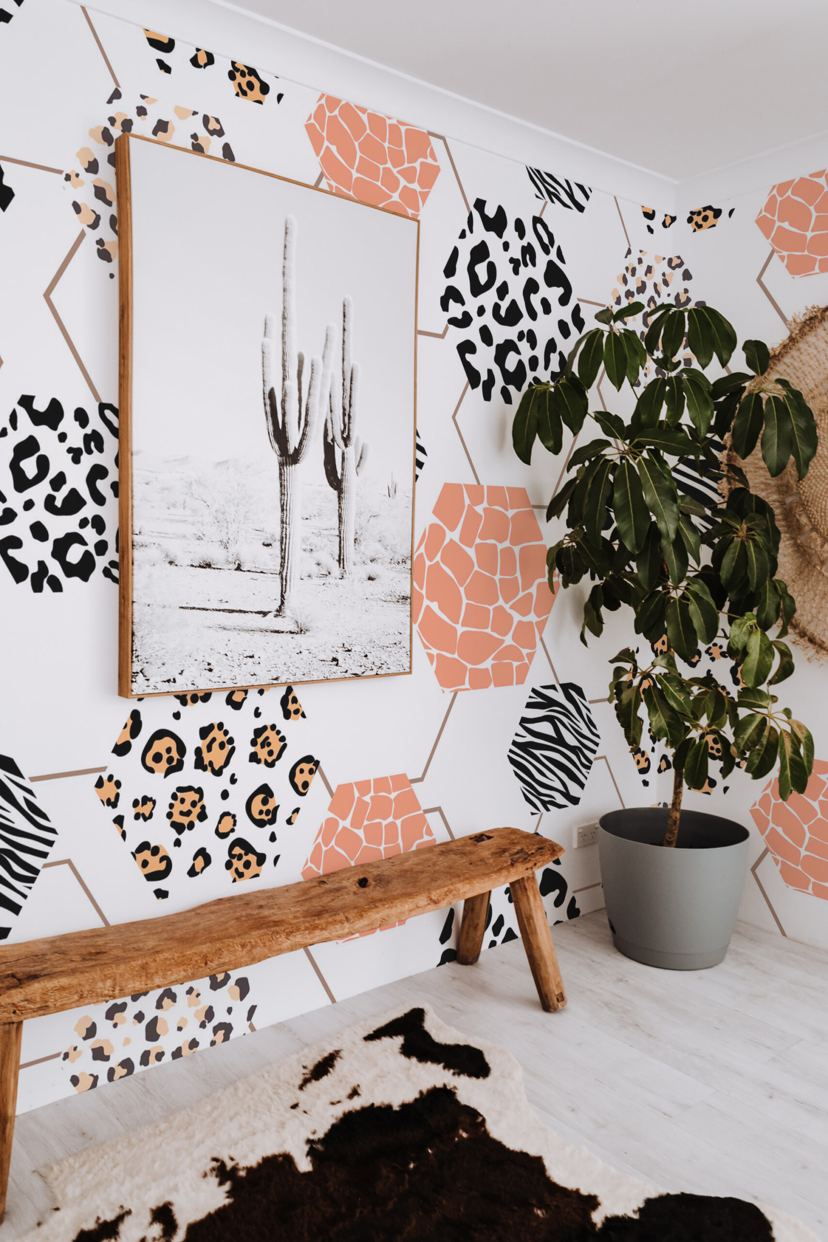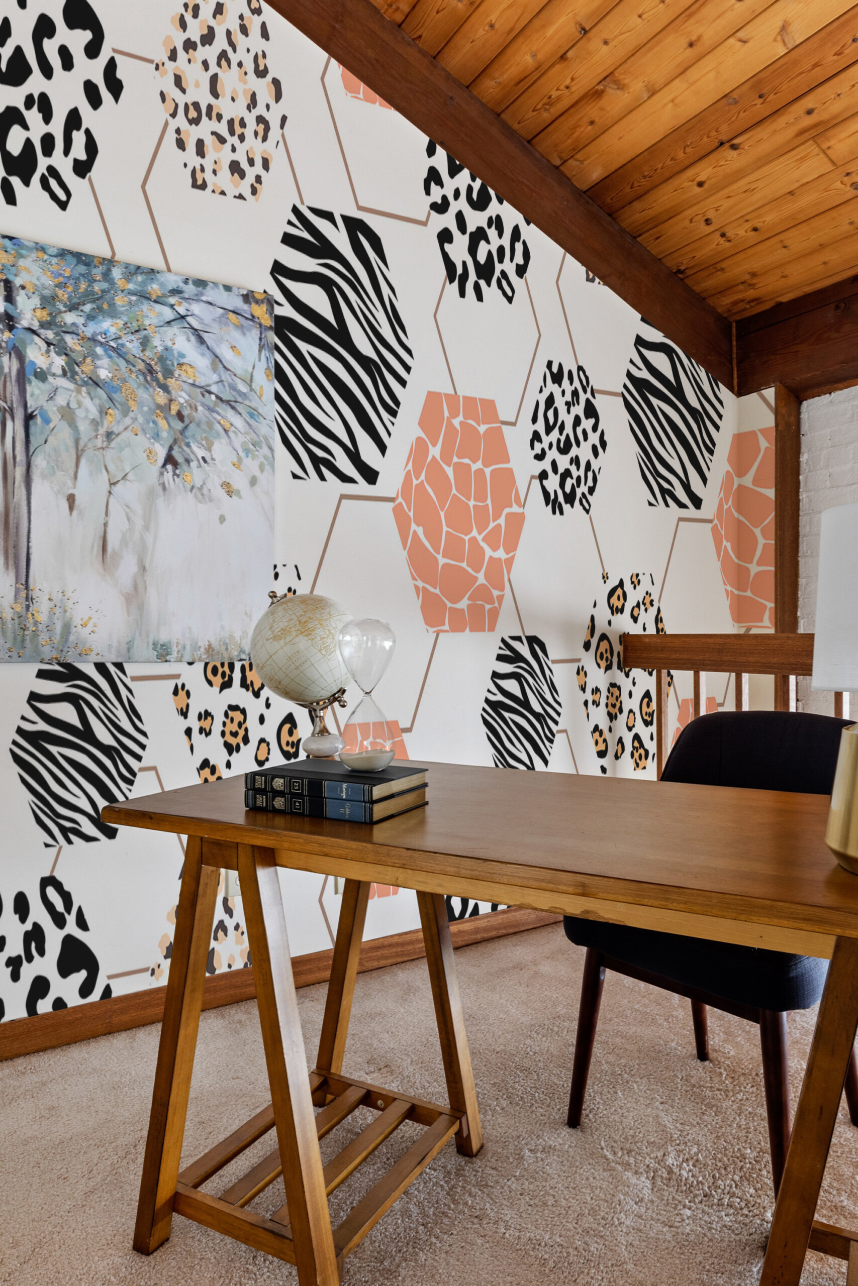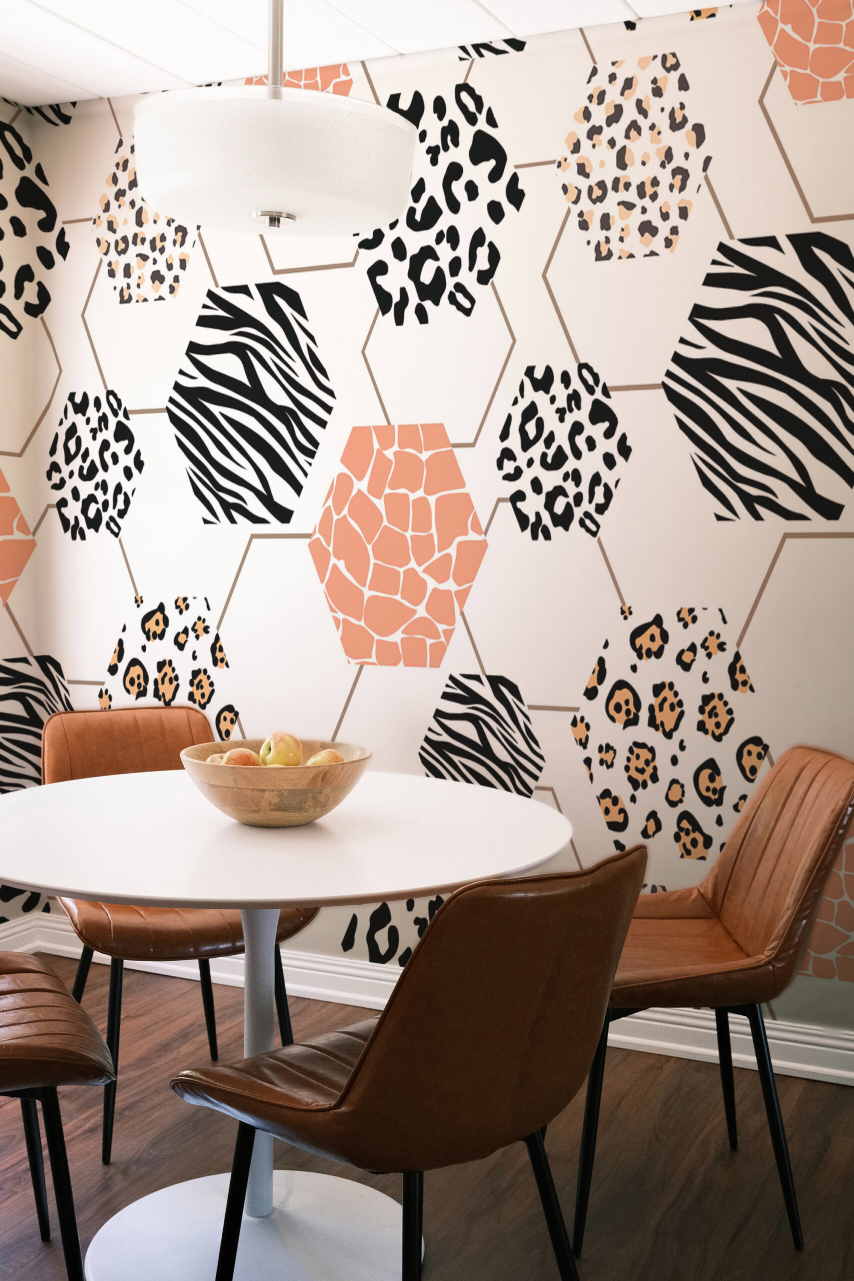 Wild Safari Hexagon peel and stick wall mural installs smoothly as a removable self-adhesive wallpaper ideal for quick décor updates, while the traditional non-pasted option offers a classic installation for long-lasting interiors, and Animal Print Honeycomb mural adds bold personality to living rooms and modern interiors, creating a stylish, graphic, and contemporary atmosphere.Wall Mural Highlights