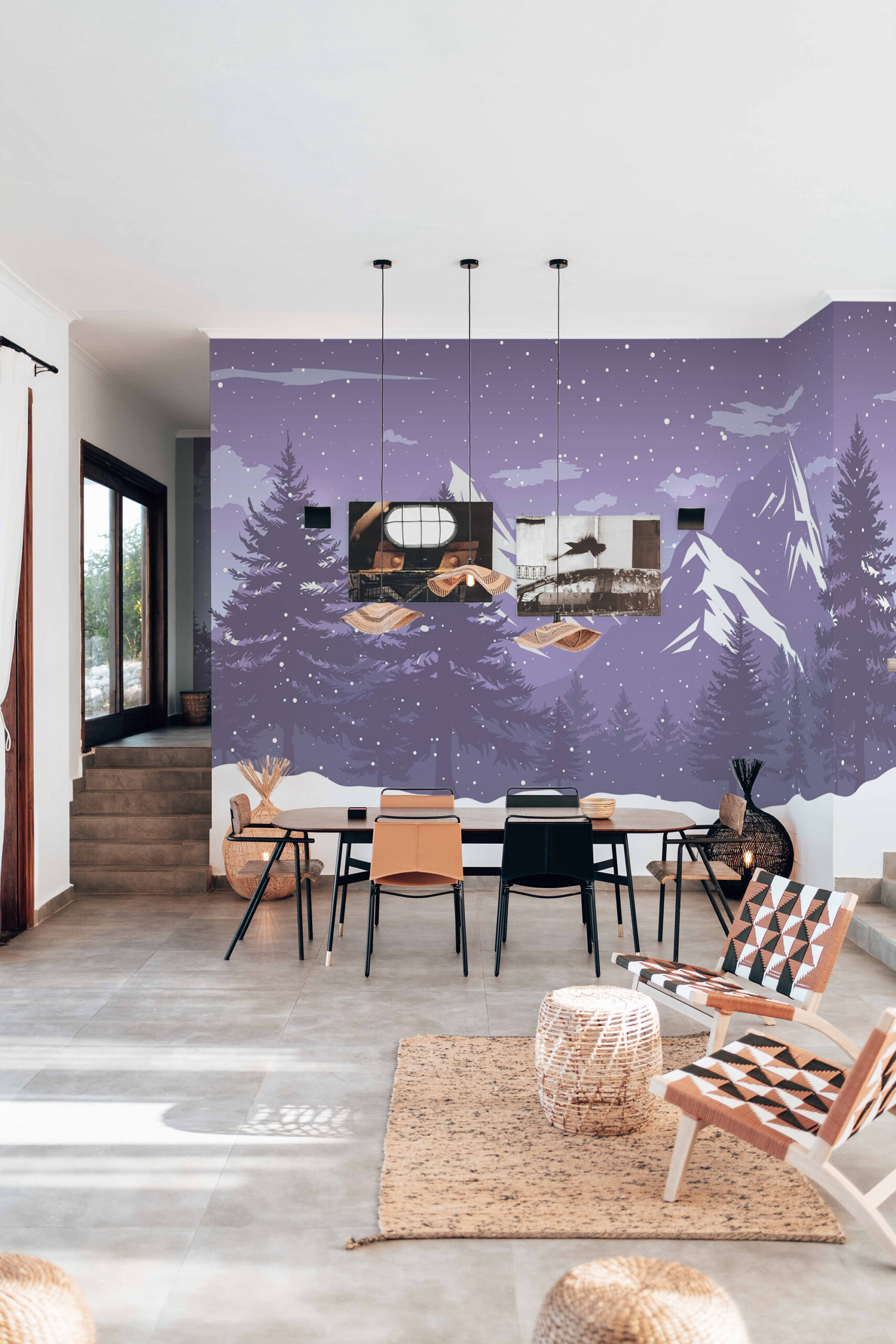 This Winter Calmy Forest peel and stick wall mural installs effortlessly, offering a renter-friendly way to refresh your décor with a calm seasonal touch. This purple winter mountain wall mural blends cool tones with minimalist shapes, creating a serene focal point for modern or eclectic interiors. Printed on eco-friendly, PVC-free materials using GreenGuard Certified inks, this removable, self-adhesive wallpaper is safe for indoor use and ideal for long-term decorating.Wall Mural Highlights